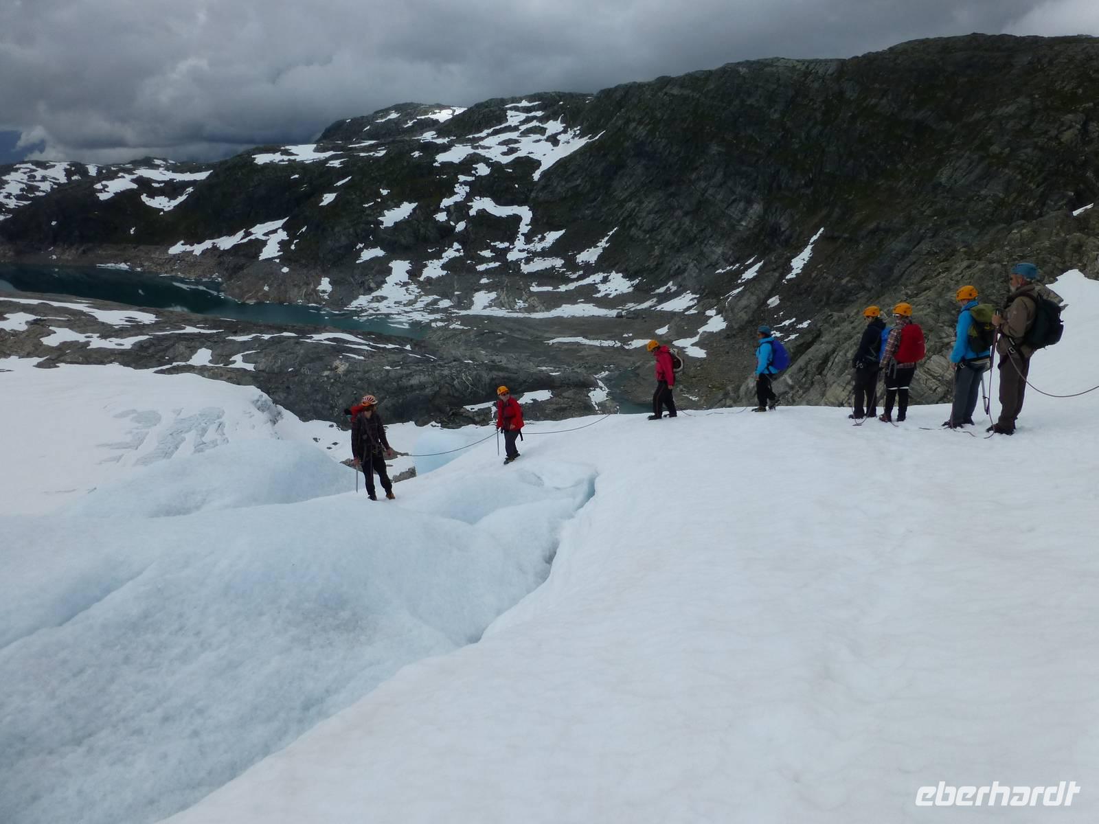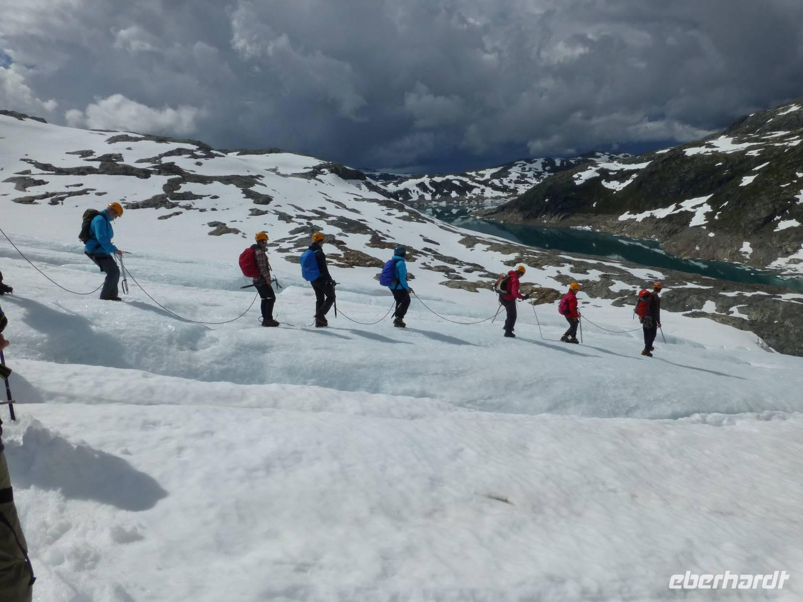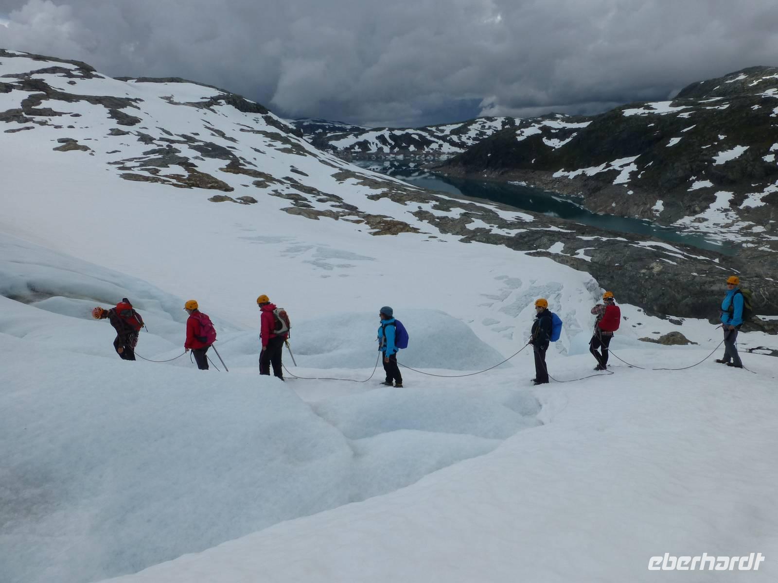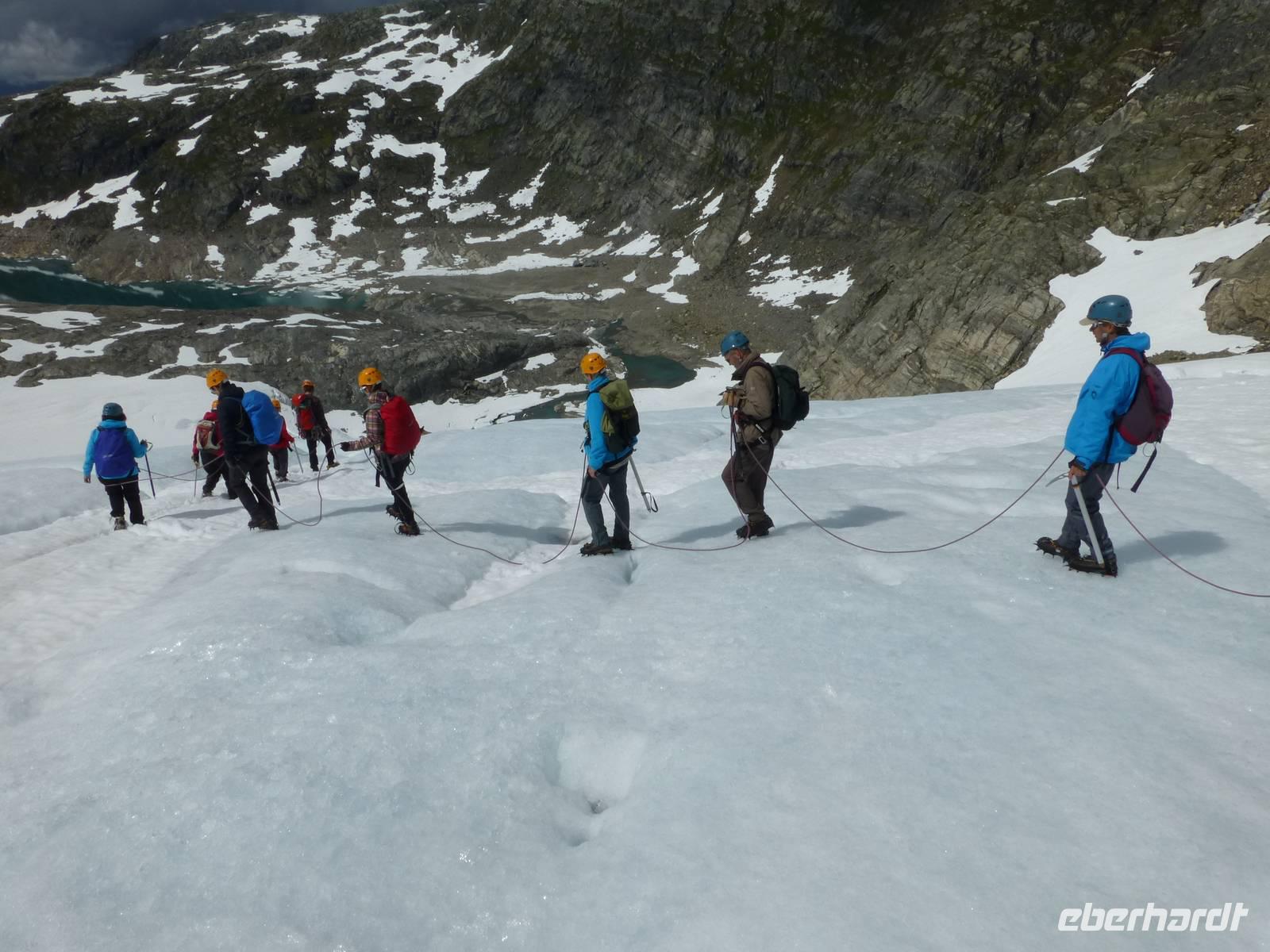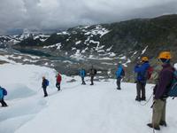 Am Morgen ist wieder blauer Himmel, kaum eine Wolke ist zu sehen. Heute gibt es die fakultative Möglichkeit zu einer Gletscherwanderung auf Norwegens drittgrößtem Gletscher, dem Folgefonna. Und so macht sich ein Teil der Gruppe am Morgen auf nach Jondal. Die im Hotel bleibenden Gäste haben einen Tag zur freien Verfügung, welcher sich in Kinsarvik ohne Probleme verbringen lässt. Von Jondal sind es noch 19 km bis zum Folgefonna Sommerskicenter. Allein die Fahrt da hinauf ist ein Erlebnis. Nach Ankunft werden wir von unserem Gletscherführer Øven empfangen. Wir werden eingekleidet und natürlich in die Tour eingewiesen. Zuerst haben wir 200 Höhenmeter zu überwinden. Wir starten unsere Tour ins Winterwunderland mitten im Sommer und sehen gleichzeitig eine ganze Menge Menschen die hier zum sommerlichen Skifahren sind. Nachdem wir eine Höhe von 1400 m erreicht haben steigen wir zum eigentlichen Gletscher ab. Zuerst aber müssen die Steigeisen angelegt und eine Seilschaft gebildet werden. Dann laufen wir tatsächlich über den Gletscher, vorbei an großen Gletscherspalten. Wir drehen eine Runde über das Eis, das an machen Stellen eine blaue Farbe hat. Øven erklärt uns, das dies mit dem Lichteinfall der Sonne zu tun hat und der gleiche Effekt auch beim Meerwasser auftritt. In der Nähe zieht ein Gewitter auf und wir verlassen wir den Gletscher wieder. Noch einmal heißt es aufsteigen um dann wieder zum Sommerskicenter zurück zu kehren. Inzwischen ist hier kein Betrieb mehr. Wir sind geschafft und froh, es war ein Erlebnis. Der Weg zurück führt uns durch den Jondaltunnel und den Folgefonnatunnel, beide über 10 km lang, nach Odda und dann weiter nach Kinsarvik zu unserem Hotel.