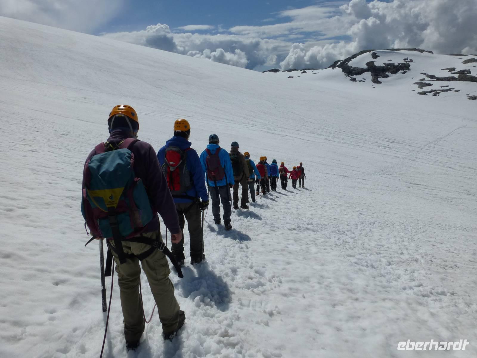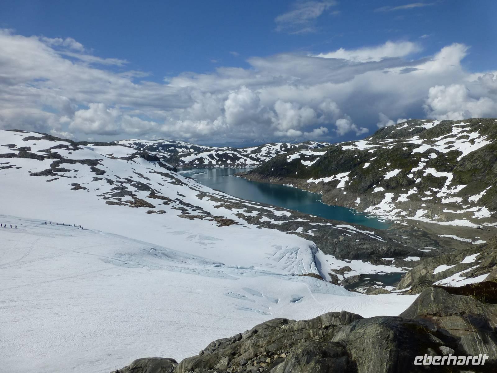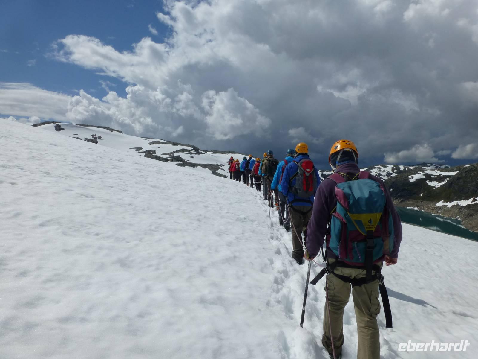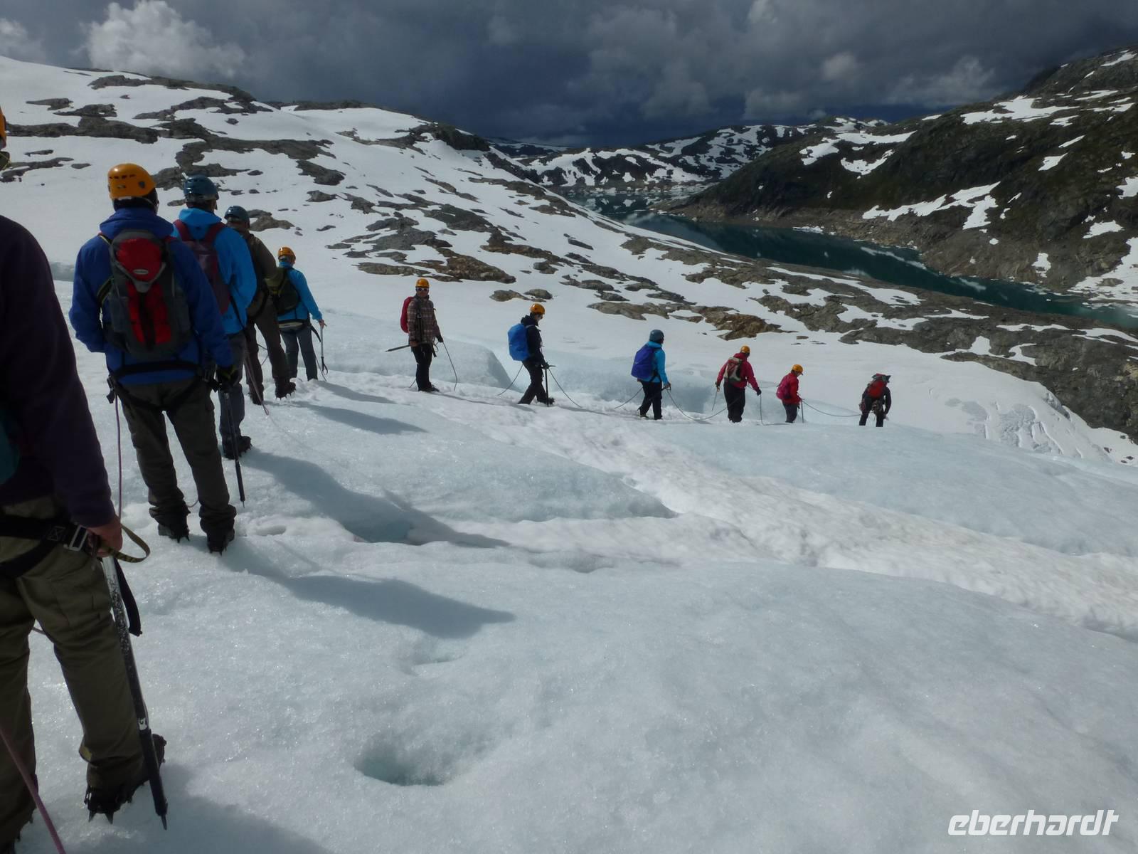 Am Morgen ist wieder blauer Himmel, kaum eine Wolke ist zu sehen. Heute gibt es die fakultative Möglichkeit zu einer Gletscherwanderung auf Norwegens drittgrößtem Gletscher, dem Folgefonna. Und so macht sich ein Teil der Gruppe am Morgen auf nach Jondal. Die im Hotel bleibenden Gäste haben einen Tag zur freien Verfügung, welcher sich in Kinsarvik ohne Probleme verbringen lässt. Von Jondal sind es noch 19 km bis zum Folgefonna Sommerskicenter. Allein die Fahrt da hinauf ist ein Erlebnis. Nach Ankunft werden wir von unserem Gletscherführer Øven empfangen. Wir werden eingekleidet und natürlich in die Tour eingewiesen. Zuerst haben wir 200 Höhenmeter zu überwinden. Wir starten unsere Tour ins Winterwunderland mitten im Sommer und sehen gleichzeitig eine ganze Menge Menschen die hier zum sommerlichen Skifahren sind. Nachdem wir eine Höhe von 1400 m erreicht haben steigen wir zum eigentlichen Gletscher ab. Zuerst aber müssen die Steigeisen angelegt und eine Seilschaft gebildet werden. Dann laufen wir tatsächlich über den Gletscher, vorbei an großen Gletscherspalten. Wir drehen eine Runde über das Eis, das an machen Stellen eine blaue Farbe hat. Øven erklärt uns, das dies mit dem Lichteinfall der Sonne zu tun hat und der gleiche Effekt auch beim Meerwasser auftritt. In der Nähe zieht ein Gewitter auf und wir verlassen wir den Gletscher wieder. Noch einmal heißt es aufsteigen um dann wieder zum Sommerskicenter zurück zu kehren. Inzwischen ist hier kein Betrieb mehr. Wir sind geschafft und froh, es war ein Erlebnis. Der Weg zurück führt uns durch den Jondaltunnel und den Folgefonnatunnel, beide über 10 km lang, nach Odda und dann weiter nach Kinsarvik zu unserem Hotel.