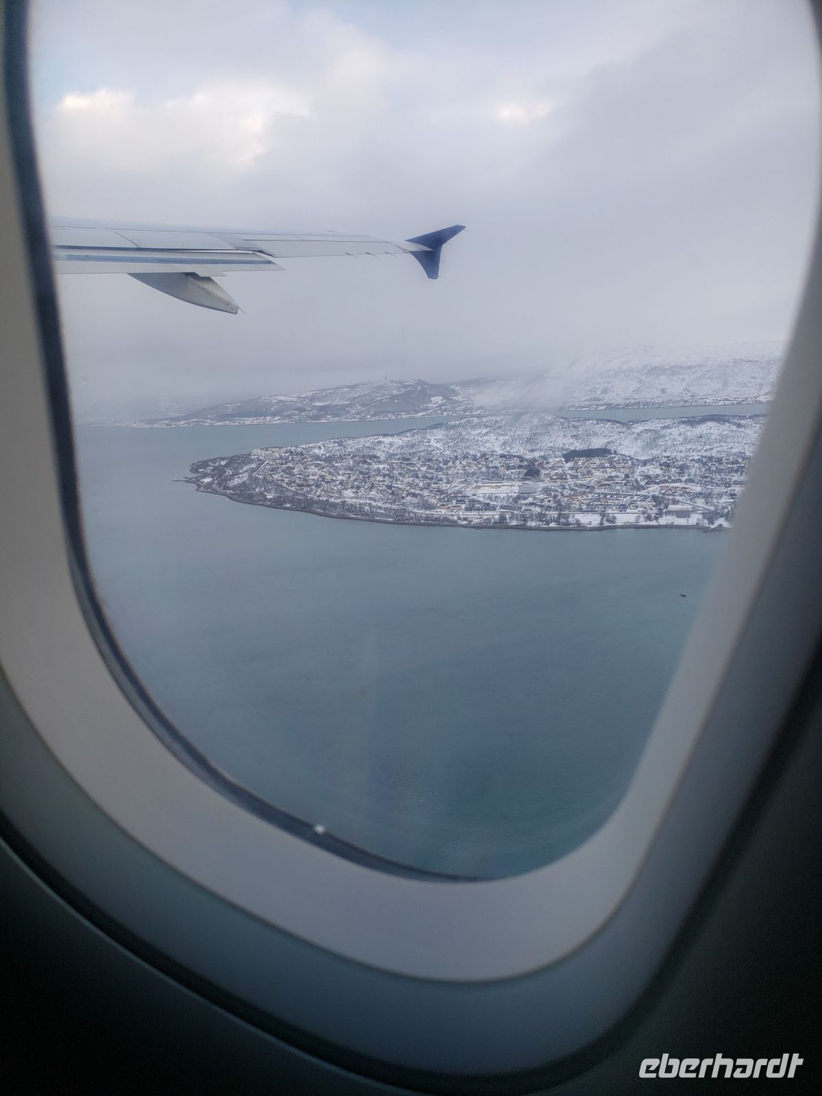 Es ist sehr stürmisch in Tromso, unser Pilot der SundAir, Kapitän Sund, lässt uns über die Durchsage wissen, dass er sein Bestes tun wird, um das Flugzeug gut runter zu bekommen, aber er noch nicht genau weiss, wie er das hinbekommt. Am Ende ist es doch eine sehr gute und pünktliche Landung, erleichtert setzt tosender Applaus ein.