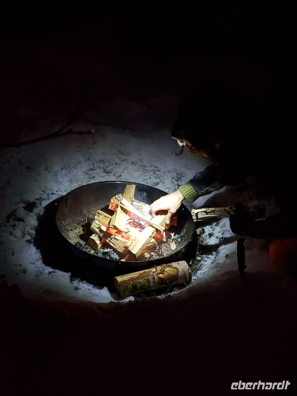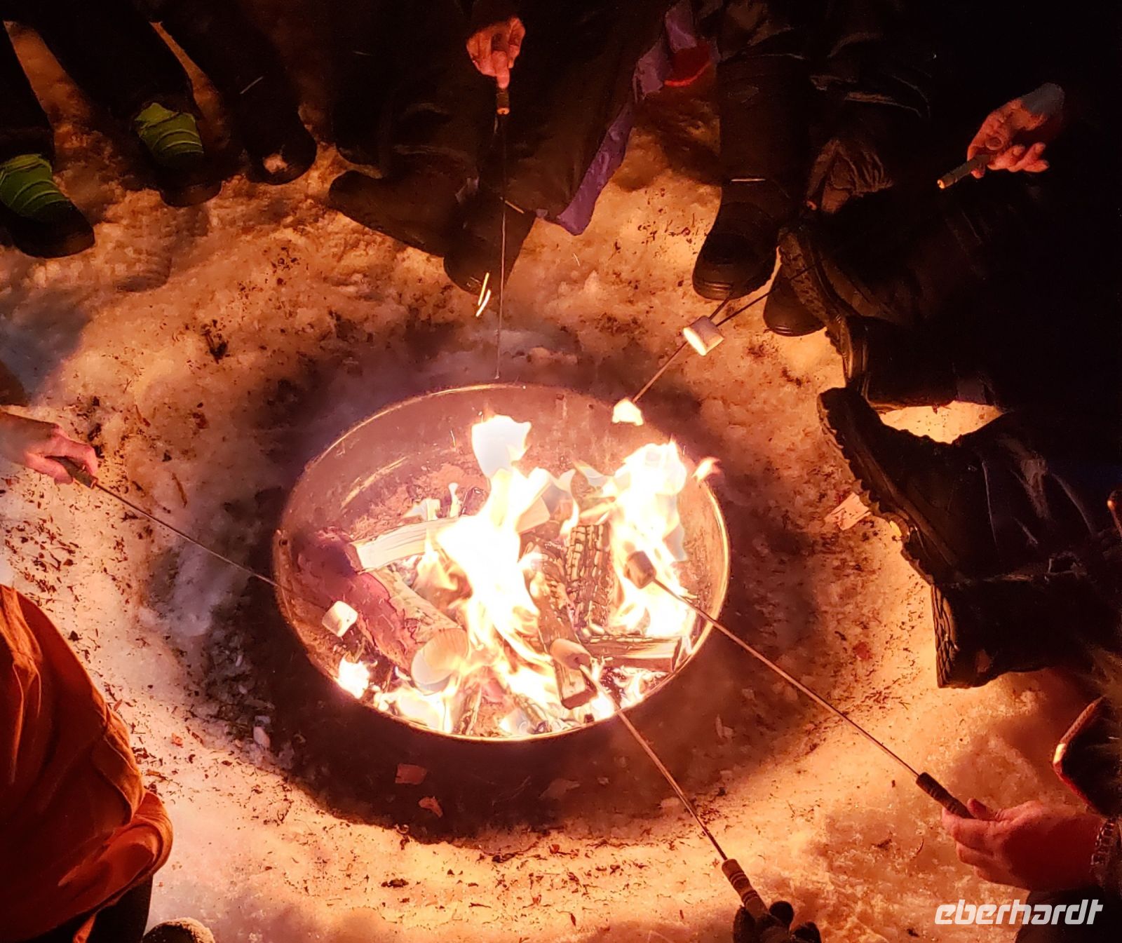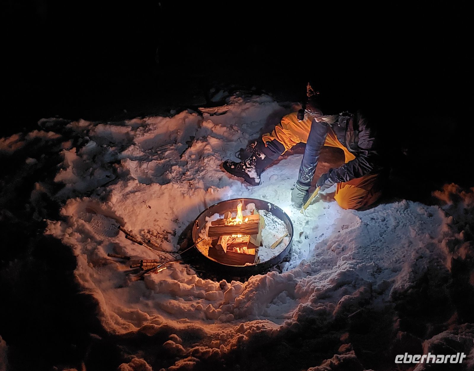 Nach dem Abendessen steht dann für die Hälfte unserer Gruppe eine Schneeschuhwanderung an. Die Overalls und Schuhe, die uns vom Resort zur Verfügung gestellt werden, halten uns schön warm und trocken. Anfanges etwas unbeholfen, aber nach kurzer Zeit gut eingelaufen, stapfen wir in der Dunkelheit durch die wunderschöne Winterlandschaft. Wir machen uns ein Lagerfeuer mit selbstgehacktem Holz und sitzen gemütlich in einer Runde bei heissen Getränken und Süßigkeiten. Frisch gestärkt nach dieser Pause geht es wieder zurück und alle fallen müde und zufrieden in ihr Bett.