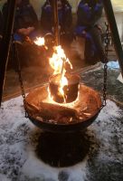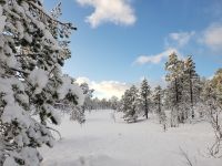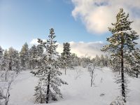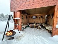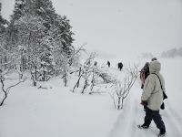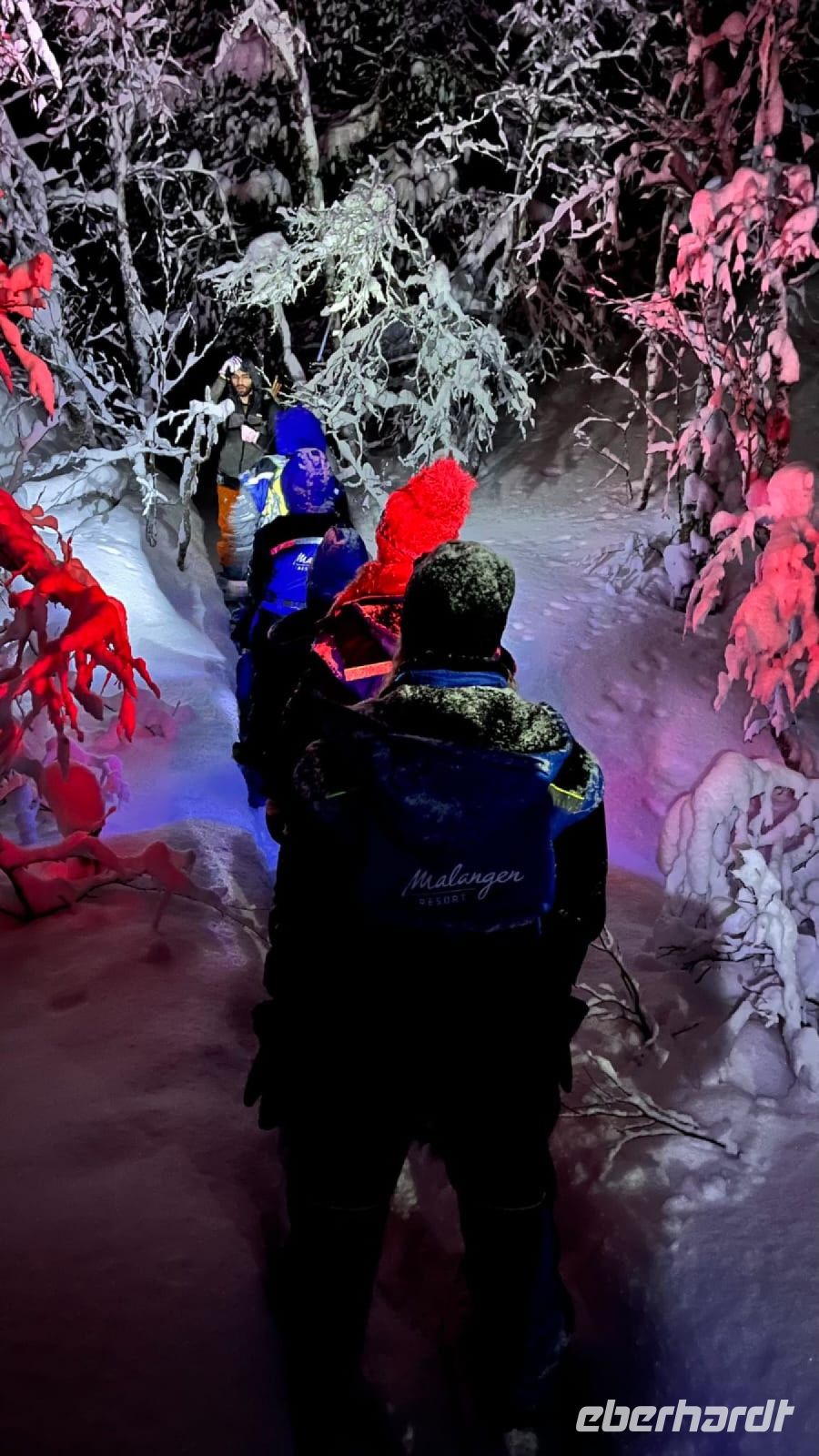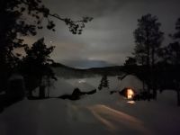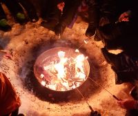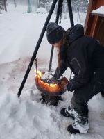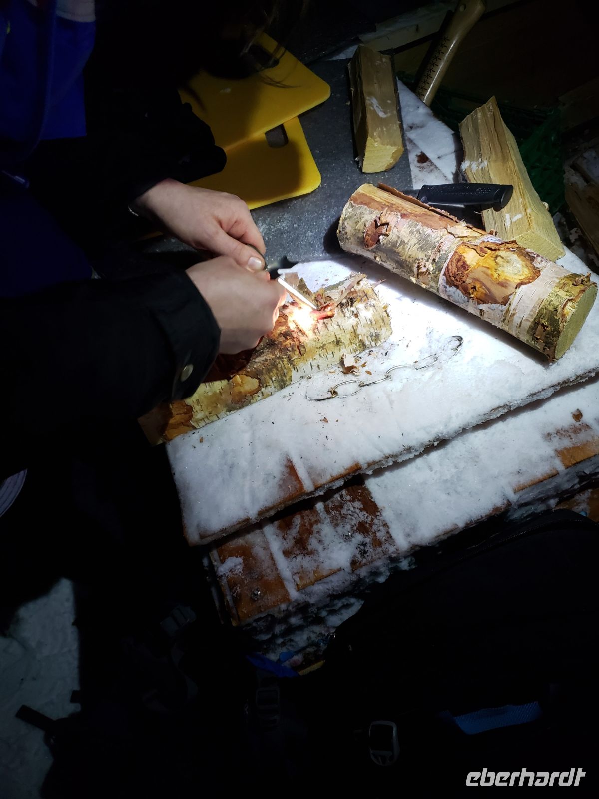 Nach dem Abendessen steht dann für die Hälfte unserer Gruppe eine Schneeschuhwanderung an. Die Overalls und Schuhe, die uns vom Resort zur Verfügung gestellt werden, halten uns schön warm und trocken. Anfanges etwas unbeholfen, aber nach kurzer Zeit gut eingelaufen, stapfen wir in der Dunkelheit durch die wunderschöne Winterlandschaft. Wir machen uns ein Lagerfeuer mit selbstgehacktem Holz und sitzen gemütlich in einer Runde bei heissen Getränken und Süßigkeiten. Frisch gestärkt nach dieser Pause geht es wieder zurück und alle fallen müde und zufrieden in ihr Bett.