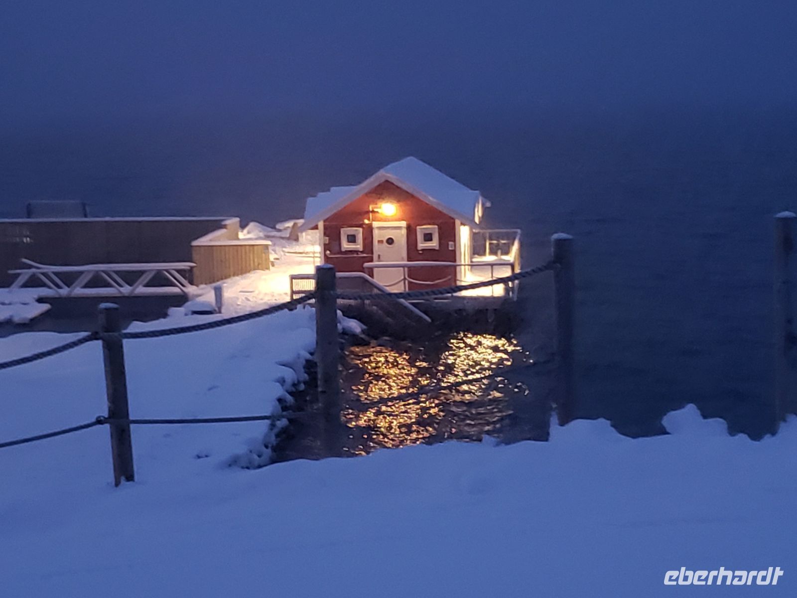 Dann ist auch schon der letzte Abend gekommen. Eigentlich wollten einige unbedingt noch im Jacuzzi am Fjord liegen. Dieses muss jedoch wegen des wieder starken Windes gesperrt werden, aber die Sauna steht uns offen. Zur Abkühlung geht man in den Fjord, manche trauen sich nur mit den Füßen rein, ganz Mutige tauchen einmal kurz bis zum Hals unter.