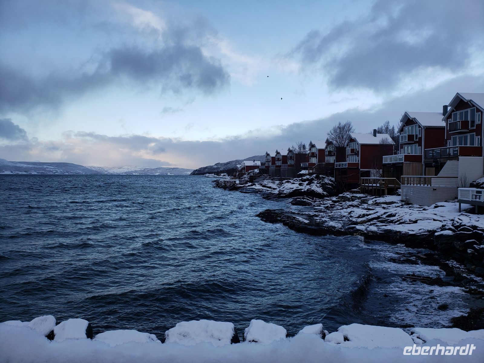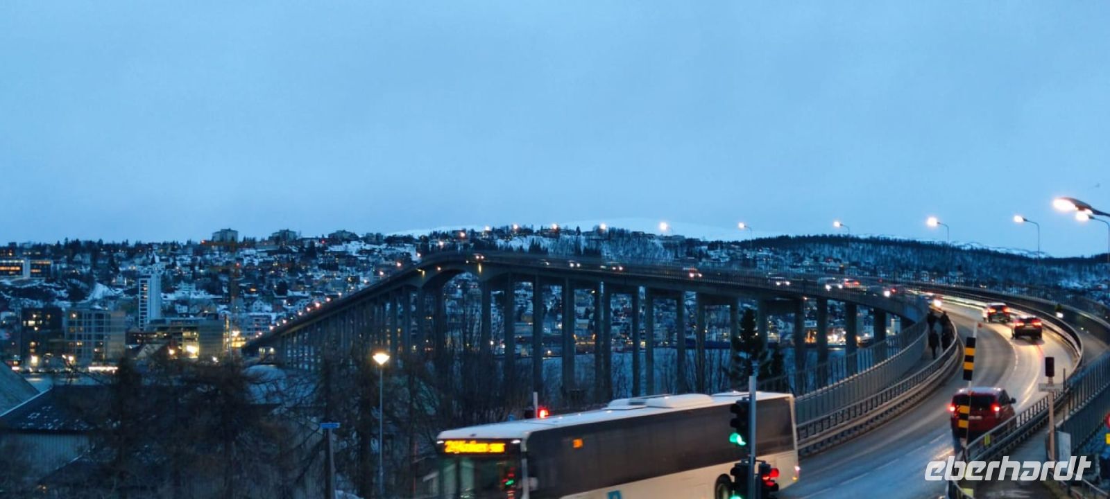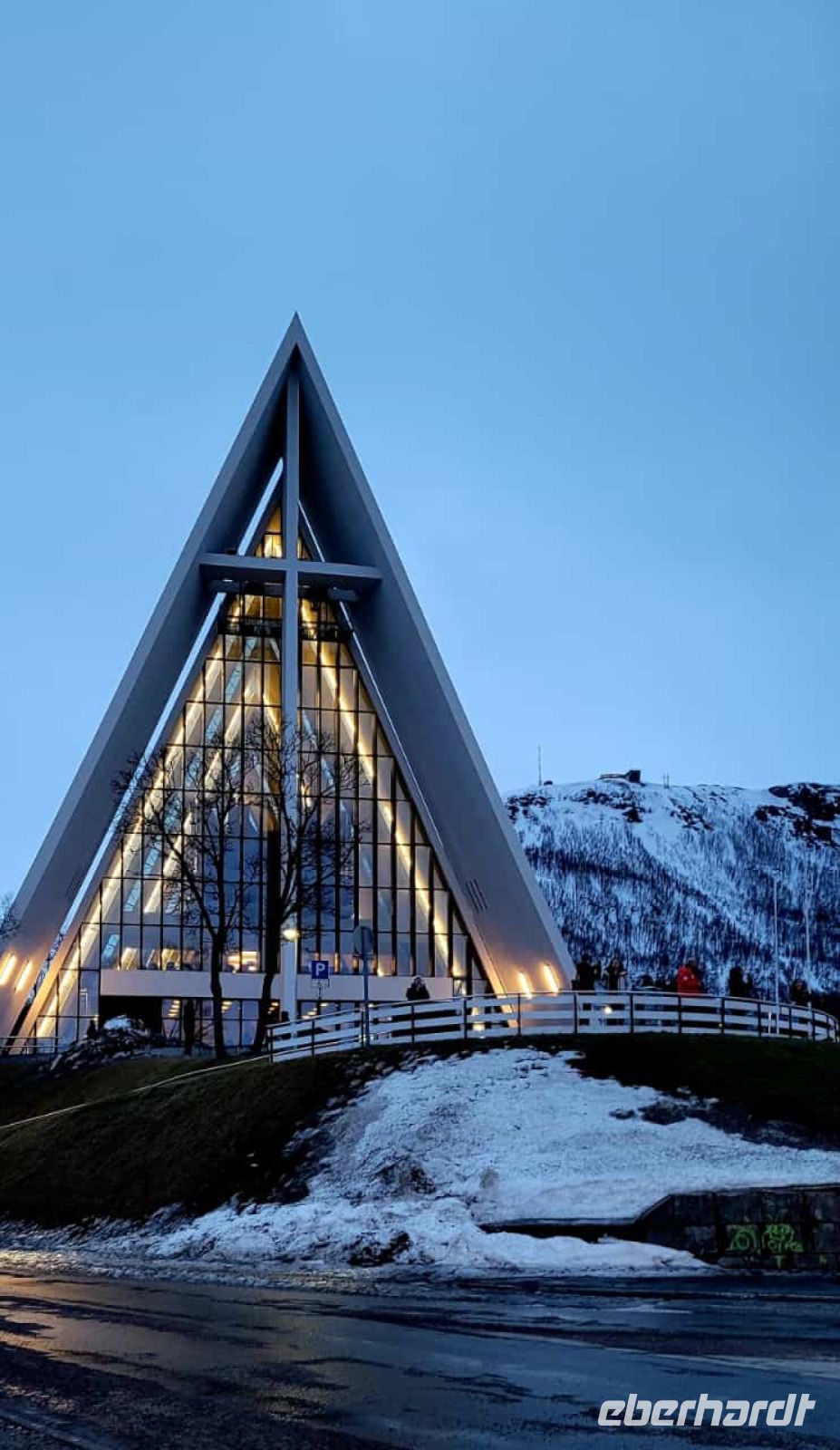 Bevor wir uns auf den Weg in unser Resort machen, statten wir dem Wahrzeichen der Stadt Tromso noch einen kurzen Besuch ab. Die Eismeerkathedrale sieht in der Abenddämmerung einfach wunderschön aus !