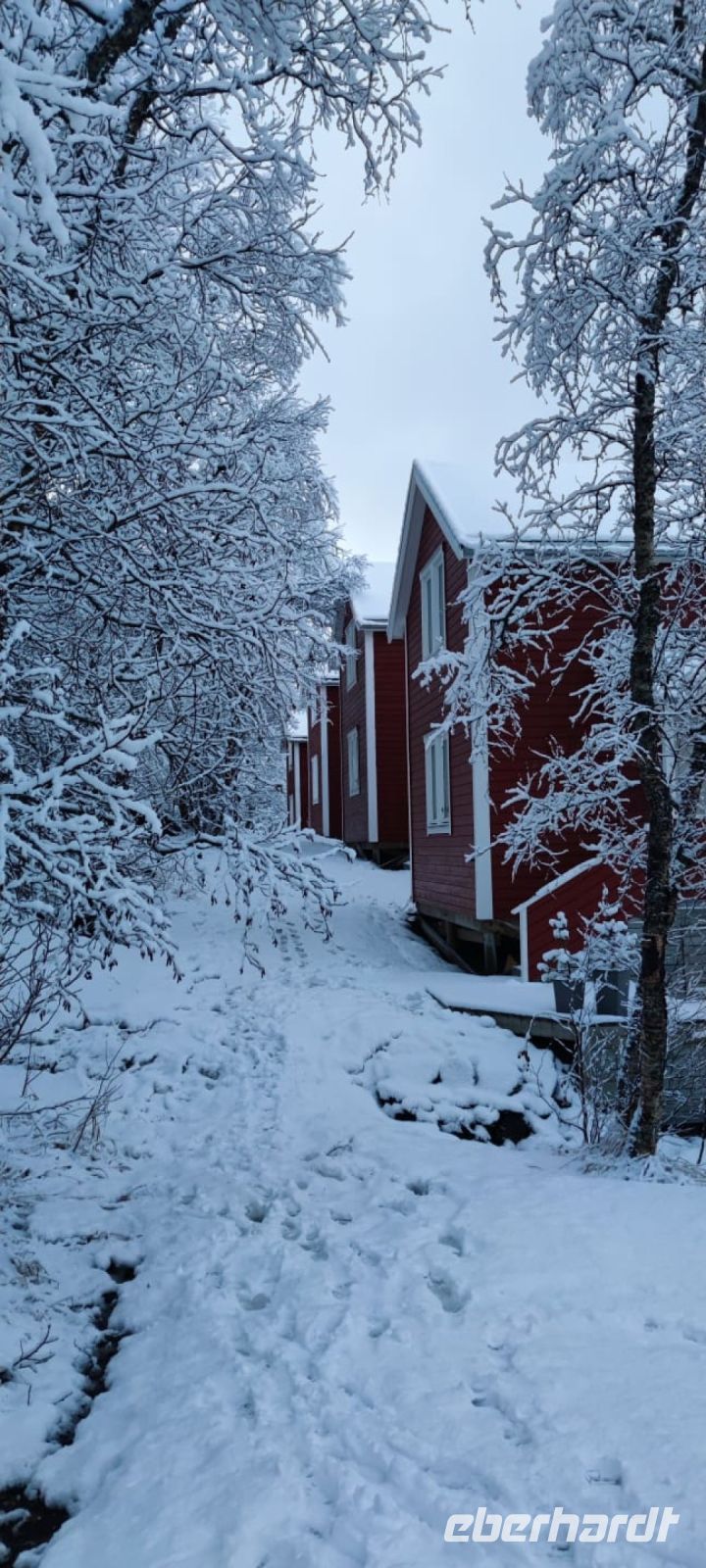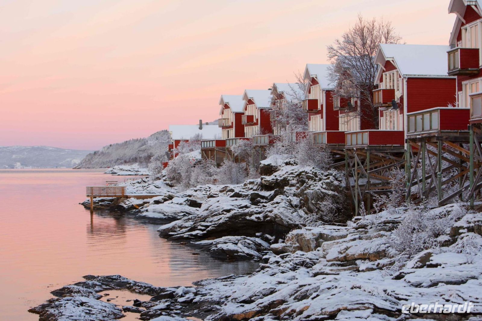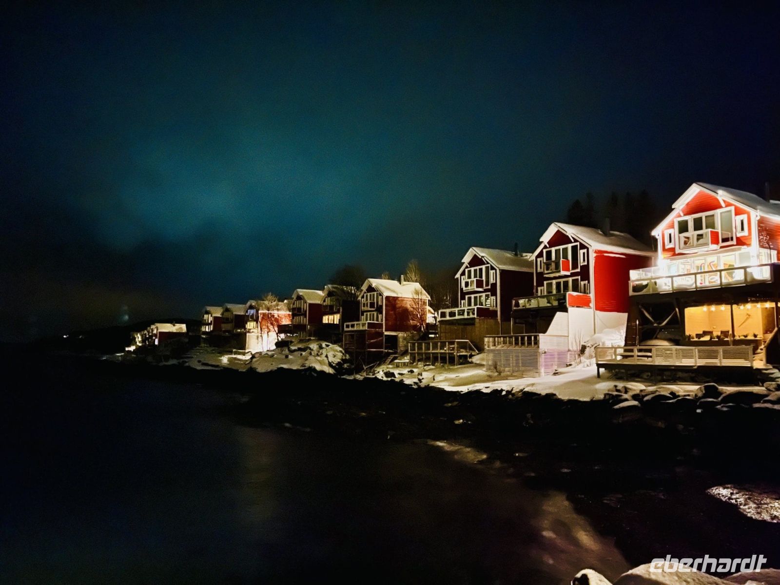 Rund 180 Eberhardt-Gäste werden in den kommenden Tagen 7 verschiedene Gruppenreisen erleben. Wir , die Singles, werden die ganze Zeit im Malangen Resort untergebracht sein. Kleine rote Holzhäuschen stehen direkt am Malangen-Fjord verteilt, jedes ist individuell eingerichtet, in denen jeweils 3 Gäste ein eigenes, kleines Schlafzimmer haben und sich den gemütlichen Wohnbereich miteinander teilen.