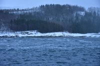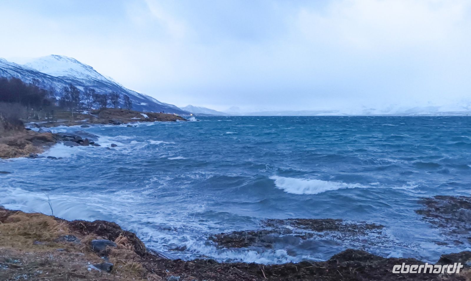 Mit Sundair geht es nonstop von Dresden direkt nach Tromsø. Unser arktisches Abenteuer beginnt bereits in der Luft. Orkanartige Windböen sind bei der Landung vorhergesagt. Der Flugkapitän deutet an, dass wir möglicherweise überhaupt nicht landen können. Es kommt anders! Trotz widriger Wetterumstände gelingt den Piloten eine sichere Landung im ersten Versuch, auch die erwarteten Turbulenzen blieben uns glücklicherweise erspart. Temperaturen deutlich oberhalb des Gefrierpunktes erzeugen massives Tauwetter völlig ungewöhnlich im Februar in der Arktis. Das warme Wetter erzeugt Sturm, so dass die Straßenbrücke kurzzeitig sogar für den Verkehr gesperrt werden muss. Unsere Stadtrundfahrt mit dem Bus führt uns heute noch nicht nach Kvaløya und damit nicht über die gesperrte Brücke. Auf dem schmalen Sandnessund, der die Inseln Tromsøya und Kvaløya bilden sich schnell Wellen mit weißen Schaumkronen, interessant anzusehen. Dies bedeutet mindestens Windstärke 8 und mehr. Unser Reisebus ist wie nahezu alle Fahrzeuge im Norden Skandinaviens mit Spike-Reifen ausgestattet. Dies ermöglicht stets eine sichere Fahrt auf winterlich-eisigen Straßen.