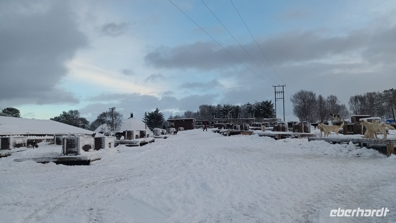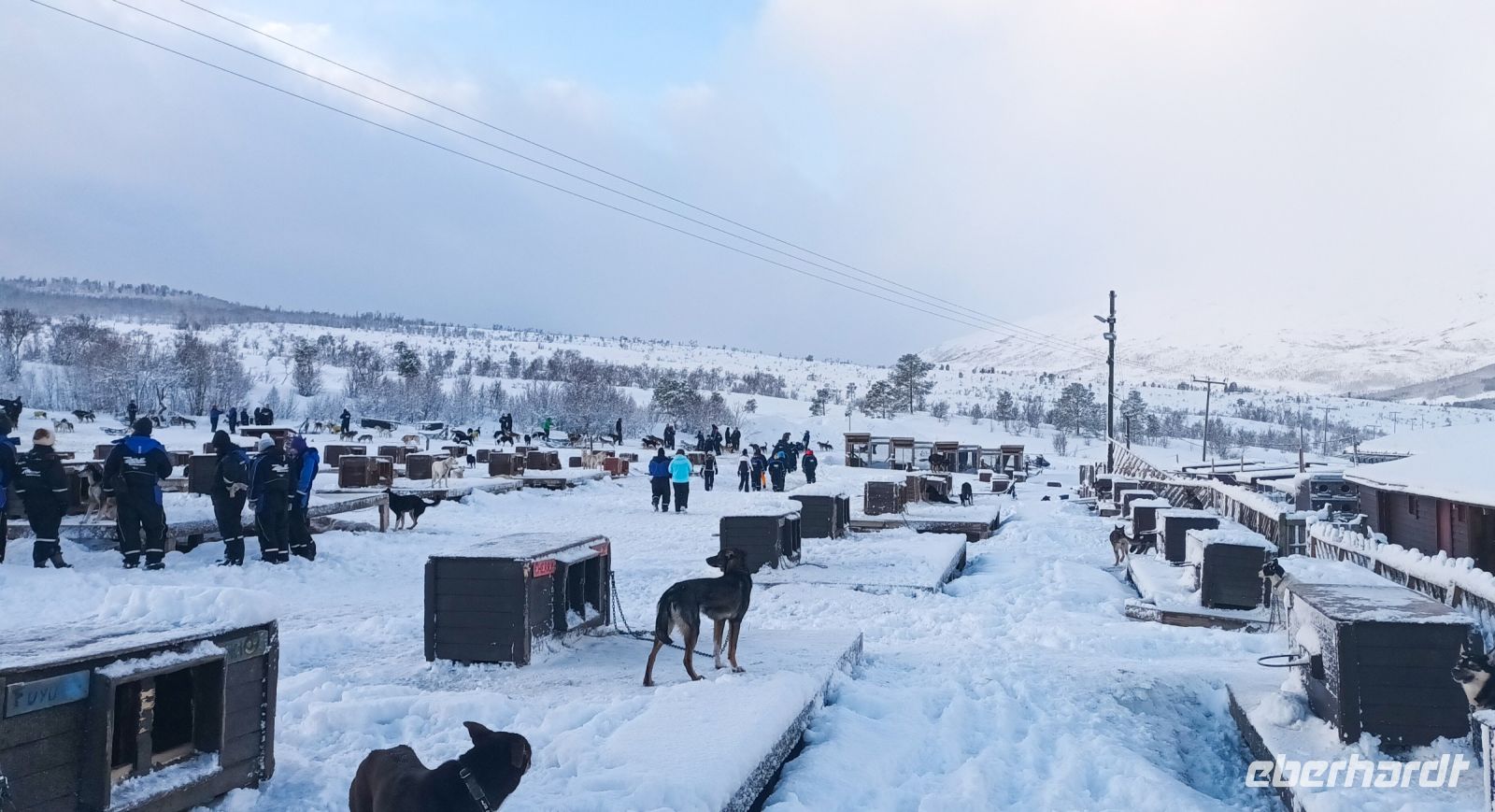 Einerseits ist über Nacht reichlich frischer Schnee gefallen, anderseits befindet sich unter dem Schnee noch Matsch vom gestrigen Tauwetter. Viel Arbeit für die Hunde und den Musher auf nicht ganz optimalen Schneebedingungen. Optisch ist es allerdings eine subarktische Augenweide.