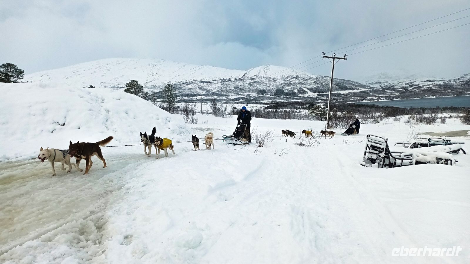Unser erstes Ereignis ist die Hundeschlittenfahrt auf Kvaløya. Wir teilen uns in zwei Gruppen auf. Annett übernimmt die erste Gruppe, Martin die Zweite. Mit einem Bus geht es ca. 40 Minuten aus der Stadt hinaus über die Sandnessund-Brücke auf die Insel Kvaløya.