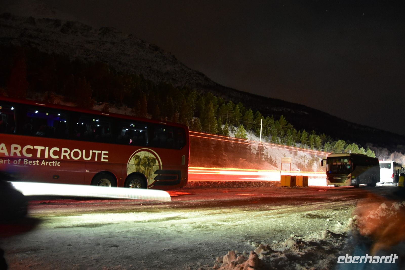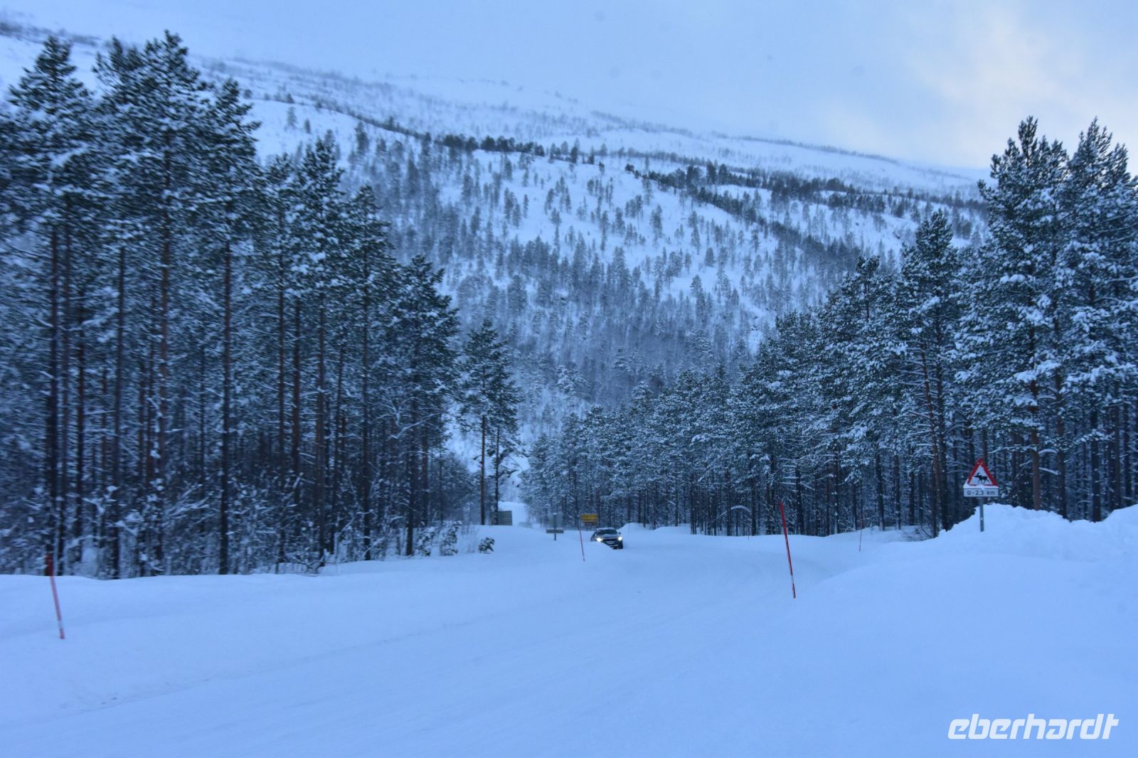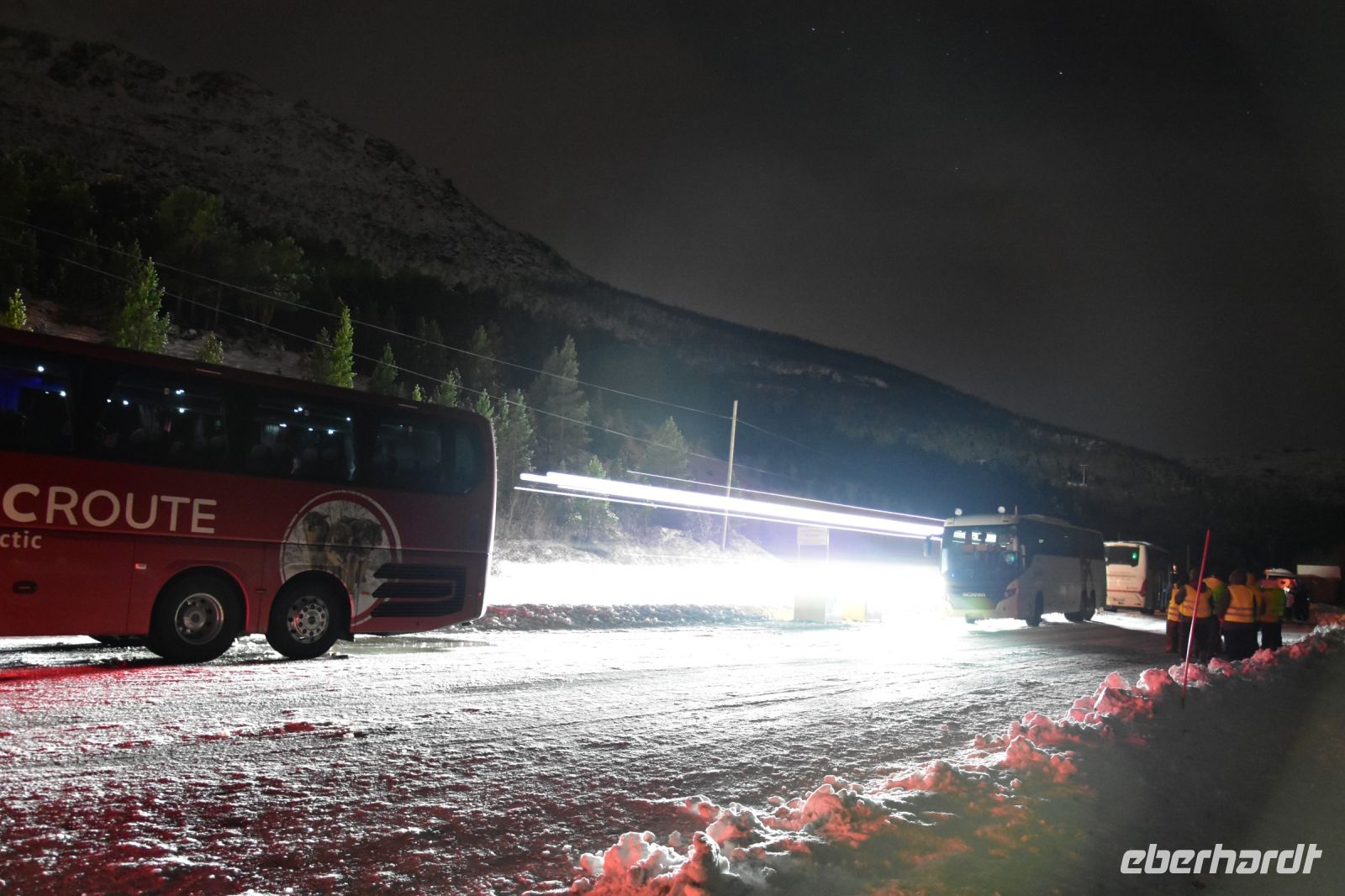 Über die E8 und E6 geht es in zwei Stunden Fahrt die 120 km lange Strecke nach Skibotn kurz vor der finnischen Grenze. Unterwegs Kontrollstopps – was macht der Himmel? Wolken und immer wieder kräftige Schneeschauer.