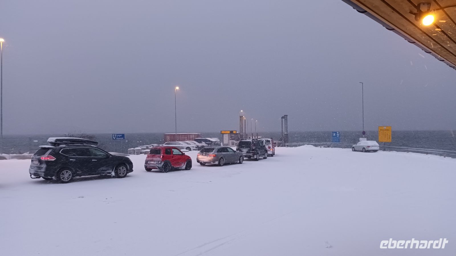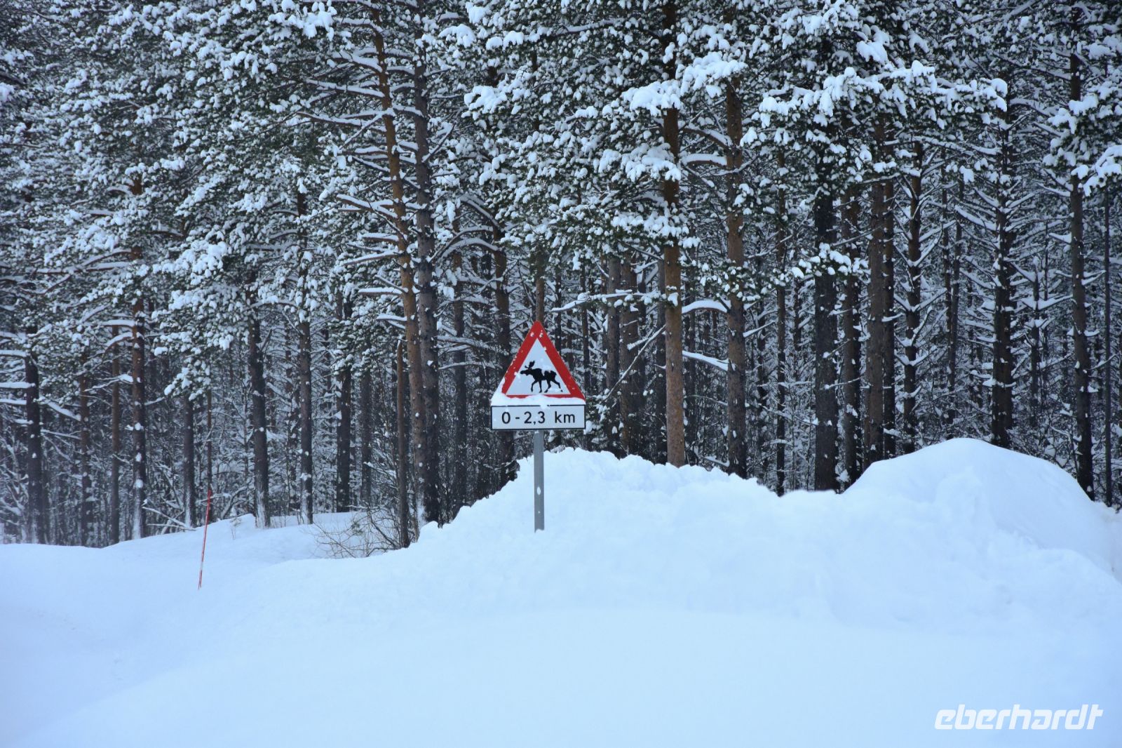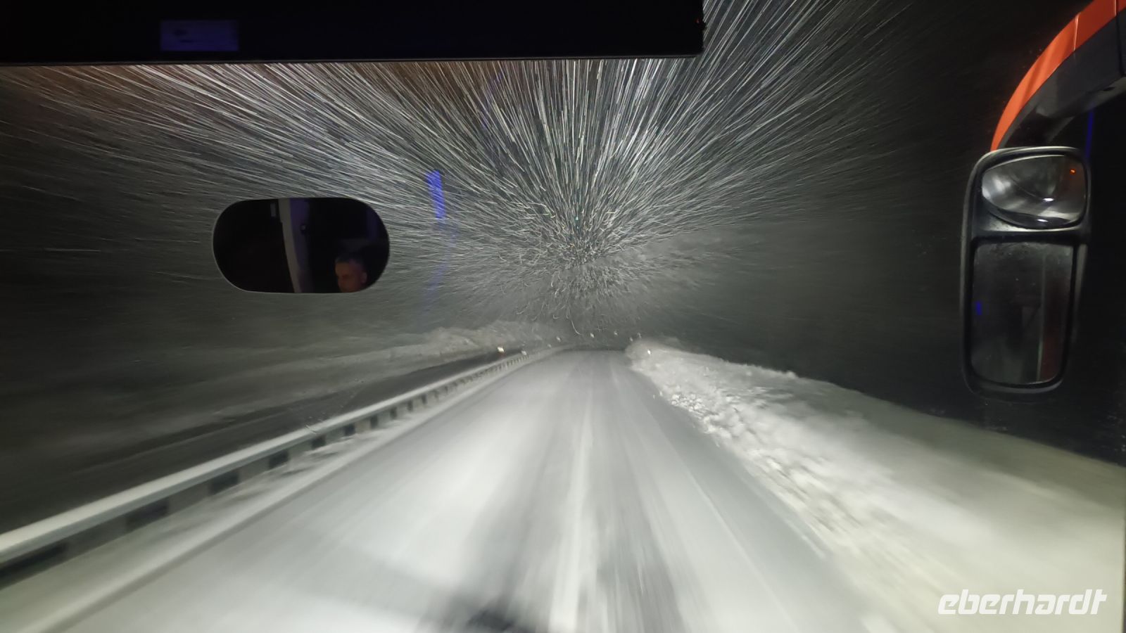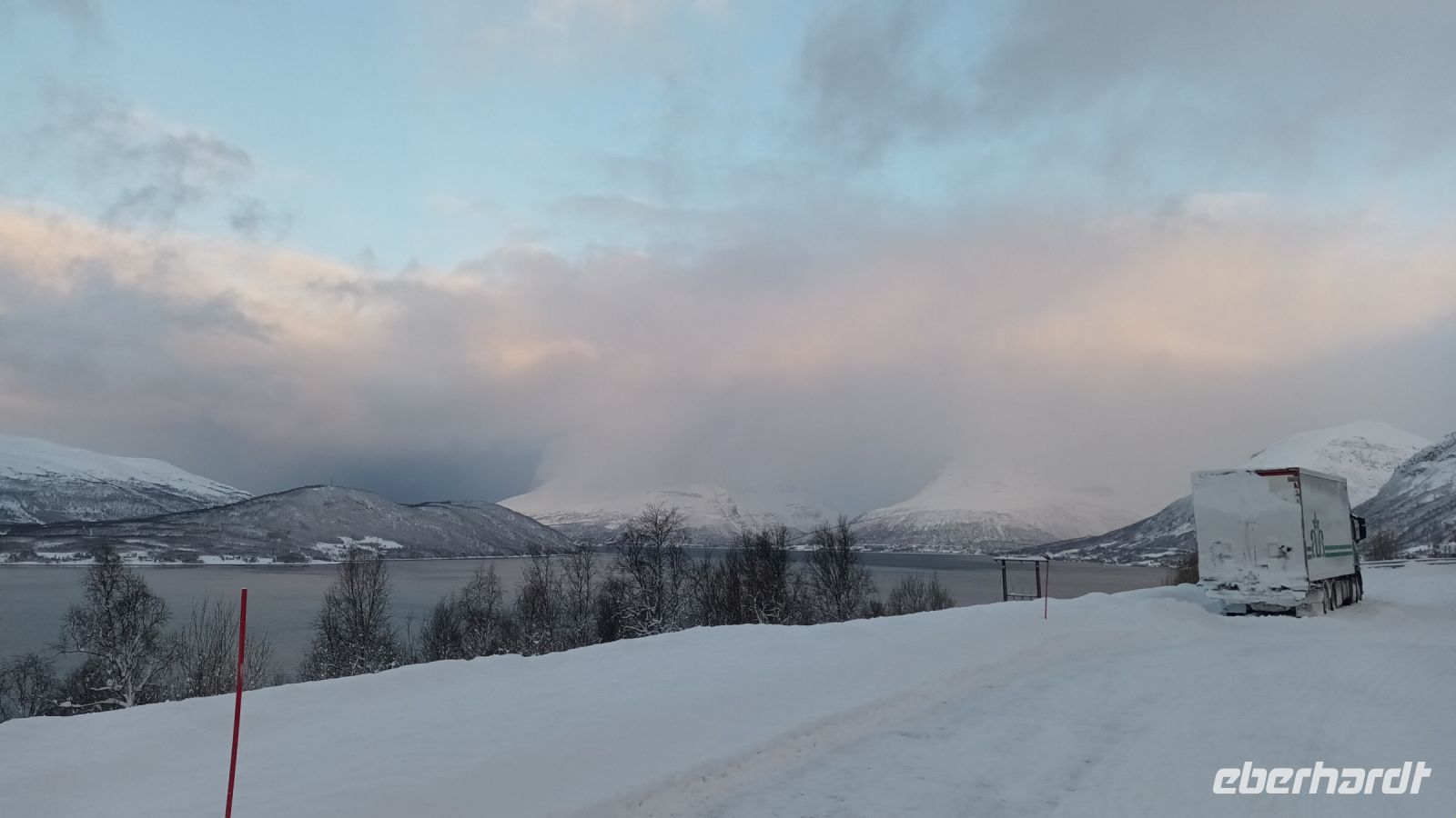 Über die E8 und E6 geht es in zwei Stunden Fahrt die 120 km lange Strecke nach Skibotn kurz vor der finnischen Grenze. Unterwegs Kontrollstopps – was macht der Himmel? Wolken und immer wieder kräftige Schneeschauer.