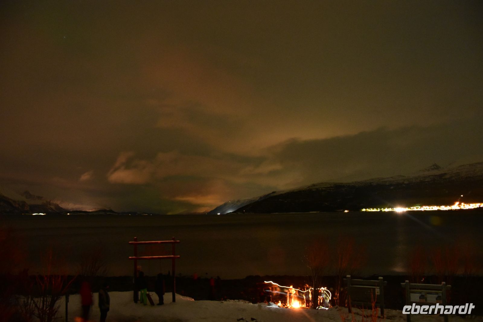 In Skibotn angekommen geschlossene Wolkendecke. Wir wollen mindestens eine Stunde bleiben! Bei der Polarlichtbeobachtung ist es wie auf der Jagd, man benötigt Geduld und warme Kleidung. Wir sind nicht die Einzigen, die an diesem Spot auf ihr Glück hoffen.