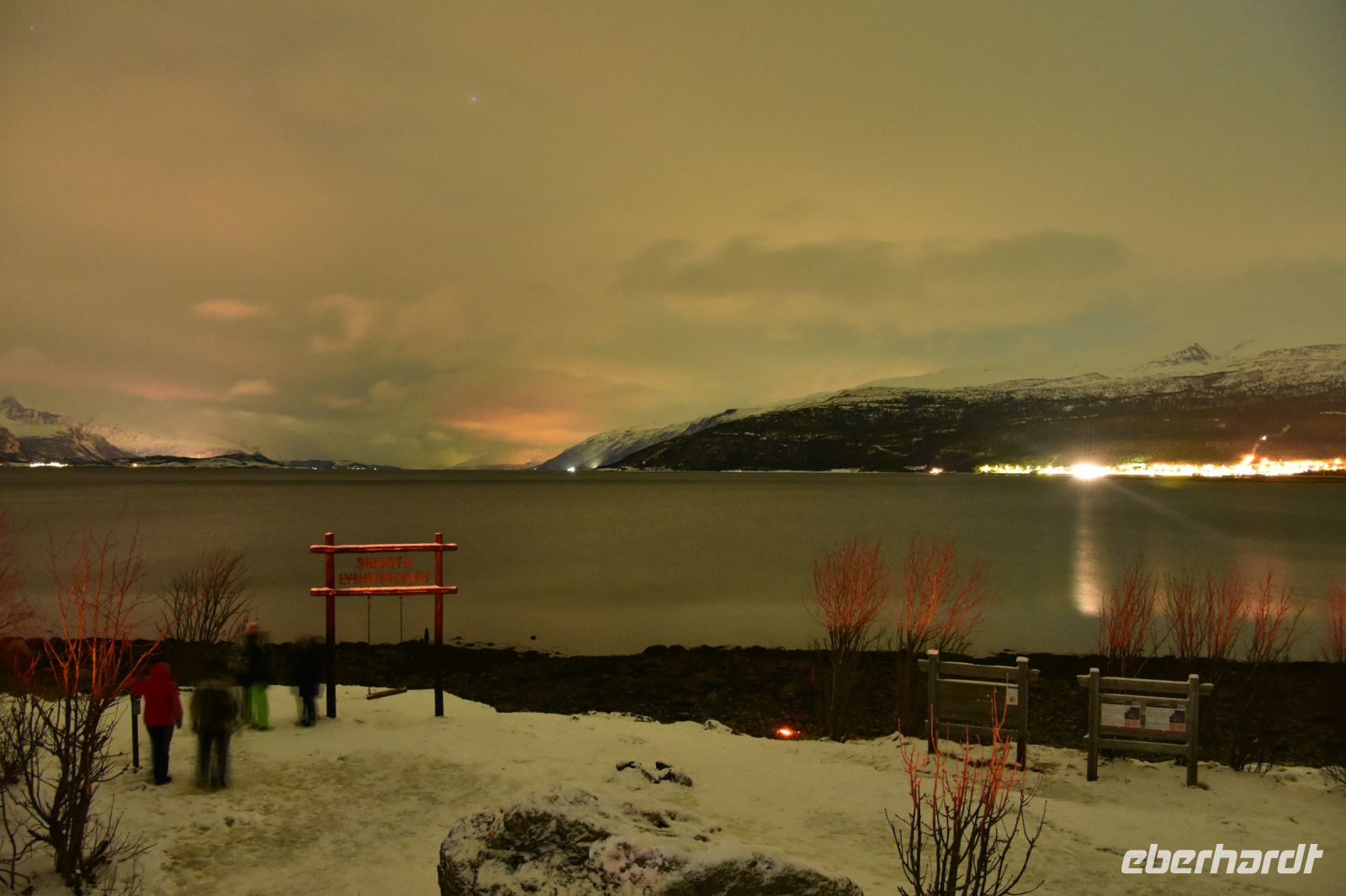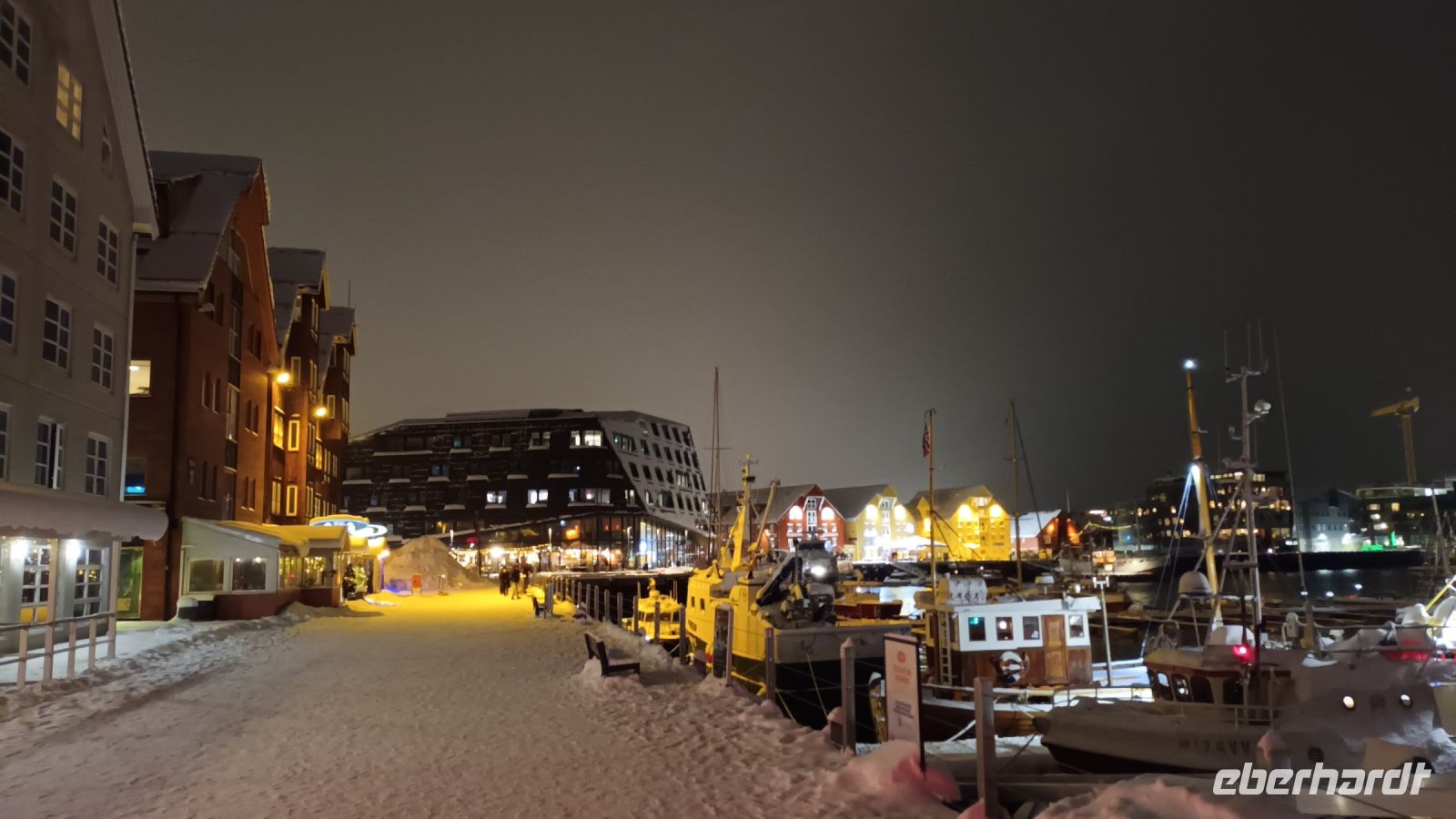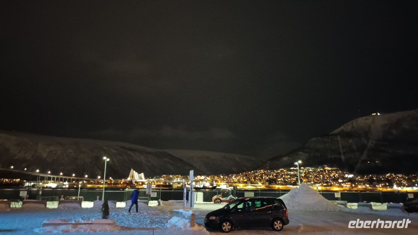 Mittlerweile umfasst die Flotte der Brim-Explorer mehrere Schiffe. Hochmoderne, futuristische Schiffe mit leisem Hybrid-Antrieb. Das Wetter für Nordlicht ist wieder sehr mäßig. Der Kapitän entscheidet sich für eine Routenänderung, aufgrund des Wetters entscheidet er sich vor der Troms-Insel zu bleiben. Wenn schon kein Polarlicht, dann wenigstens die beleuchtete „Skyline“ von Tromsø. Klingt etwas überspitzt, bei der Vielzahl an Neubauten in der Stadt allerdings durchaus treffend.