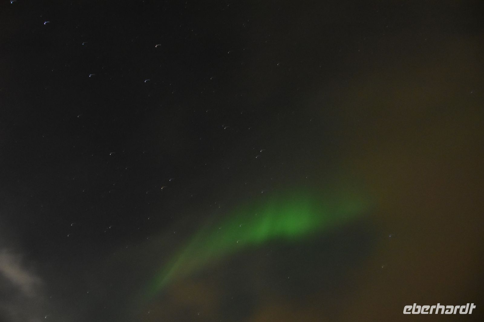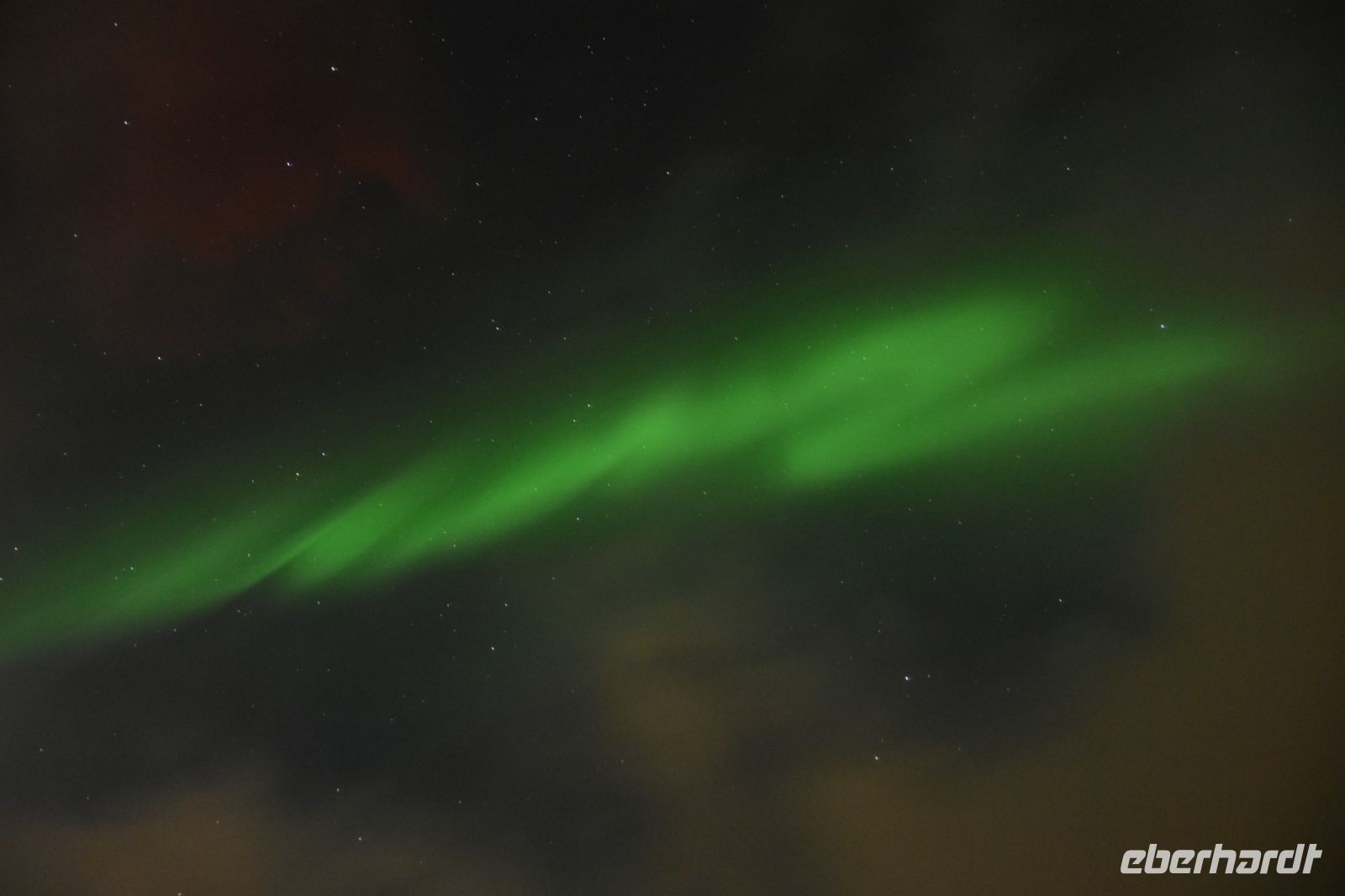 Eine Gruppe nach der anderen verlässt enttäuscht den Beobachtungspunkt! Die Magnetometerdaten werden immer besser, mit ein wenig „grün“ hinter dichter Wolkendecke geben wir uns nicht zufrieden. Dann ist es so weit. Der Himmel reißt auf, es wird sternenklar! Kurze Zeit später setzt das Nordlicht ein! Die „grüne Lady“ tanzt sogar am Nachthimmel (Bewegung).