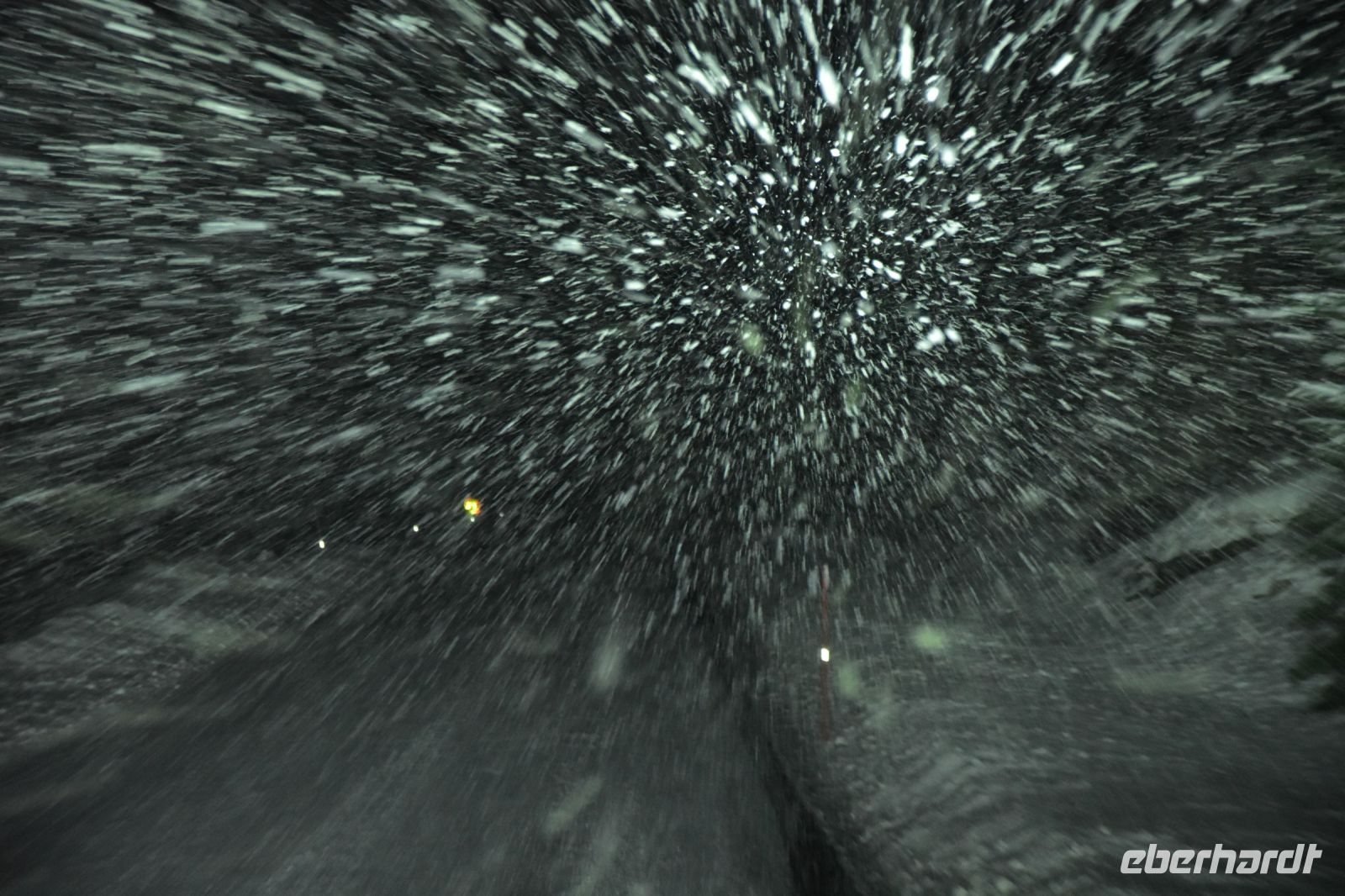 Am frühen Abend starten wir erneut mit dem Reisebus in das nächste Abenteuer – einer Nordlichtsafari. Die astronomischen Daten sind hervorragend! Für eine gute Beobachtung muss allerdings auch das Wetter mitspielen. Genau das Wetter will jedoch nicht recht mitspielen! Schneefall! Wolken! Alles wir heute Abend nicht gebrauchen können. Unsere beiden hervorragenden und erfahrenen örtlichen Guides Celine und Fabian entscheiden sich in südöstliche Richtung – Richtung Finnland zu fahren, dort haben sie im Niederschlagsradar in den späten Abendstunden ein Wolkenloch ausgemacht. Es schneit!!!