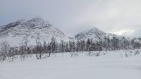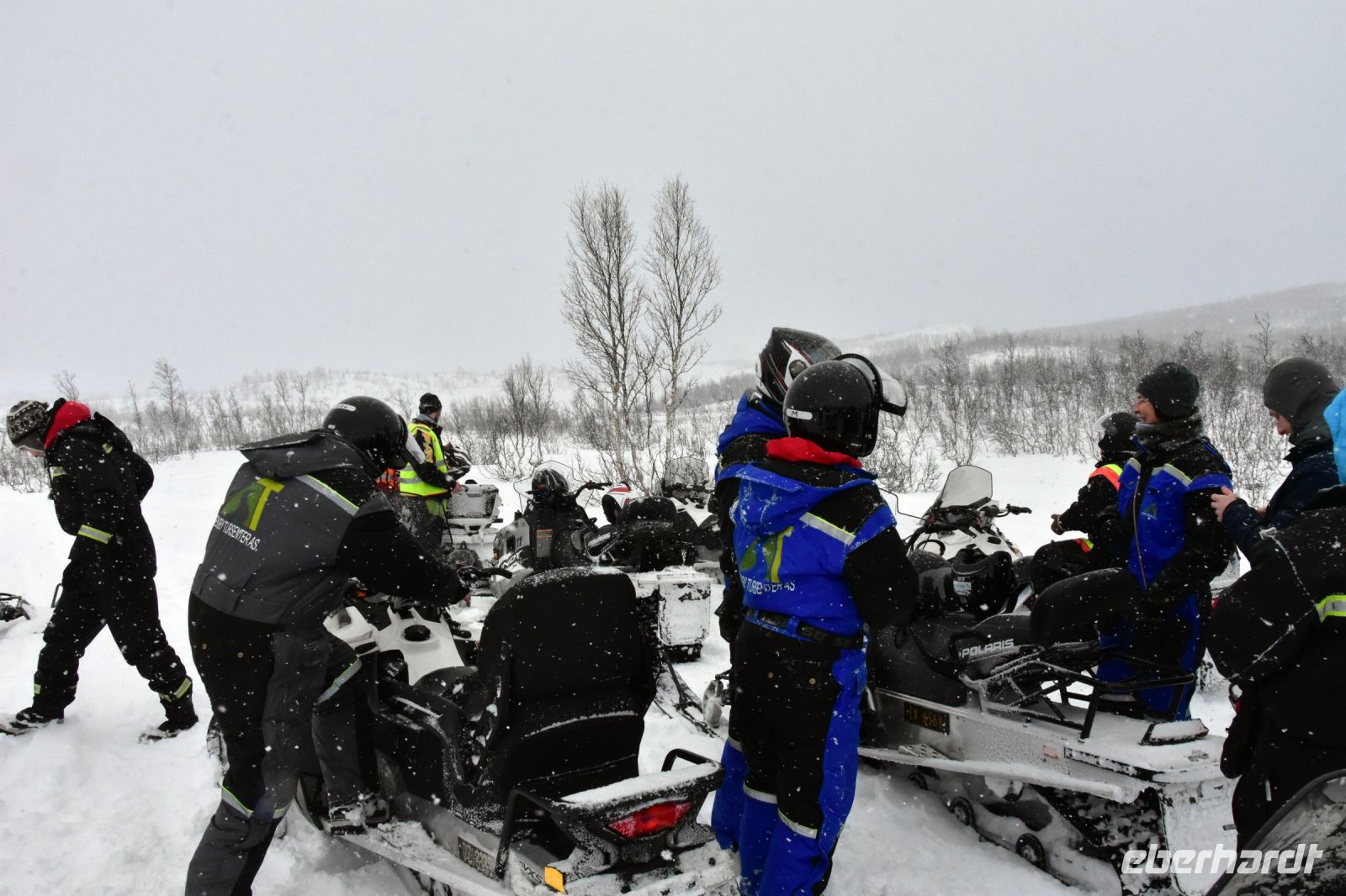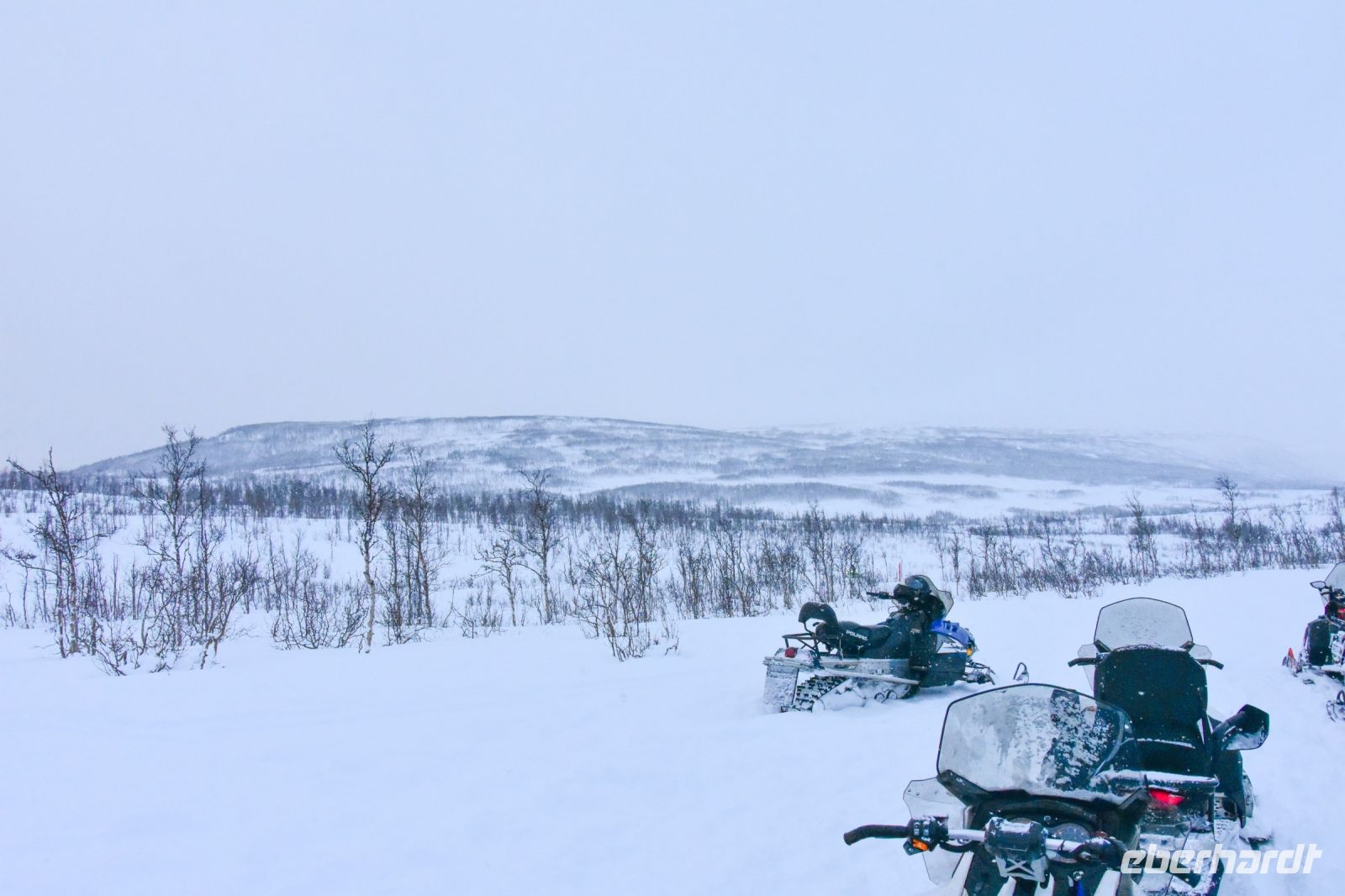 Der Pfad führt zunächst durch ein Wäldchen. Bei der Anfahrt nach einem kurzen Stopp passiert ein kleines Malheur, die Kurve an einem Abzweig wird von einem Schneemobil bei langsamer Fahrt nicht richtig erwischt. Dabei kippt es um. Man liegt in federweichem Tiefschnee, nichts passiert – keiner verletzt – kein Schaden. Einige Männerhände heben das Gefährt zurück auf den Weg. Es zeigt: Vorsichtig fahren – so ein Gerät kann kippen! Der Wald lichtet sich, der Schneefall lässt nach und gibt den Blick auf das Fjell frei! Traumhafte Kulisse! Bei jedem kleinen Fotostopp können Fahrer/Mitfahrer beliebig die Position wechseln, sofern beide einen Führerschein haben.