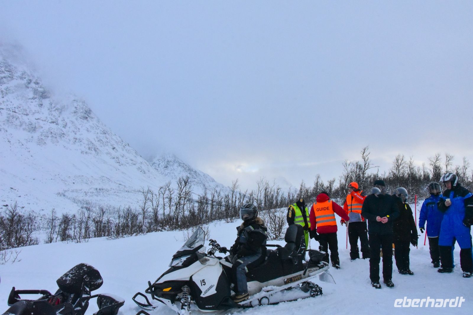 Voll motiviert und pünktlich stehen wir am Morgen bereit für das nächste Abenteuer! Auch heute teilen wir die Gruppe für unsere Schneemobil-Tour in den Lyngen-Alpen.