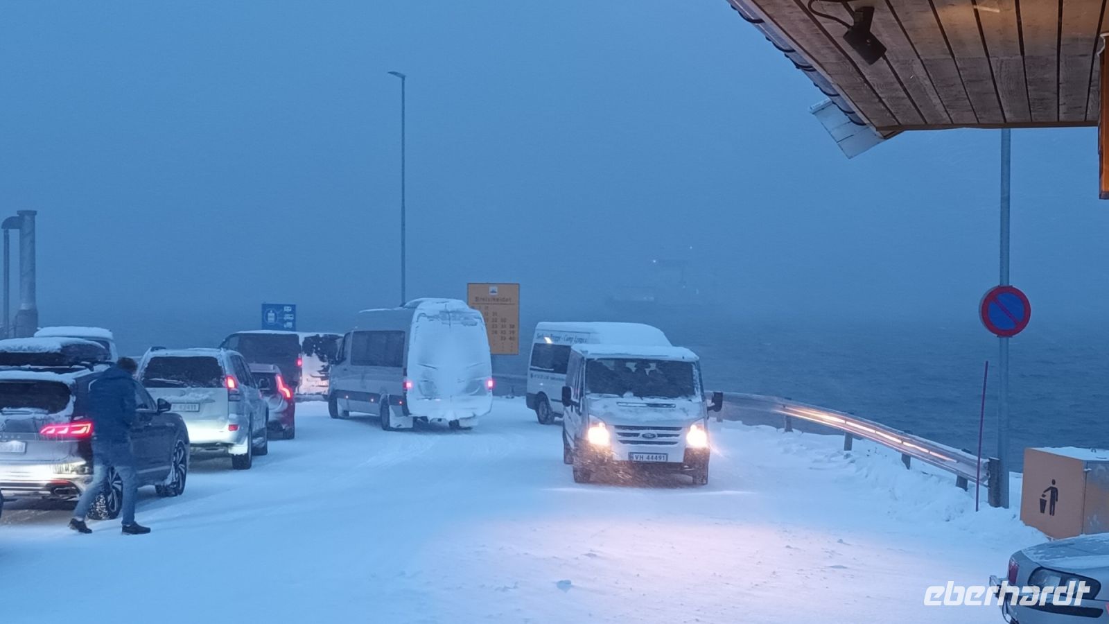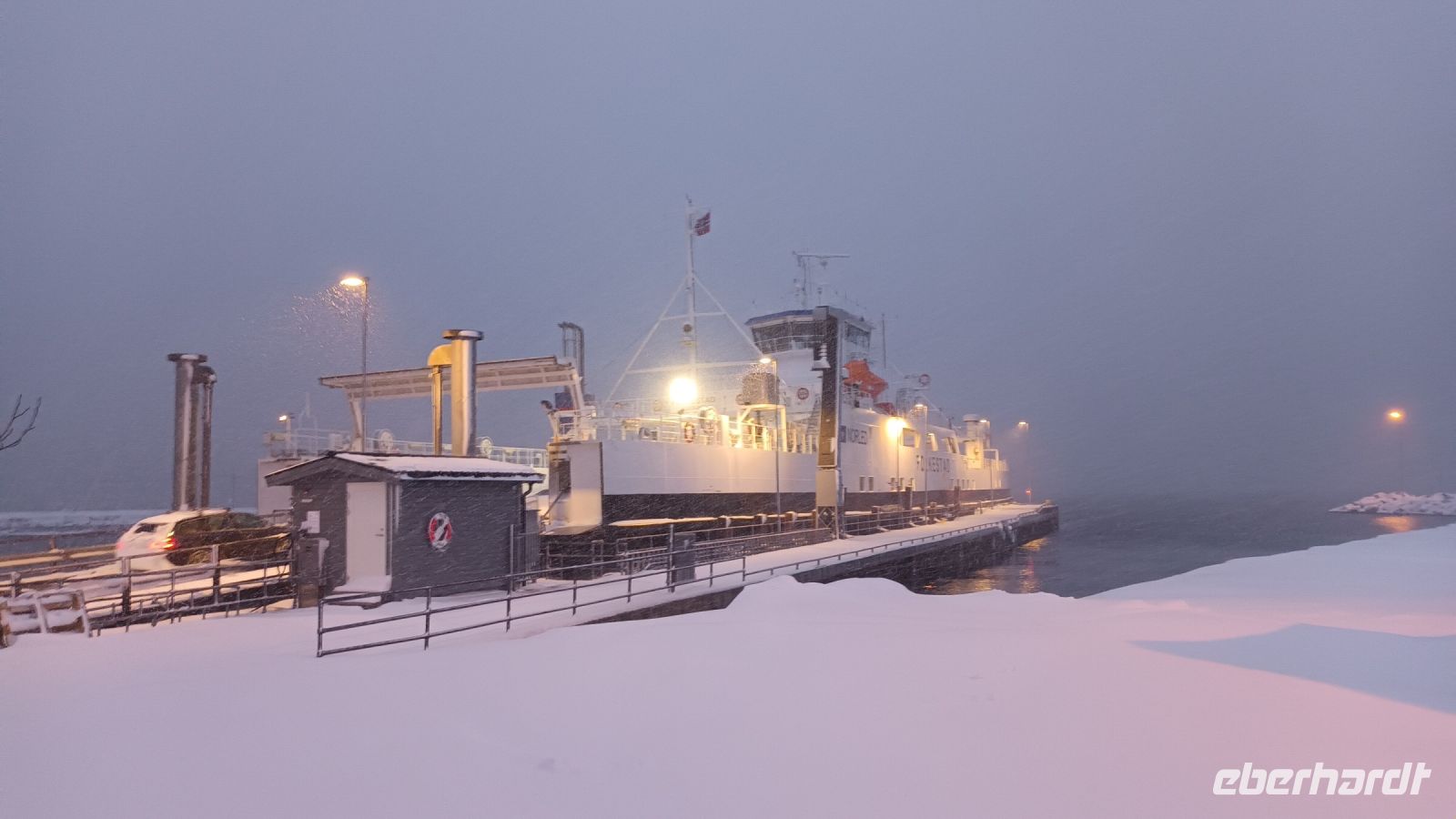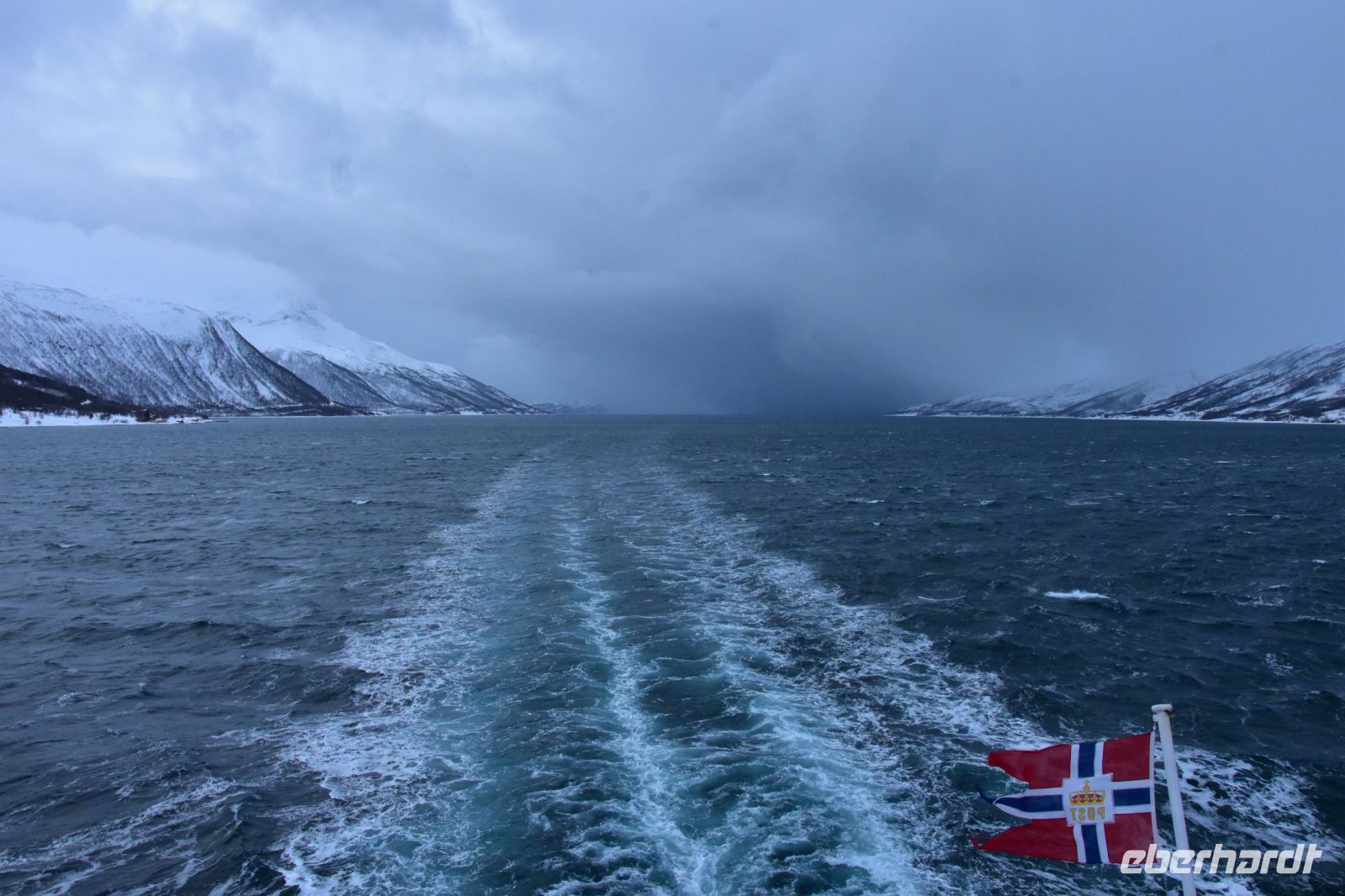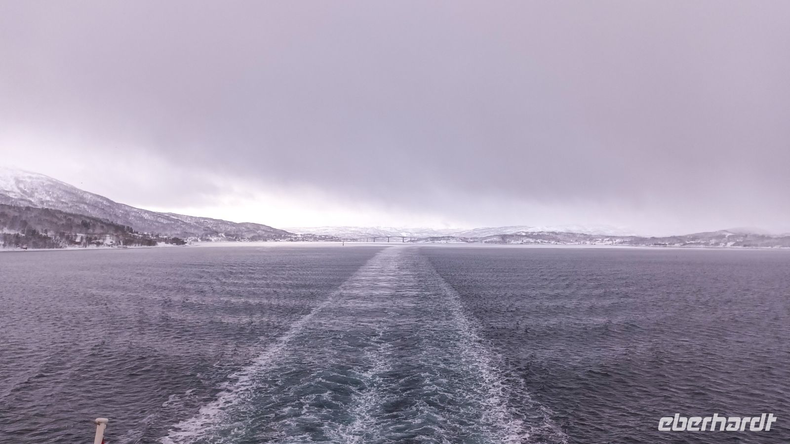 Auch heute beginnt der Tag früh, wir müssen ein Schiff erreichen! Gemeinsam in einem Bus zusammen mit Annett und Martin geht es über die E8 und E6 nach Finnsnes. Von hier nutzen wir die legendäre nordgehende Hurtigrute M/S Nordlys von Finnsnes zurück nach Tromsø.