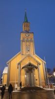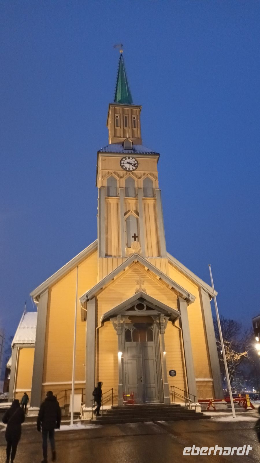 Unsere Stadtrundfahrt führt durch die Innenstadt vorbei am Polariamuseum, der ältesten Kneipe der Stadt „Ølhallen“ und dem Polarmuseum, hinauf zur Universität, der größten in Nordnorwegen und dem angeschlossenen Universitätsklinikum in dem 6.000 Angestellte arbeiten. Weiter geht es durch das verzweigte Tunnelsystem, von dem an drei unterirdischen Kreisverkehren die verschiedenen Tunnelröhren im Inneren der Insel verlaufen bis hin zur Südspitze der Troms-Insel (Tromsøya), dort wo im 2. Weltkrieg das Schlachtschiff Tirpitz versenkt wurde. Höhepunkt ist der Besuch der Tromsdalenkirche, besser bekannt als „Eismeerkathedrale“. In den 1960er Jahren wurde sie schneeweiß errichtet. Sie erinnert an Eisberge passend für das „Tor zur Arktis“ wie die Stadt auch genannt wird. Protestantisch, skandinavisch, minimalistisch könnte man sie beschreiben. Sie verfügt über ein Buntglasfenster, das nachträglich eingebaut wurde, nach dem die Gläubigen oft von der Sonne geblendet mit Sonnenbrillen im Gottesdienst erschienen. Da der Pfarrer nun allerdings nicht mehr einschätzen konnte wer ihm inhaltlich noch folgte, musste ein neues Fenster her, was wiederum zum Bruch mit dem Architekten führte, der mit dieser Veränderung überhaupt nicht einverstanden war. Er sollte sein Bauwerk nie wieder betreten. Unsere Stadtrundfahrt endet direkt an unseren Hotels.