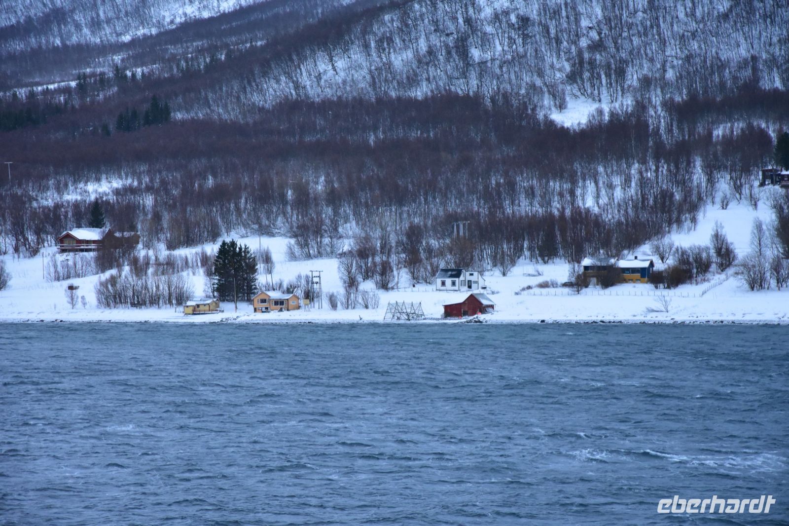 Unser Bus bringt uns zunächst über die E8 in Richtung Süden, später über die Fv91 bis nach Breivikeidet am Ullsfjord, Nebenarm des Lyngenfjordes. Unterwegs passieren wir das wichtige Polarlicht-Observatorium „Eiscat“ markant durch seine riesige Parabol-Radarantenne.