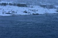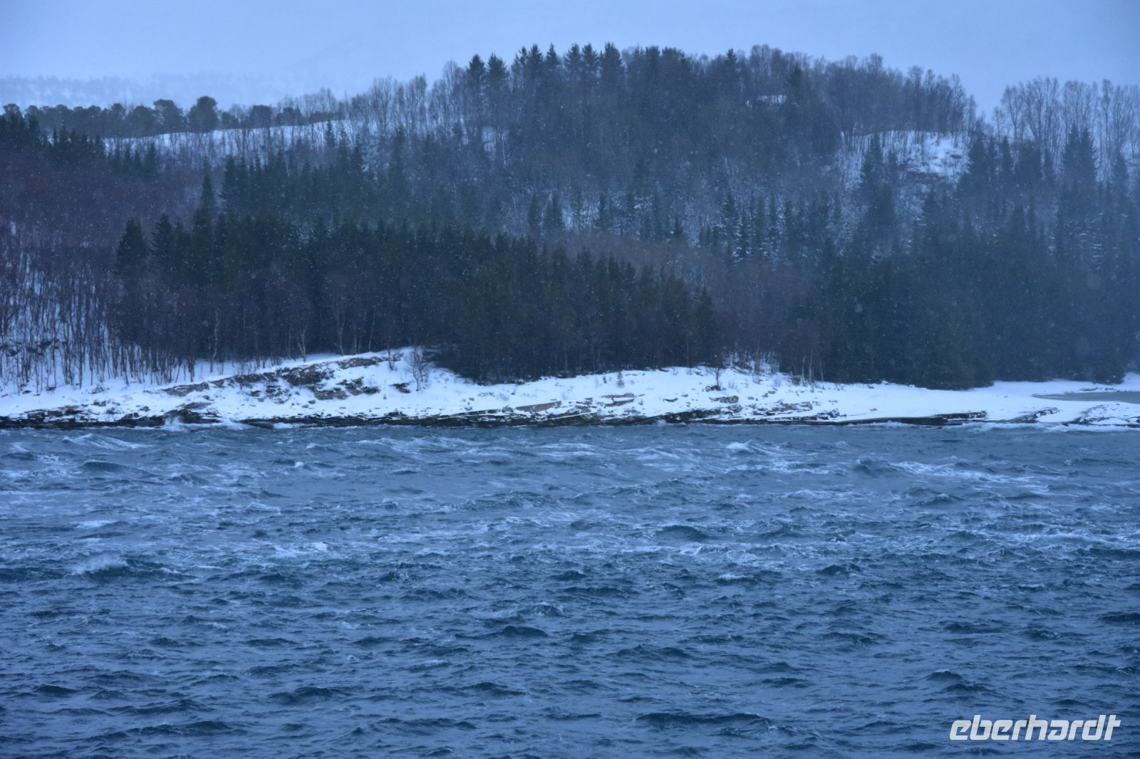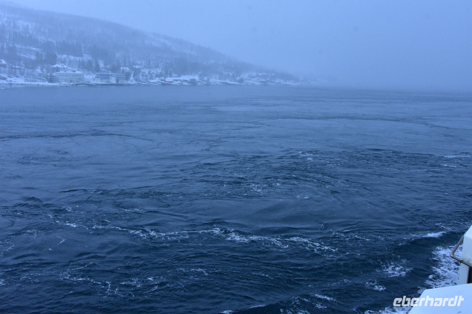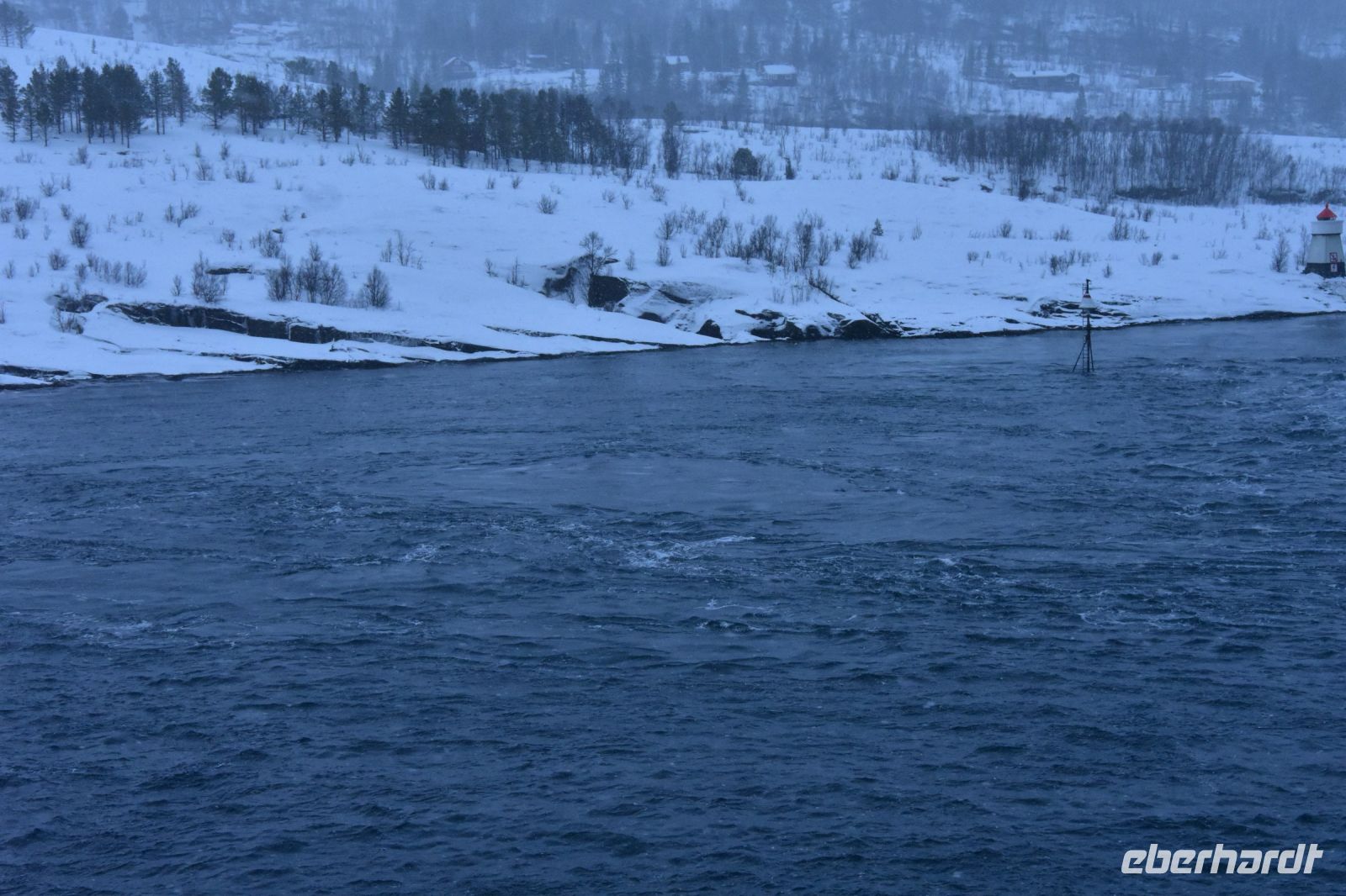 Im Verlauf der Fahrt gelangen wir zum Rystraumen. Der Name verrät schon, dass es sich um einen mächtigen Gezeitenstrom handelt. Auf weniger als 500 Meter verengt sich der Sund, so dass sich mit den Gezeiten enorme Wassermassen mal in die Eine, dann wieder in die andere Richtung bewegen. Die Strömungsgeschwindigkeit kann 6-8 kn betragen (ca. 10 – 15 km/h). Je nach Gezeitenstand und Mondphase bilden sich Verwirbelung bis hin zur Strudeln, die mehrere Meter Durchmesser haben können. Sie unterscheiden sich optisch vom „Badewannenstrudel“ und sind deutlich gefährlicher als sie aussehen.