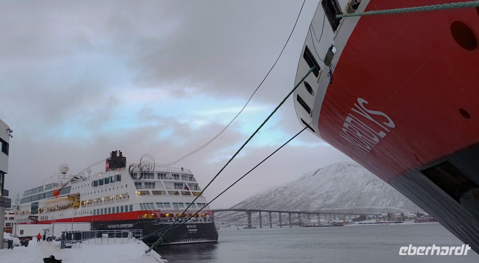 Am frühen Nachmittag erreichen wir wieder Tromsø. Ein seltenes Bild: Drei Hurtigrutenschiffe liegen hintereinander am Kai.