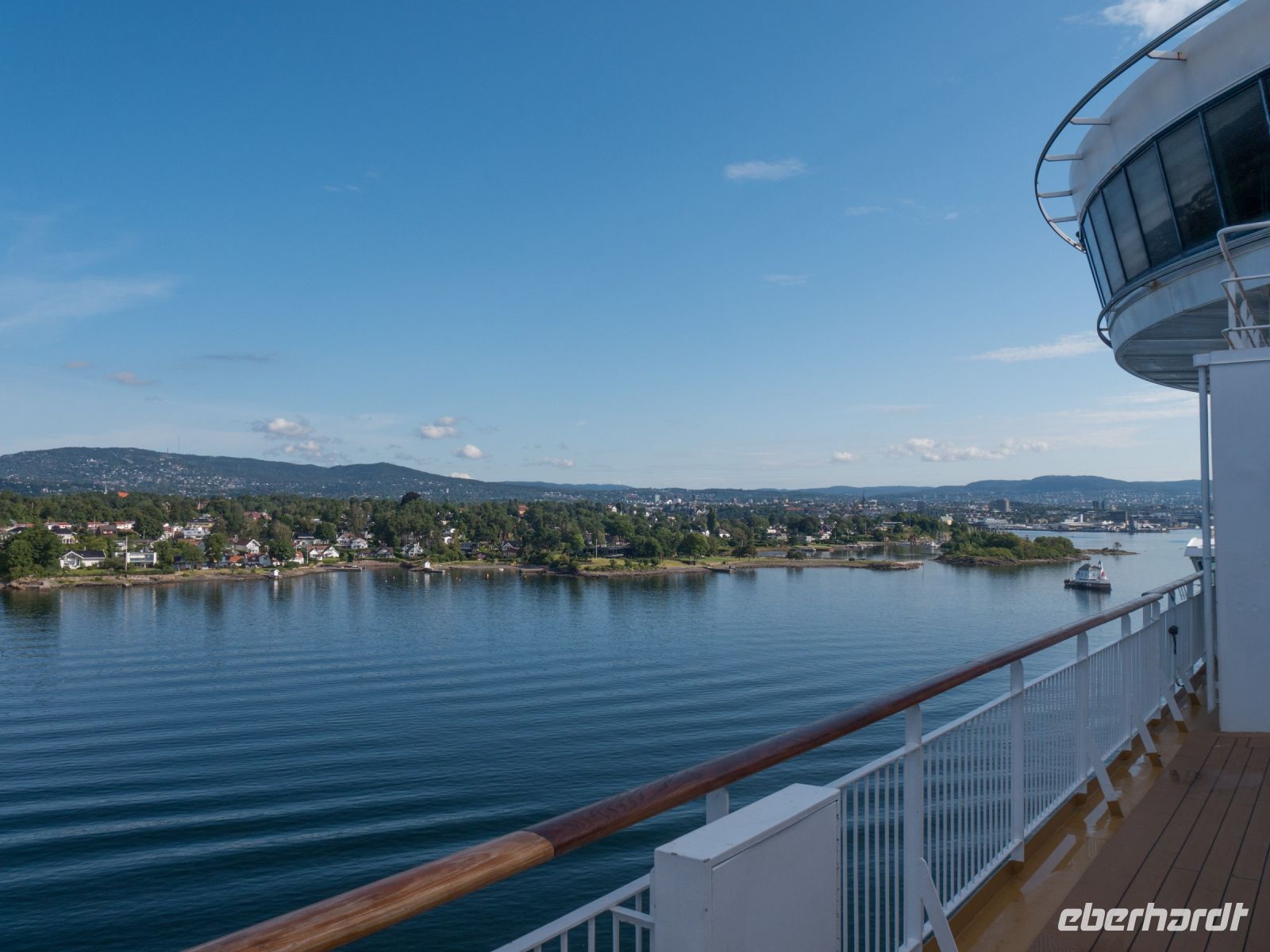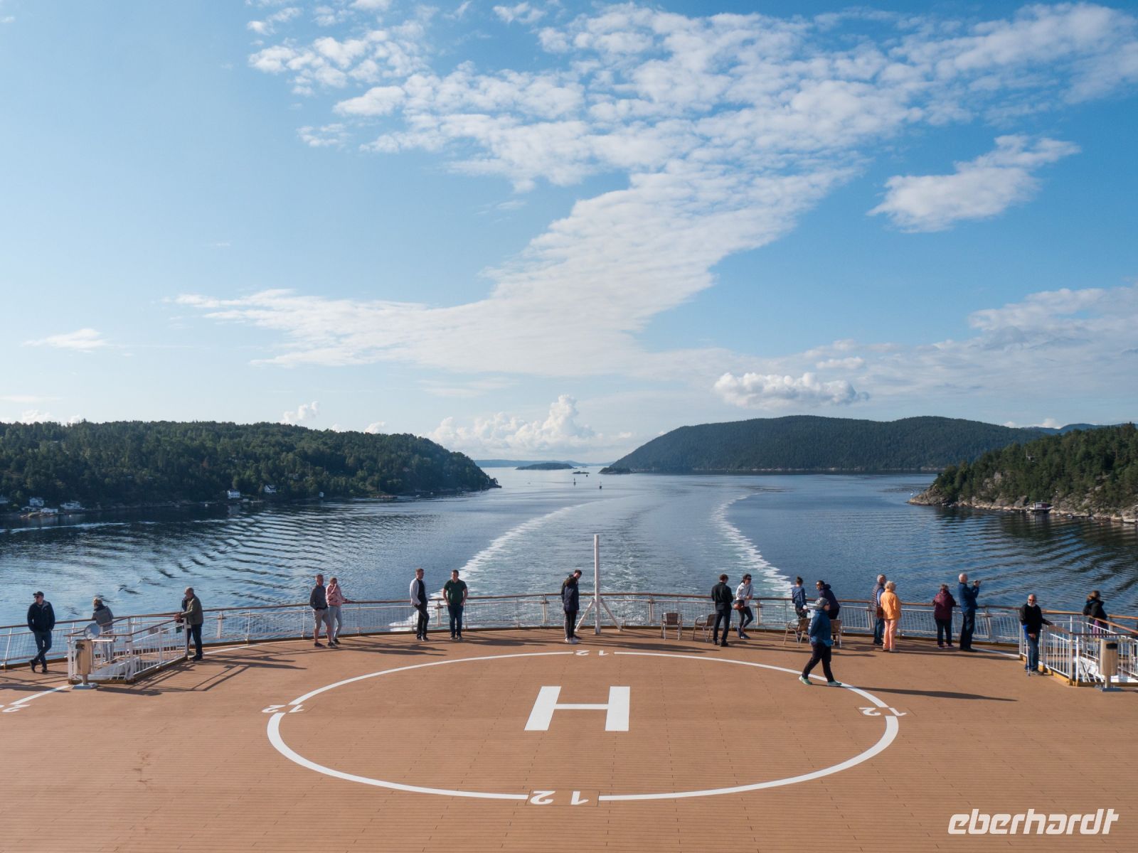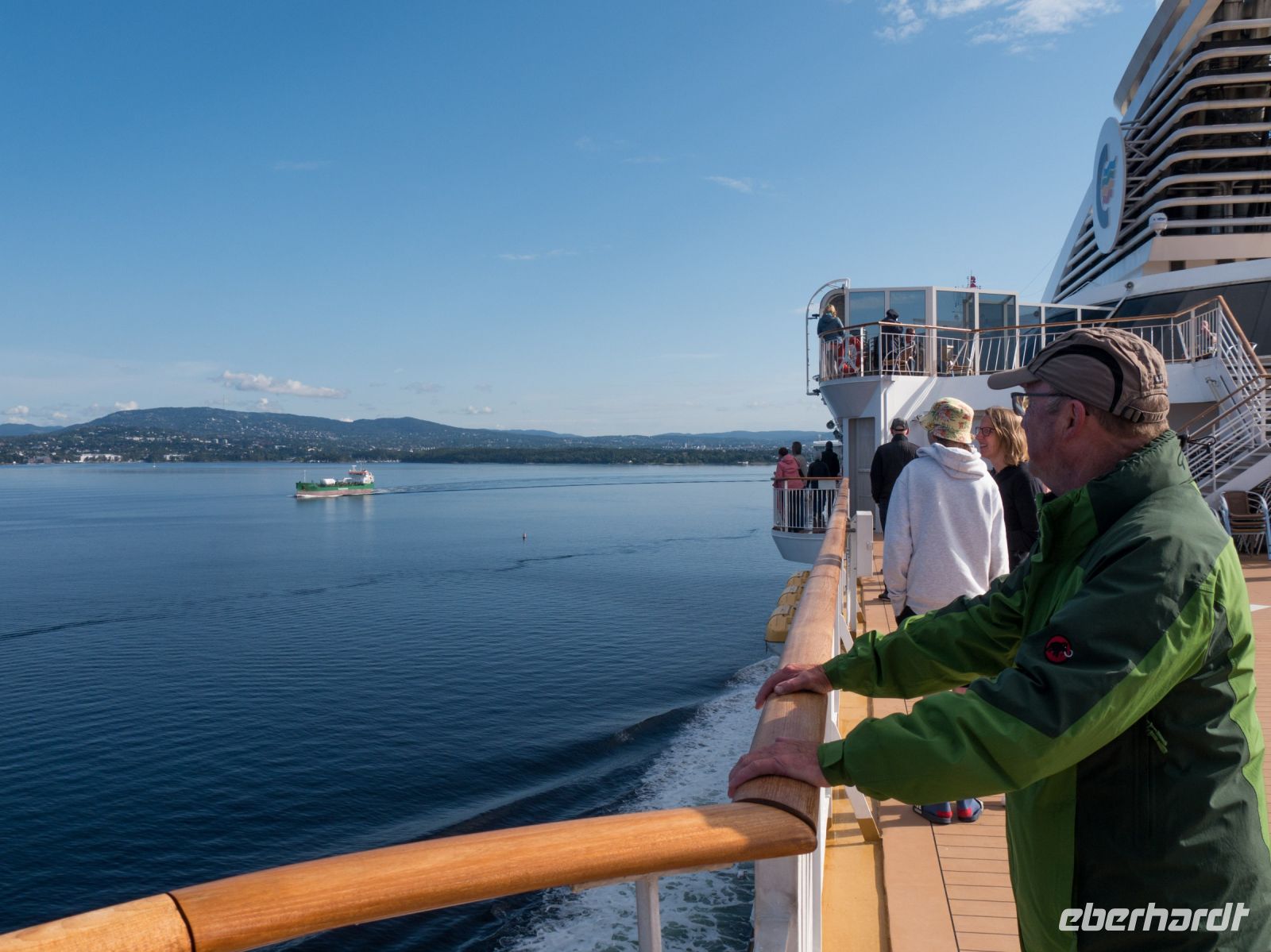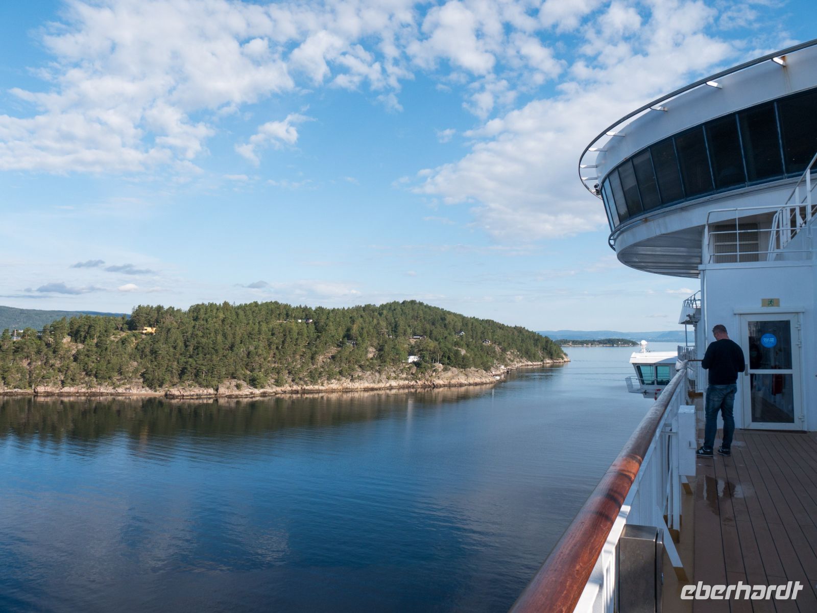 Die Nacht war ausgesprochen kurz, denn wir wollen bereits um die Mittagszeit in Kiel eintreffen, um dort unsere Fähre nach Norwegen zu erreichen. Bereits am Vortag haben wir unseren Eberhardt-Radanhänger mit den E-Bikes und allen notwendigen Utensilien beladen und können nun die Reise gen Norden antreten. Voller Vorfreude und Neugier sind wir zwei Reiseleiter, unser Bus-Chauffeur und unsere 15 radlustigen Eberhardt-Gäste. Dieser Tage reist man sicher nicht ganz ohne Vorbehalte, denn Reisen in Corona-Zeiten sind doch etwas anders als gewohnt. Die aktuell niedrigen Inzidenzzahlen ermöglichen es auch nicht geimpften / nicht genesenen Gästen, nach Norwegen einzureisen, vorausgesetzt man macht vorab eine Online-Registrierung und lässt sich bei der Einreise testen. Aber erst einmal geht es in Kiel an Bord der Color Line, dem größten Kreuzfahrtschiff der Welt mit Fahrzeugdeck! Pünktlich um 14 Uhr heißt es „Leinen los!“ und wir verlassen den Hafen von Kiel. Die Passage durch die Kieler Förde und die Bucht bietet herrliche Ausblicke und auch an Bord gibt es viel zu entdecken, so dass garantiert keine Langeweile aufkommt: Flanieren auf der Promenade, Shopping, Musik im Pub oder ein Drink mit Meerblick in der Observation Lounge. Am Abend schlemmen wir vom skandinavischen Buffet, das keine Wünsche offen lässt. Und noch ein Superlativ steht auf dem Programm: die Durchfahrt unter der Storebælt-Brücke. Die 18 Kilometer lange Brücke über den Großen Belt ist die längste Hängebrücke Europas (Hauptspannweite 1.624 Meter) und sogar eine der längsten Hängebrücken der Welt! Das lassen wir uns natürlich nicht entgehen und eilen an Deck, um den Moment einzufangen. Wir übernachten in der gebuchten Kabine.