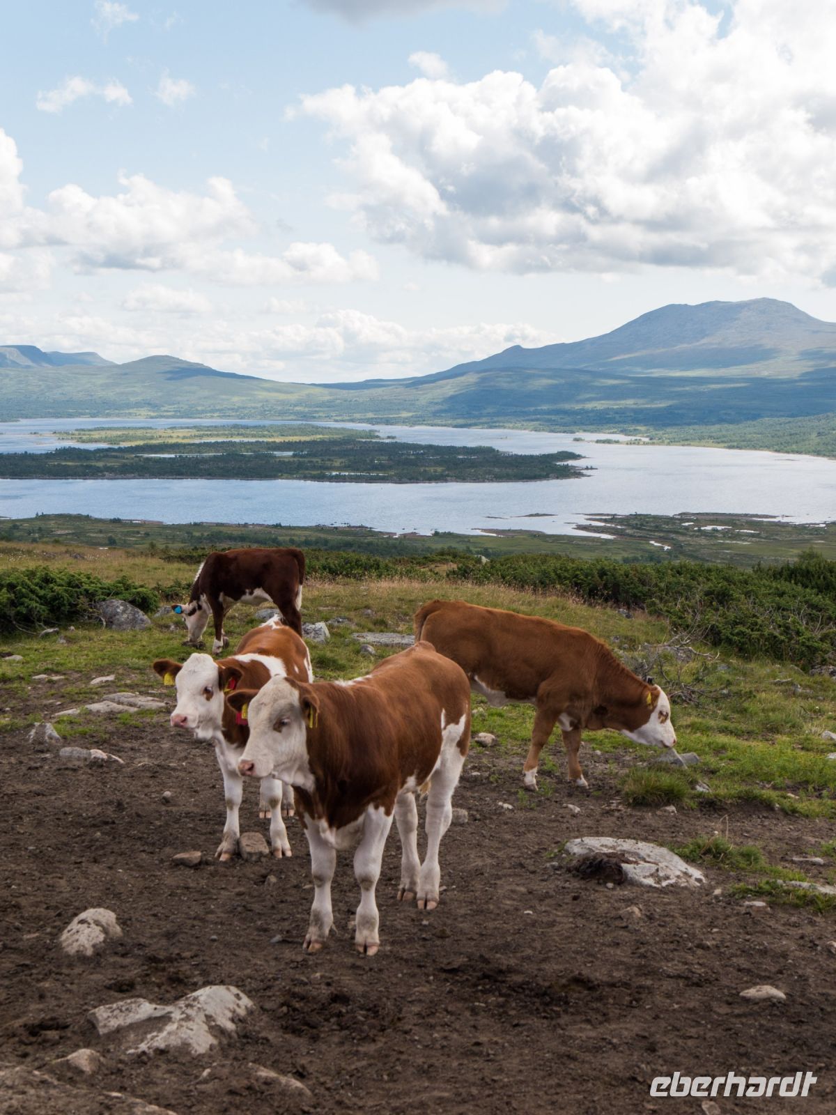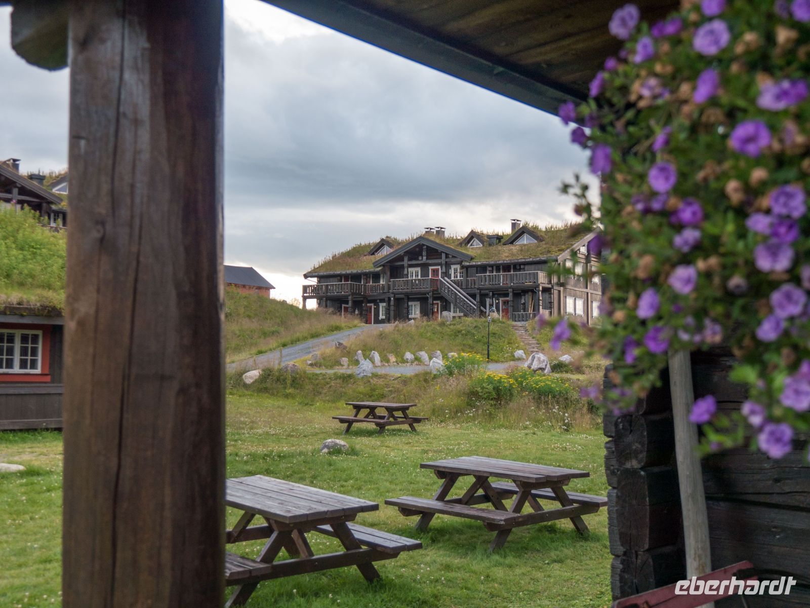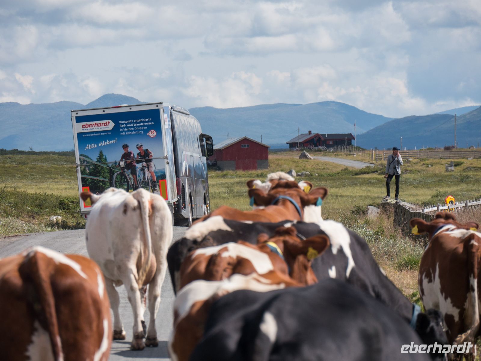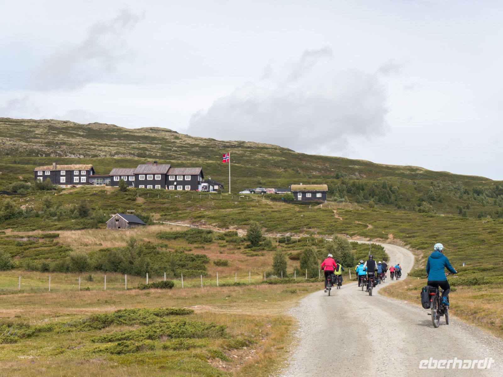Die Landschaft Valdres liegt mitten im Herzen von Süd-Norwegen, wird jedoch abgesehen vom norwegischen Wintersport häufig vernachlässigt. Zu Unrecht, denn es ist eine herrliche Gegend, die eine landschaftliche Vielfalt von bewaldeter und seenreicher Hügellandschaft im Süden bis zu den mächtigen Zweitausendern des Jotunheimen-Gebirges, dem „Heim der Riesen“, im Norden bietet – ein echter Geheimtipp unter Radurlaubern! Zunächst legen wir aber einen Fotostopp an der Stabkirche Hegge ein – eine von 28 noch gut erhaltenen Holzkirchen in Norwegen. Weiter geht es über den Wintersportort Beitostølen, wo wir unweit des Bygdin-Sees die Räder ausladen. Was für eine traumhafte Landschaft auf über 1.000 Meter Höhe! Auf den höher gelegenen Gipfeln liegt immer noch Schnee und die Seen glitzern um die Wette. Wir radeln entlang des Jotunheimvegen, einer wenig befahrenen Mautstraße durch die offene Berglandschaft mit Blick auf den Schmelzwassersee Vinstre. Es ist eine Teilstrecke des insgesamt 250 Kilometer langen Mjølkevegen und hier ist der Name tatsächlich Programm. Auf zahlreichen Almen wird immer noch Milchwirtschaft betrieben und so müssen wir den frei weidenden Kühen und Schafen entlang der Route immer wieder „Vorfahrt“ gewähren. Die typischen Holzhäuschen mit den Grasdächern säumen den Wegesrand ebenso wie lichte Birkenwäldchen. Unterwegs gönnen wir uns eine Rast in der urigen Haugseter Fjellstue, wo wir im Sonnenschein auf der Terrasse Elch-Burger und Pancakes mit Kaffee genießen… herrlich, (wenn auch nicht gerade preiswert)! Am Ende der Radtour haben wir 55 Kilometer auf dem Tacho und kommen glücklich am Treffpunkt in Skåbu an. Nun geht es mit dem Bus weiter zum Hotel, aber oh Schreck, eine Straßensperrung zwingt uns zu einem zweistündigen Umweg! Also kommen wir etwas später als erwartet auf dem Kvitfjell an. Wir sind tatsächlich die einzigen Gäste im Hotel. Die Aussicht ist wieder traumhaft, denn das Hotel liegt in einem beliebten Skigebiet hoch oberhalb des Gudbrandsdals.