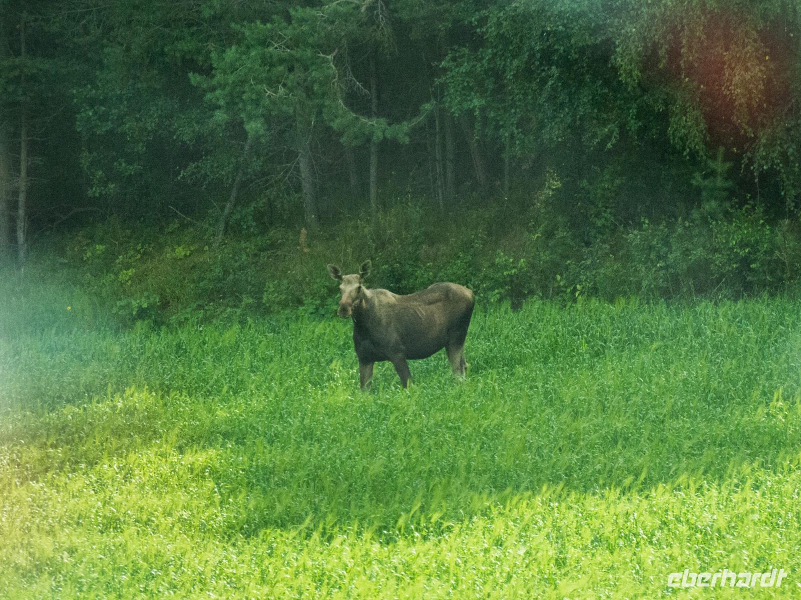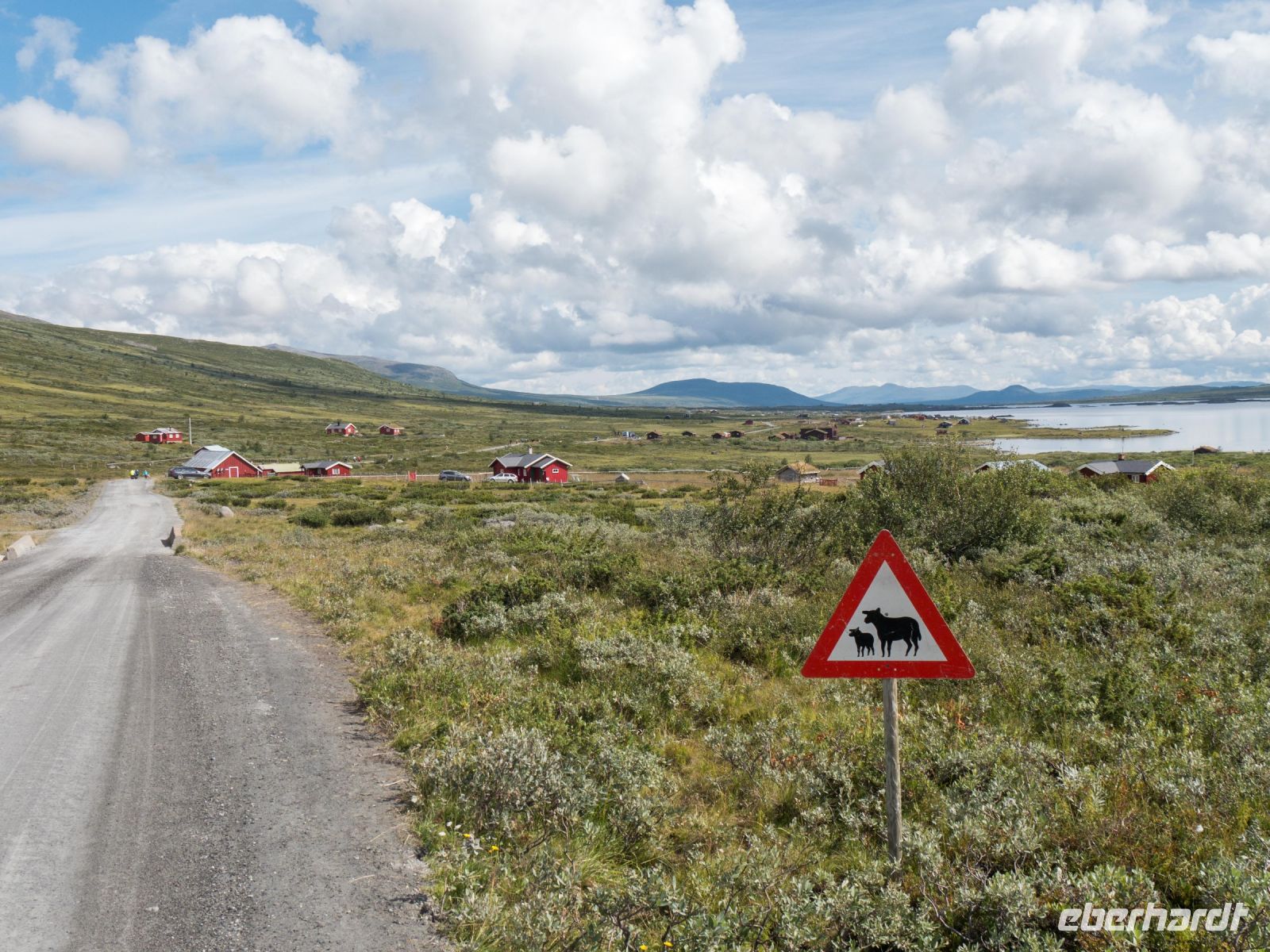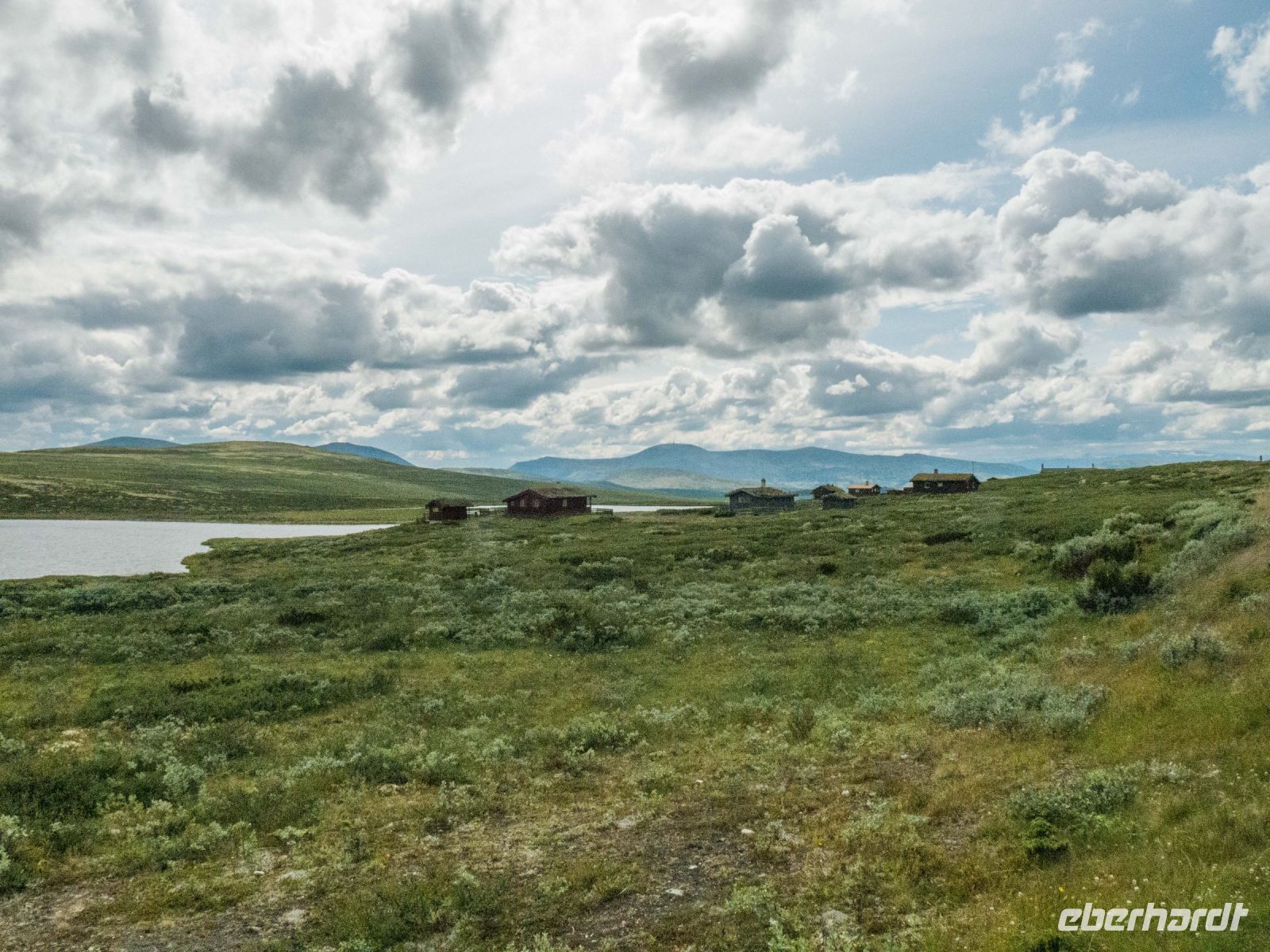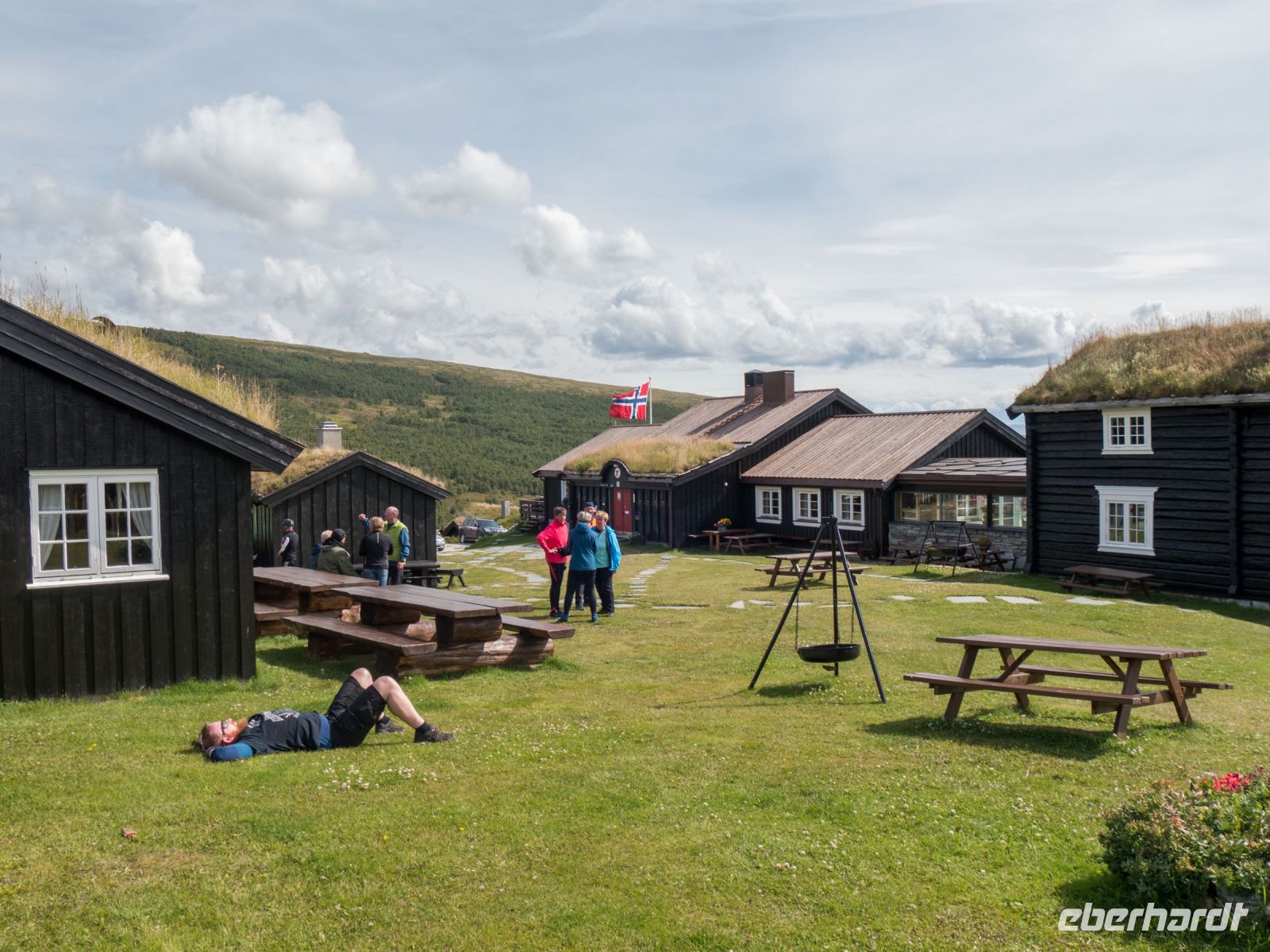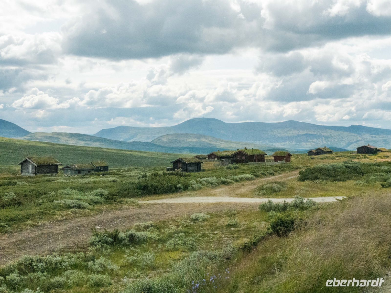 Auf unserer kurzen Fahrt mit dem Bus können wir Dank Perrys gutem Blick sogar Elche am Waldesrand beobachten – so geht der Tag schon mal gut los! Mit unseren E-Bikes begeben wir uns bald auf den zweiten Teil der "Tour de Dovre" durch das Grimsdalen, ein fruchtbares Tal mit Almwirtschaft zwischen dem Dovre- und dem Rondane-Nationalpark gelegen. Umgeben von herrlicher Natur radeln wir entspannt zur Grimsdalshytta, wo wir in gemütlicher Atmosphäre und mit einem herrlichen Ausblick typisch norwegische Waffeln mit Sahne und Marmelade schlemmen. Die Hütte liegt auf 1.000 Hm und bietet neben dem Café auch Übernachtungsmöglichkeiten für Wanderer und Radfahrer. Die historischen Gebäude mit den typischen Grasdächern spiegeln den Charme vergangener Tage wider und die fantastische Lage lädt zum Verweilen ein. Heute haben wir jedoch noch einiges vor, so dass wir uns mit den Rädern auf den weiteren Weg durch das Grimsdalen machen. Nach einem gemächlichen Anstieg - mit dem E-Bike gar kein Problem - legen wir auf der Anhöhe eine Pause ein und können den Blick zurück ins Tal genießen, durch das sich der Fluss Grimse schlängelt. Danach eröffnet sich eine weite Hochebene mit flacher Vegetation und einzelnen Almhütten. Über uns tanzen die Wolken am Himmel und vor uns eröffnet sich die weite Bergwelt Norwegens. Nur die wilden Rentiere zeigen sich leider nicht - überhaupt begegnen uns heute lediglich ein paar wenige Autos, Radfahrer und Kühe. Zum Ende der Tour haben wir noch etwa 8 Kilometer Abfahrt vor uns bis wir schließlich den kleinen Ort Dovre im nördlichen Gudbrandsdalen erreichen. Auf der kurzen Busfahrt nach Dombås posiert am Straßenrand noch ein Elch - was für ein Glück! In Dombås nehmen wir uns noch etwas Zeit zum Eis essen und bummeln und erreichen am am späten Nachmittag dann glücklich und zufrieden wieder unsere Hjerkinn Fjellstue.