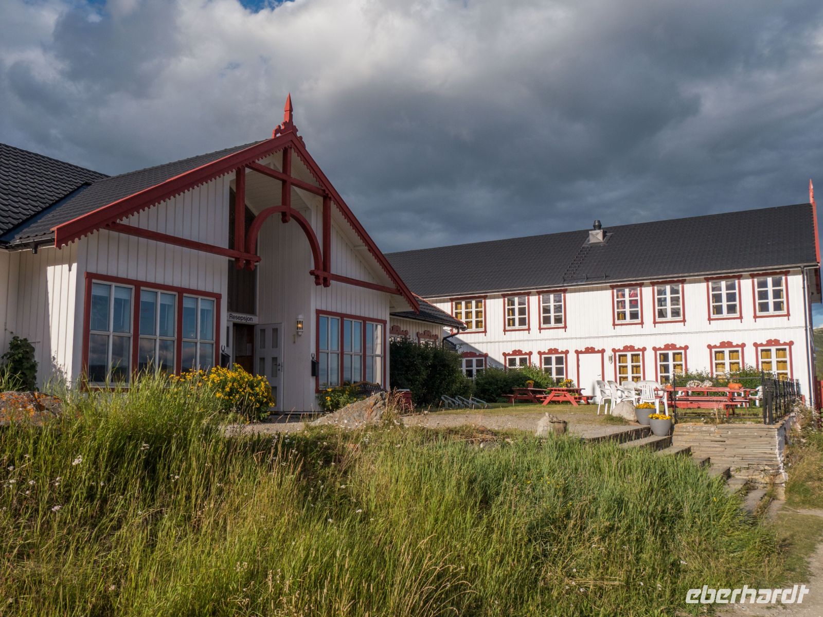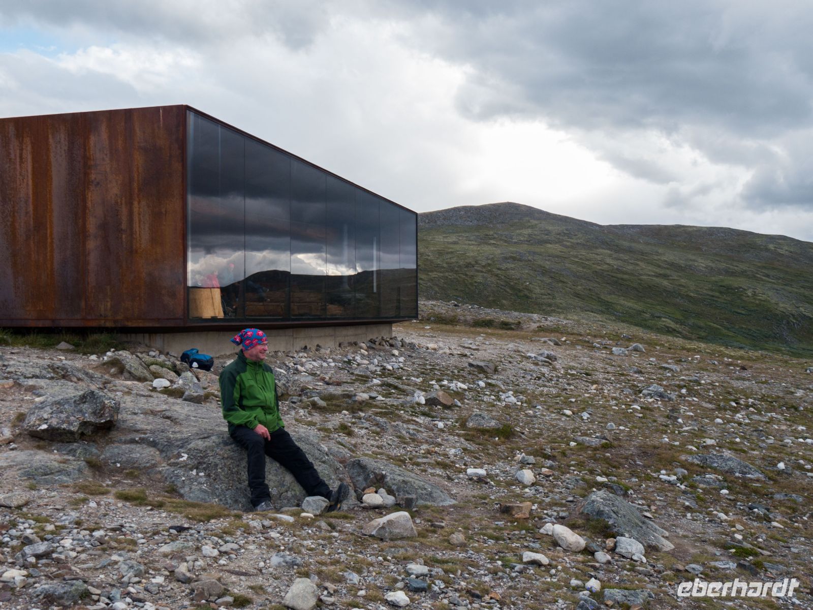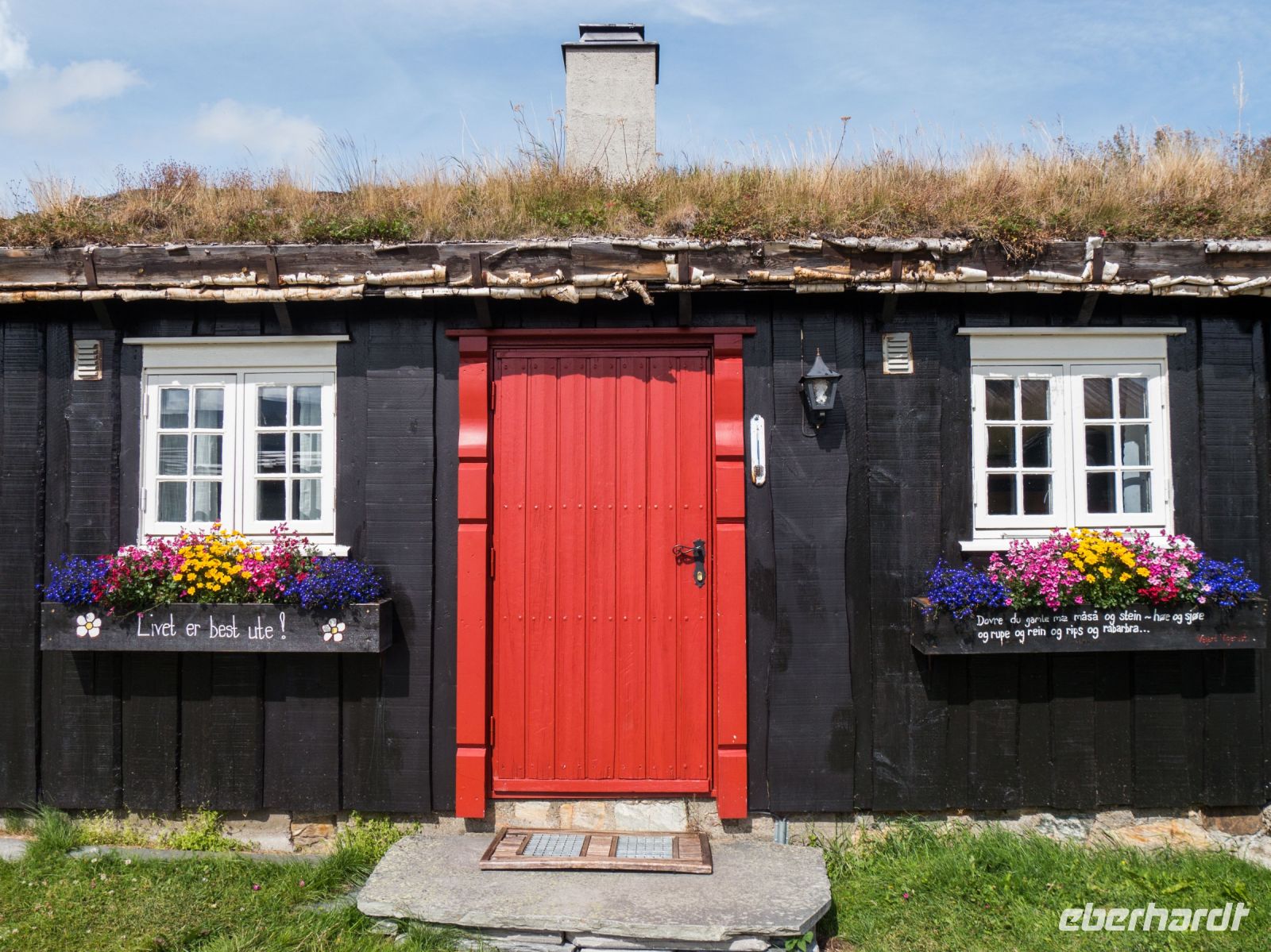 Wir fahren von "unserem Berg" hinab ins Gudbrandsdal und legen einen Halt an der schönen Stabkirche Ringebu ein. Der älteste Teil der Kirche stammt aus dem 13. Jahrhundert und wurde im sog. Drachenstil gestaltet, während das Querschiff und der rote Kirchturm bei Umbauten um 1630 errichtet wurden. Der gepflegte Friedhof und die hölzerne Kirche sind wahrlich eine Augenweide und ein Ort der Ruhe. Mit dem Bus fahren wir über Otta und Dovre nach Dombås, wo wir unsere zweite Radtour starten. Zunächst weiß das Wetter nicht so recht, was es will, aber im Großen und Ganzen haben wir wieder viel Glück und können eine abwechslungsreiche "Tour de Dovre" genießen. Wir radeln im leichten Auf und Ab durch das Dovrefjell. Der Radweg ist gesäumt mit Moosen und Flechten sowie Krüppelbirken und in der Ferne erheben sich die teils schneebedeckten Bergkuppen. An der Dovregubbens Hall machen wir Rast und begegnen hier sogar Trollen! Die Geschichten um diese Fabelwesen sind fest in der nordischen Mythologie verankert und für Besucher sind die Trolle ein beliebtes Souvenir. Bevor wir im Hotel einchecken, legen wir noch einen Endspurt mit dem Rad ein und begeben uns auf einen kleinen Spaziergang. Am Ende unserer leichten Wanderung erreichen wir den Snøhetta Viewpoint – ein Pavillon aus Stahl, Glas und Holz, der vom berühmten norwegischen Architekturbüro Snøhetta entworfen wurde. Das große Panoramafenster gibt den Blick frei auf die imposante Berglandschaft während man auf einer wellenförmigen Holzkonstruktion sitzt. Auch wenn sich der "Berg mit der Schneemütze" heute in Wolken hüllt, genießen wir den herrlichen Ausblick und können in der Ferne sogar einen einzelnen Moschusochsen erspähen. Das Dovrefjell ist einer der weltweit wenigen Orte, wo man die zotteligen Urtiere in der Wildnis zu Gesicht bekommt. Die bis zu 400 Kilogramm schweren Tiere sind entfernte Verwandte der Ziegen und als Überlebende der letzten Eiszeit bestens an große Kälte angepasst. Für die nächsten zwei Tage wohnen wir in schönem norwegischen Ambiente in der Hjerkinn Fjellstue – das ist wie Urlaub auf dem Bauernhof :-).