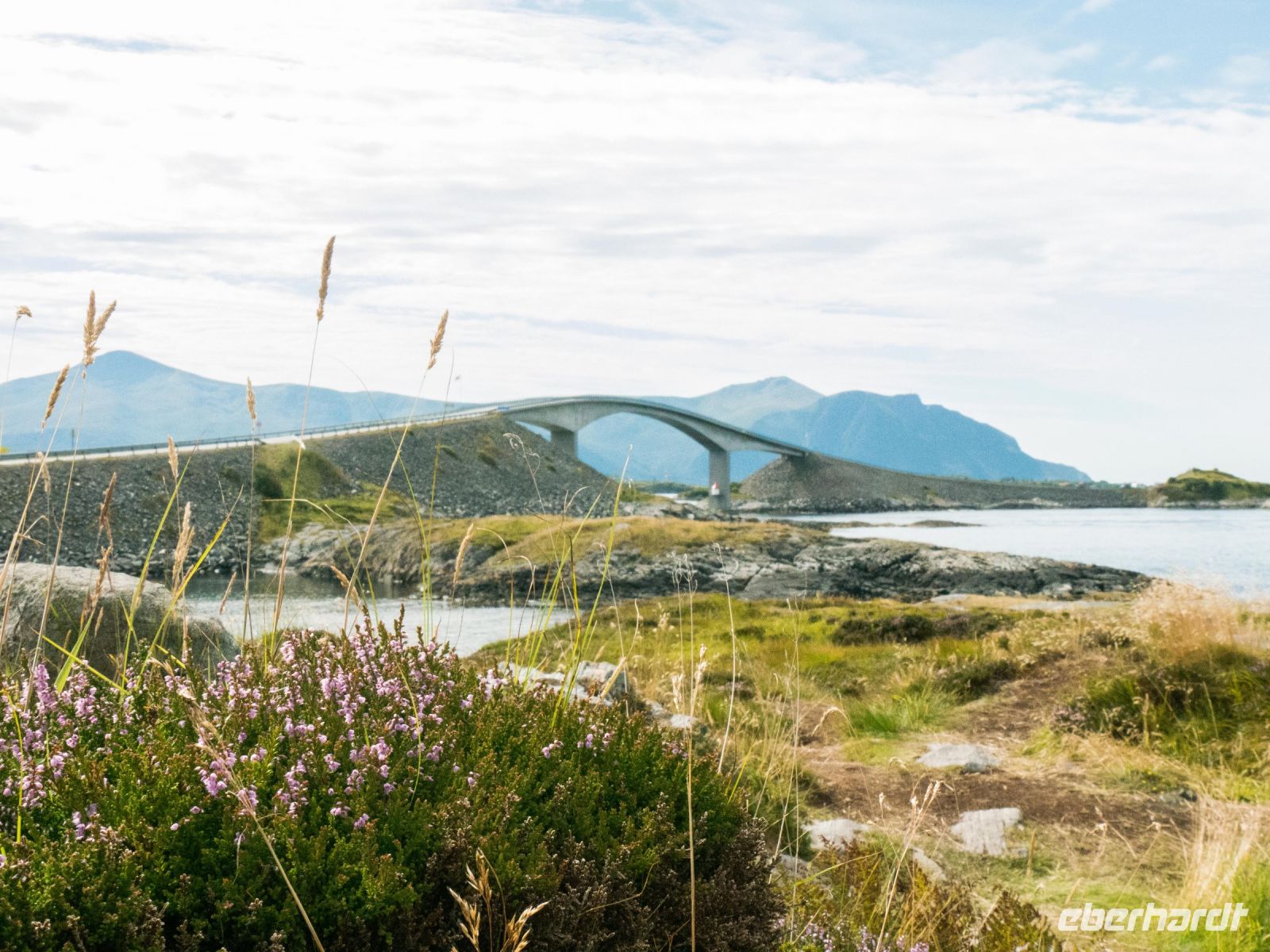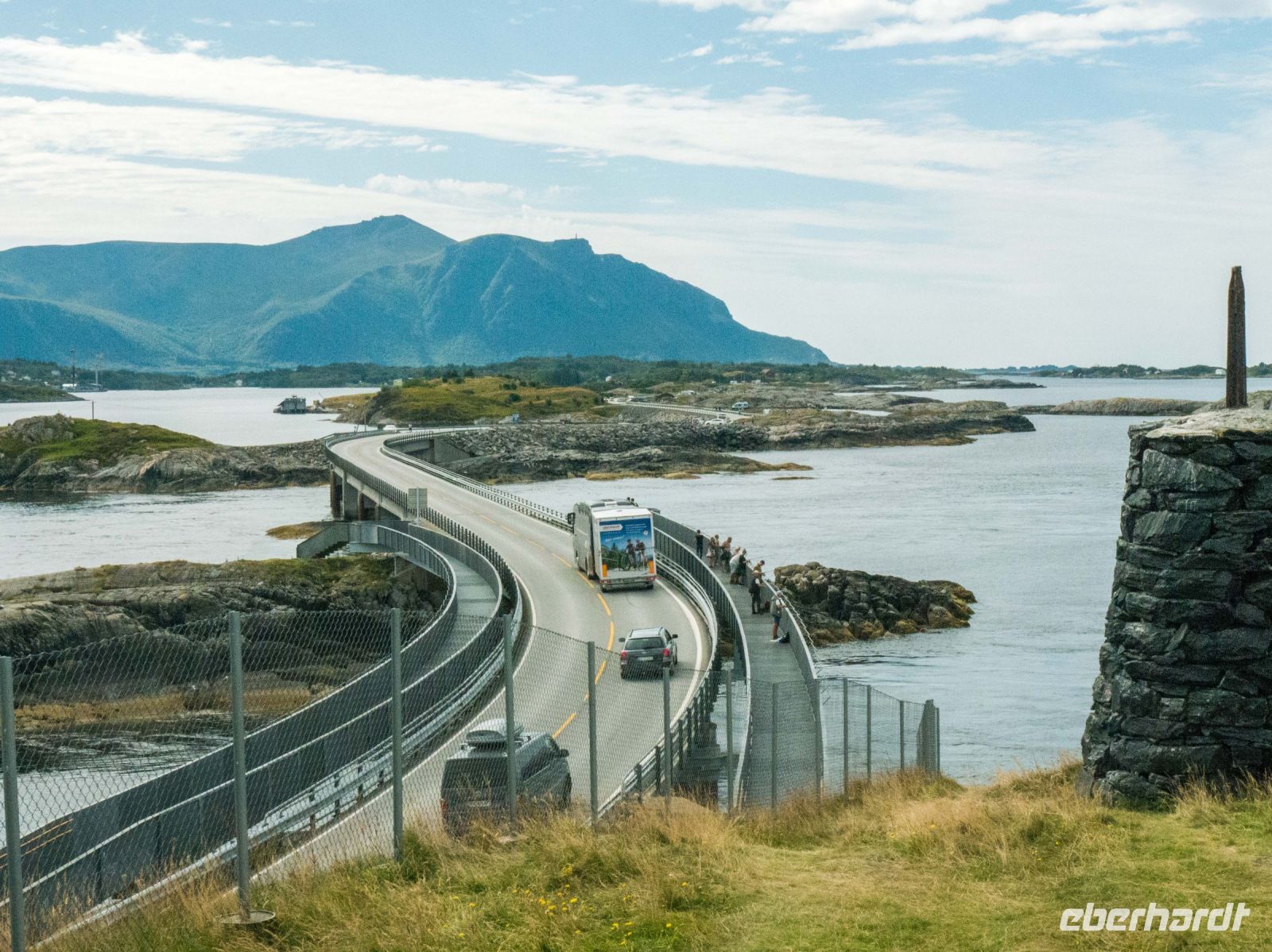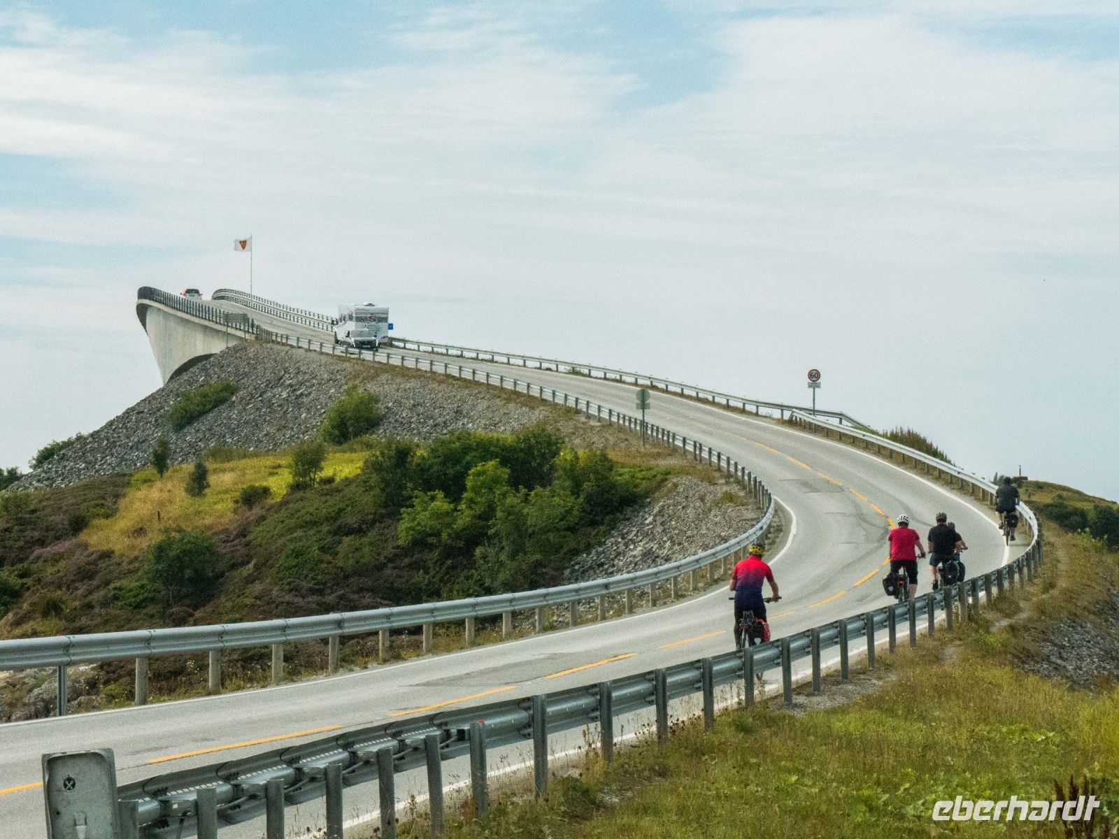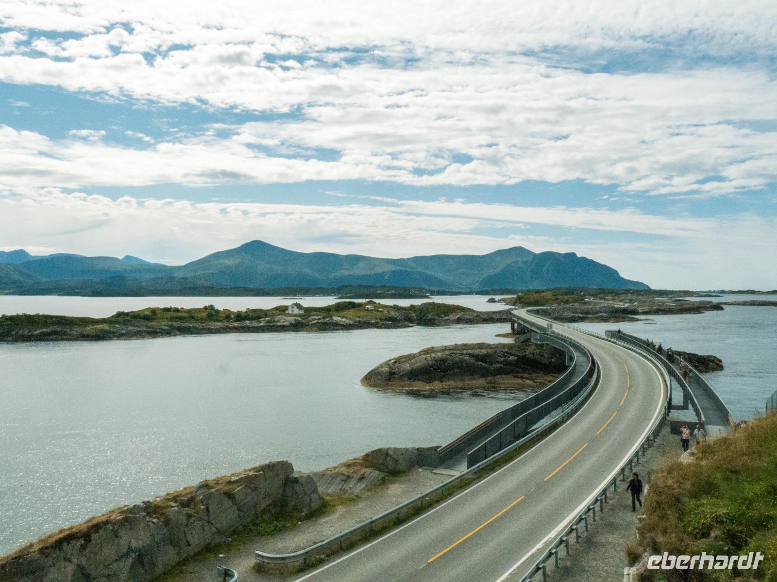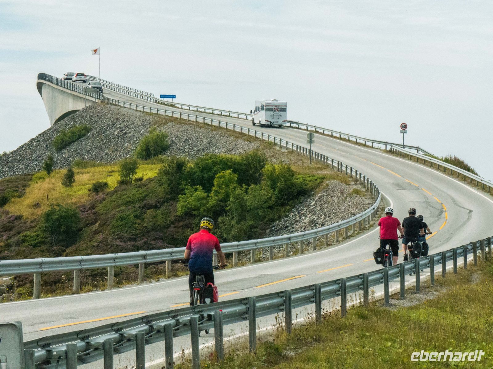 Der Morgen ist etwas verregnet, aber laut Wettervorhersage fahren wir dem Regen davon und der Sonne entgegen. Tief hängen die Wolken an den Berghängen und zaubern eine mystische Stimmung. Mit dem Bus fahren wir entlang des Lachsflusses Driva in nördlicher Richtung nach Oppdal, wobei wir die mittelnorwegische Provinz (Fylke) Trøndelag durchqueren. Hier wendet sich die Route gen Westen und damit zur Küste. Durch das Sunndalen gelangen wir in die Provinz Møre og Romsdal, wo wir alsbald den Vinnufossen bestaunen - ein richtiger Superlativ und (be)rauschendes Naturschauspiel, denn es handelt sich mit 860 Metern Höhe um den sechsthöchsten Wasserfall der Welt! Nun ist das Meer nicht mehr weit: Am Ende des Sunndalen mündet der Fluss Driva in den Tingvollfjord, der sich weit ins Landesinnere einschneidet. Am späten Vormittag erreichen wir die Küstenstadt Kristiansund, wo es am heutigen Sonntag sehr ruhig zugeht. Die fischreichen Gewässer vor Norwegens Küste sind seit jeher ein wichtiger Wirtschaftsfaktor. Der gefangene Kabeljau wurde in dieser Region traditionell ausgenommen, gesalzen und in der Sonne auf den Klippen getrocknet. Wenn man also in Spanien oder Portugal Bacalao bzw. Bacalhao bekommt, handelt es sich um den Klippfisch von hier und nicht um den Stockfisch aus Nord-Norwegen! Nach einem kurzen Spaziergang zur Klippfischfrau am Hafen von Kristiansund fahren wir mit dem Bus durch den Atlantiktunnel zum Ausgangspunkt unserer Radtour. Die Norwegische Landschaftsroute Atlanterhavsvegen verläuft auf 36 Kilometern zwischen Kårvåg und Bud, wobei sich die ersten 8 Kilometer spektakulär über sieben Brücken zwischen Holmen und Schären entlang schlängeln. Die eindrucksvollste von ihnen ist wohl die geschwungene Storseisund-Brücke, die gleichzeitig das Wahrzeichen der Strecke ist. Vom Rundweg auf der Insel Eldhusøya können wir tolle Fotos von der Brücke machen. Die Atlantikstraße ist die einzige Radtour, wo wir – abgesehen von den Citytouren – etwas mehr auf den Straßenverkehr achten müssen, denn die spektakuläre Route wurde nicht nur zur schönsten Radstrecke Norwegens gekürt, sondern auch zur schönsten Autostrecke der Welt! Darüber hinaus rühmt sich die einzigartige „Straße durch‘s Meer“ auch als „Norwegens Bauwerk des 20. Jahrhunderts“. Nach dem Überqueren der sieben Brücken bewegen wir uns wieder auf wenig befahrenen Nebenstraßen und können so die idyllische Küsten- und Heidelandschaft genießen. Auch wenn es kaum Anstiege gibt, weht uns zeitweise doch ein kräftiger Küstenwind entgegen. Dank E-Bike ist das zum Glück gar kein Problem. An der Kirche in Bud verladen wir schließlich die Räder und rollen vorbei an Molde zum Fähranleger von Sølsnes. Wieder einmal eine Punktlandung! Auf der kurzen Fährüberfahrt über den Romsdalsfjord können wir schon den Ausblick auf das Alpenpanorama genießen – ein Tag voller Kontraste zwischen Bergen und Meer! In der Alpenstadt Åndalsnes beziehen wir schließlich unser komfortables Hotel und stoßen hier auf eine Besonderheit: Im Hafen liegen gleich zwei Hurtigruten-Schiffe – das ist nicht nur an sich ungewöhnlich, sondern auch weil Åndalsnes regulär gar nicht auf der Postschiff-Route liegt. Es stellt sich heraus, dass die Schiffe als Hotelschiffe für die Film-Crew von „Mission Impossible 7“ dienen. Die spektakulären Landschaften der Provinz Møre og Romsdal bilden die Kulisse für diesen hochkarätigen Blockbuster - ein Hauch von Hollywood mitten in Norwegen. Wo ist bloß Tom Cruise?!