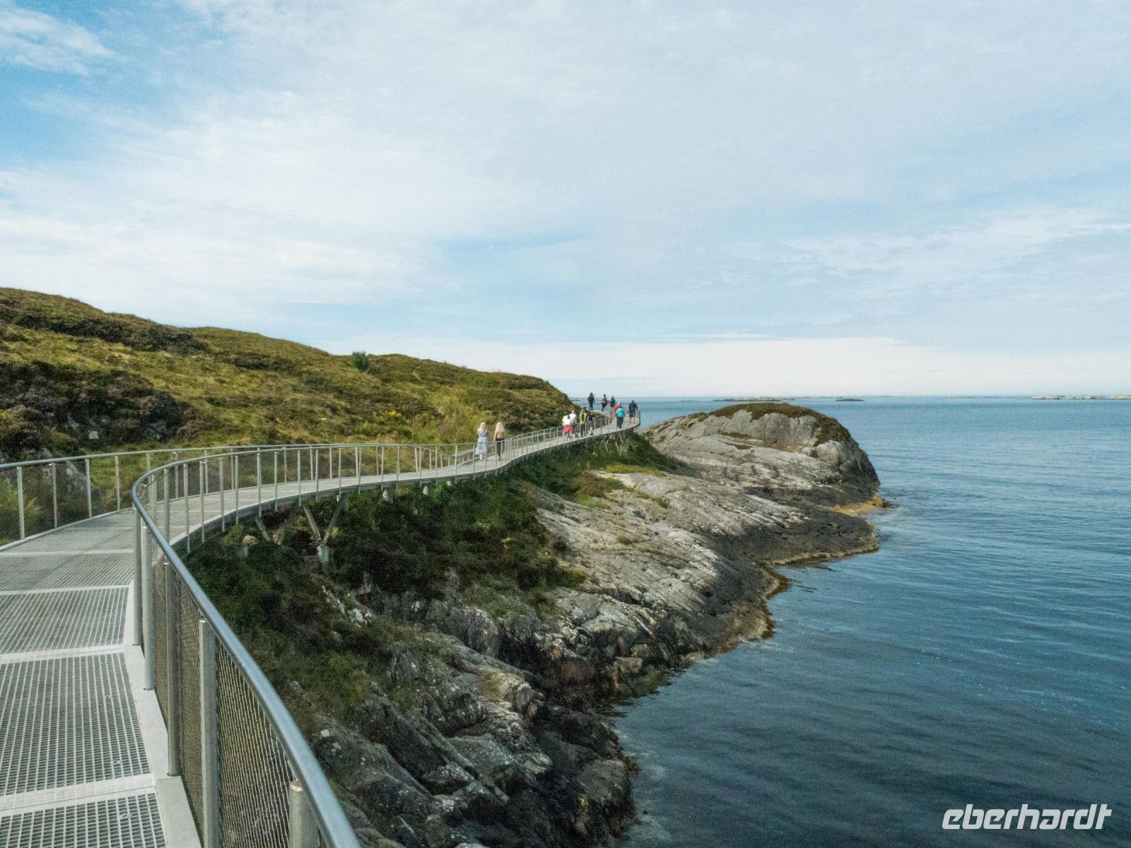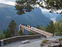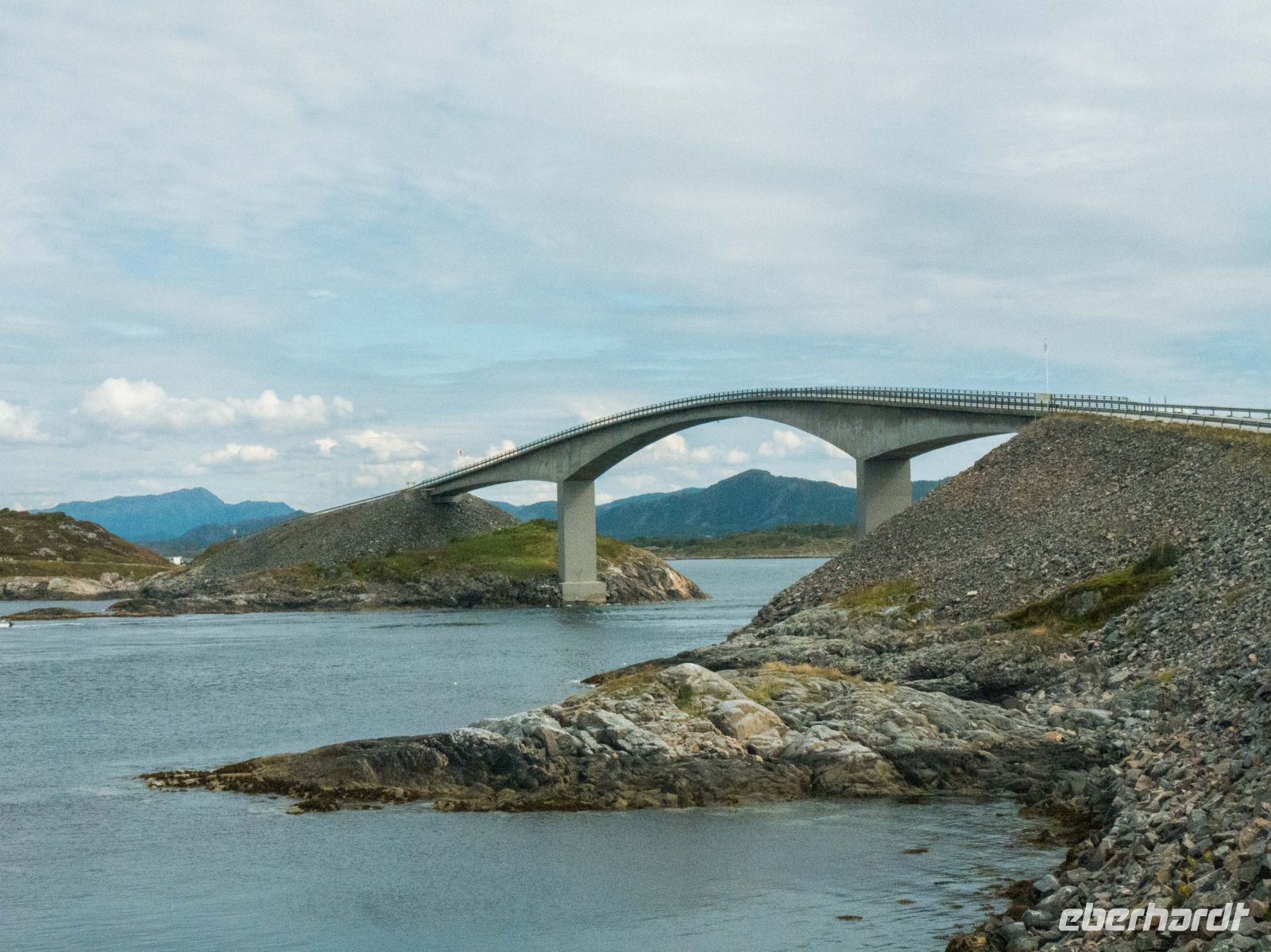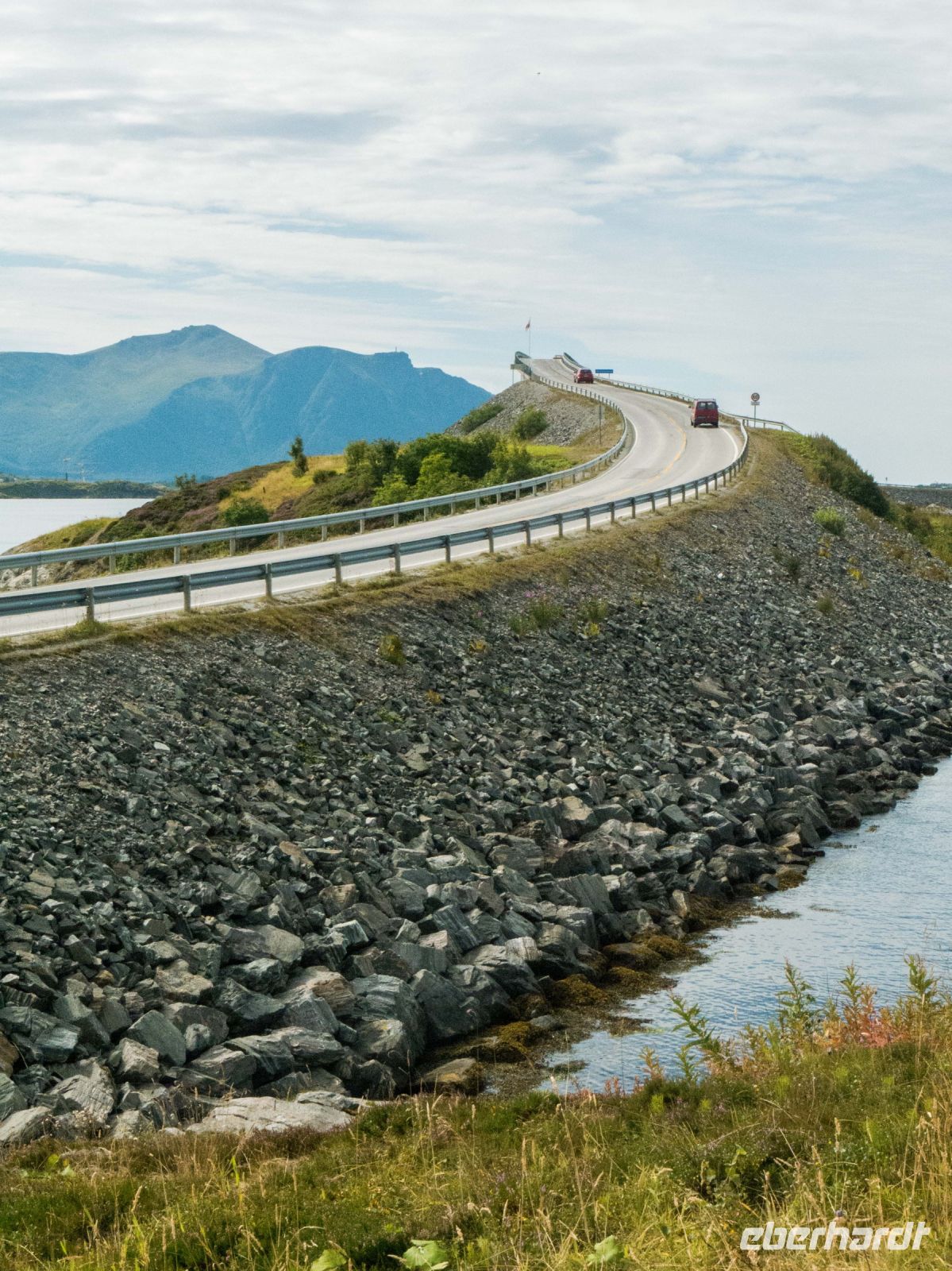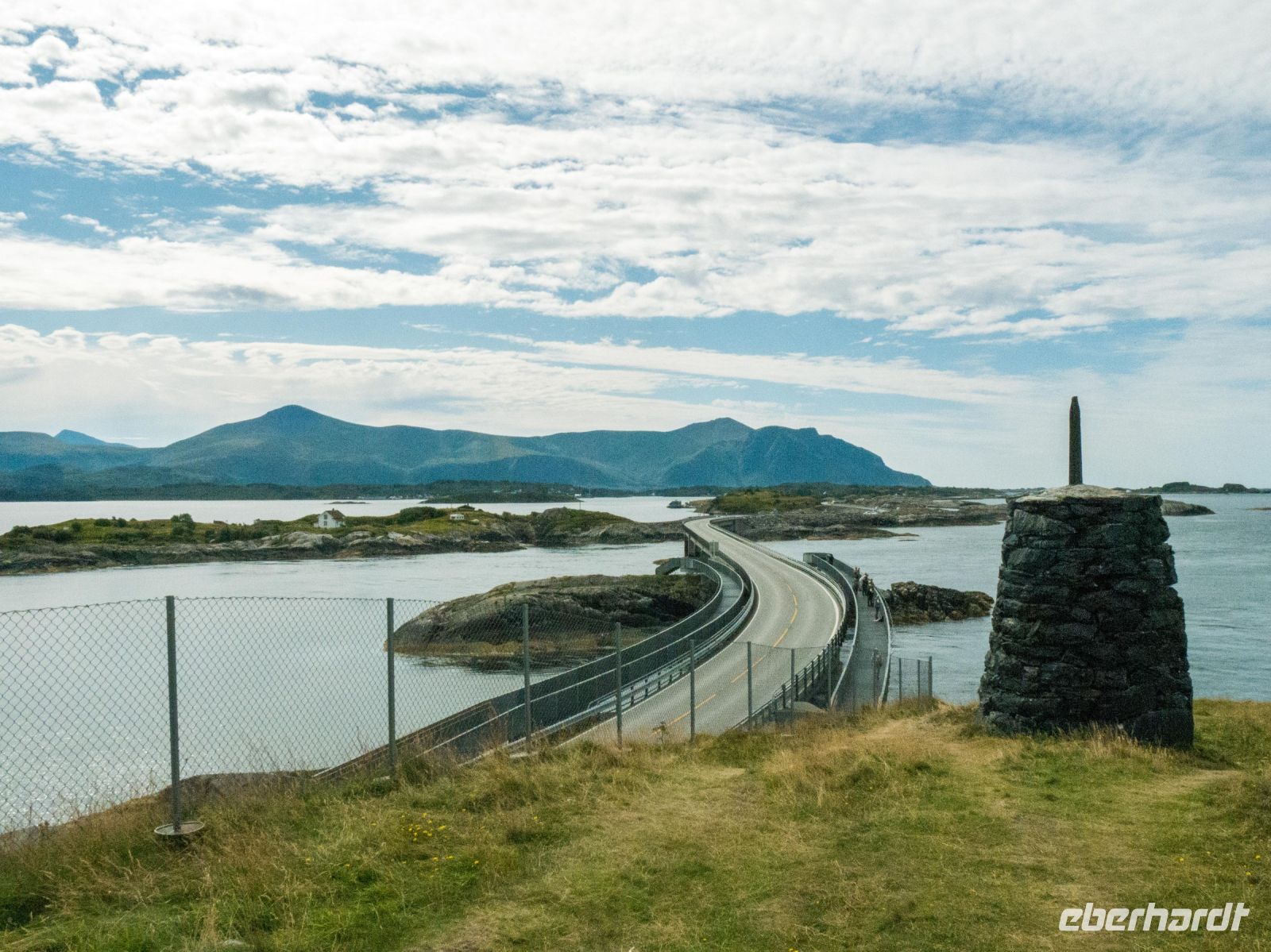 Der Morgen ist etwas verregnet, aber laut Wettervorhersage fahren wir dem Regen davon und der Sonne entgegen. Tief hängen die Wolken an den Berghängen und zaubern eine mystische Stimmung. Mit dem Bus fahren wir entlang des Lachsflusses Driva in nördlicher Richtung nach Oppdal, wobei wir die mittelnorwegische Provinz (Fylke) Trøndelag durchqueren. Hier wendet sich die Route gen Westen und damit zur Küste. Durch das Sunndalen gelangen wir in die Provinz Møre og Romsdal, wo wir alsbald den Vinnufossen bestaunen - ein richtiger Superlativ und (be)rauschendes Naturschauspiel, denn es handelt sich mit 860 Metern Höhe um den sechsthöchsten Wasserfall der Welt! Nun ist das Meer nicht mehr weit: Am Ende des Sunndalen mündet der Fluss Driva in den Tingvollfjord, der sich weit ins Landesinnere einschneidet. Am späten Vormittag erreichen wir die Küstenstadt Kristiansund, wo es am heutigen Sonntag sehr ruhig zugeht. Die fischreichen Gewässer vor Norwegens Küste sind seit jeher ein wichtiger Wirtschaftsfaktor. Der gefangene Kabeljau wurde in dieser Region traditionell ausgenommen, gesalzen und in der Sonne auf den Klippen getrocknet. Wenn man also in Spanien oder Portugal Bacalao bzw. Bacalhao bekommt, handelt es sich um den Klippfisch von hier und nicht um den Stockfisch aus Nord-Norwegen! Nach einem kurzen Spaziergang zur Klippfischfrau am Hafen von Kristiansund fahren wir mit dem Bus durch den Atlantiktunnel zum Ausgangspunkt unserer Radtour. Die Norwegische Landschaftsroute Atlanterhavsvegen verläuft auf 36 Kilometern zwischen Kårvåg und Bud, wobei sich die ersten 8 Kilometer spektakulär über sieben Brücken zwischen Holmen und Schären entlang schlängeln. Die eindrucksvollste von ihnen ist wohl die geschwungene Storseisund-Brücke, die gleichzeitig das Wahrzeichen der Strecke ist. Vom Rundweg auf der Insel Eldhusøya können wir tolle Fotos von der Brücke machen. Die Atlantikstraße ist die einzige Radtour, wo wir – abgesehen von den Citytouren – etwas mehr auf den Straßenverkehr achten müssen, denn die spektakuläre Route wurde nicht nur zur schönsten Radstrecke Norwegens gekürt, sondern auch zur schönsten Autostrecke der Welt! Darüber hinaus rühmt sich die einzigartige „Straße durch‘s Meer“ auch als „Norwegens Bauwerk des 20. Jahrhunderts“. Nach dem Überqueren der sieben Brücken bewegen wir uns wieder auf wenig befahrenen Nebenstraßen und können so die idyllische Küsten- und Heidelandschaft genießen. Auch wenn es kaum Anstiege gibt, weht uns zeitweise doch ein kräftiger Küstenwind entgegen. Dank E-Bike ist das zum Glück gar kein Problem. An der Kirche in Bud verladen wir schließlich die Räder und rollen vorbei an Molde zum Fähranleger von Sølsnes. Wieder einmal eine Punktlandung! Auf der kurzen Fährüberfahrt über den Romsdalsfjord können wir schon den Ausblick auf das Alpenpanorama genießen – ein Tag voller Kontraste zwischen Bergen und Meer! In der Alpenstadt Åndalsnes beziehen wir schließlich unser komfortables Hotel und stoßen hier auf eine Besonderheit: Im Hafen liegen gleich zwei Hurtigruten-Schiffe – das ist nicht nur an sich ungewöhnlich, sondern auch weil Åndalsnes regulär gar nicht auf der Postschiff-Route liegt. Es stellt sich heraus, dass die Schiffe als Hotelschiffe für die Film-Crew von „Mission Impossible 7“ dienen. Die spektakulären Landschaften der Provinz Møre og Romsdal bilden die Kulisse für diesen hochkarätigen Blockbuster - ein Hauch von Hollywood mitten in Norwegen. Wo ist bloß Tom Cruise?!