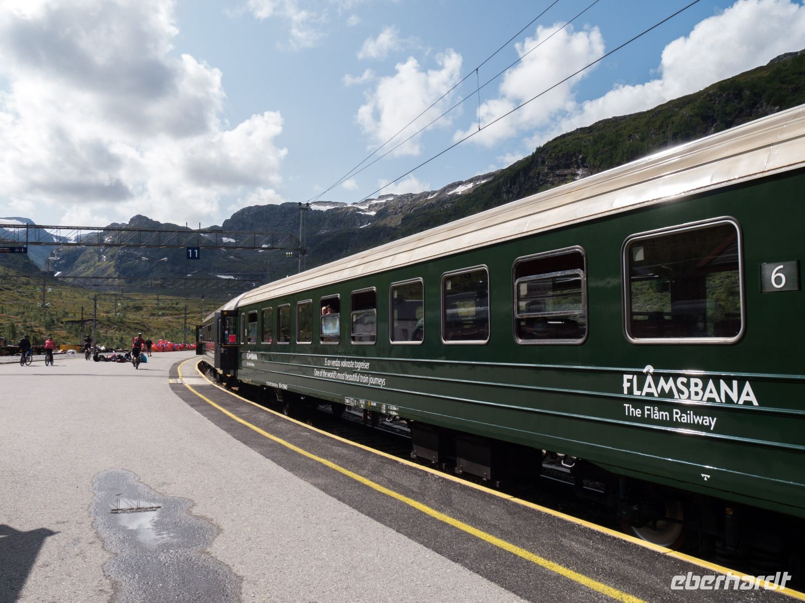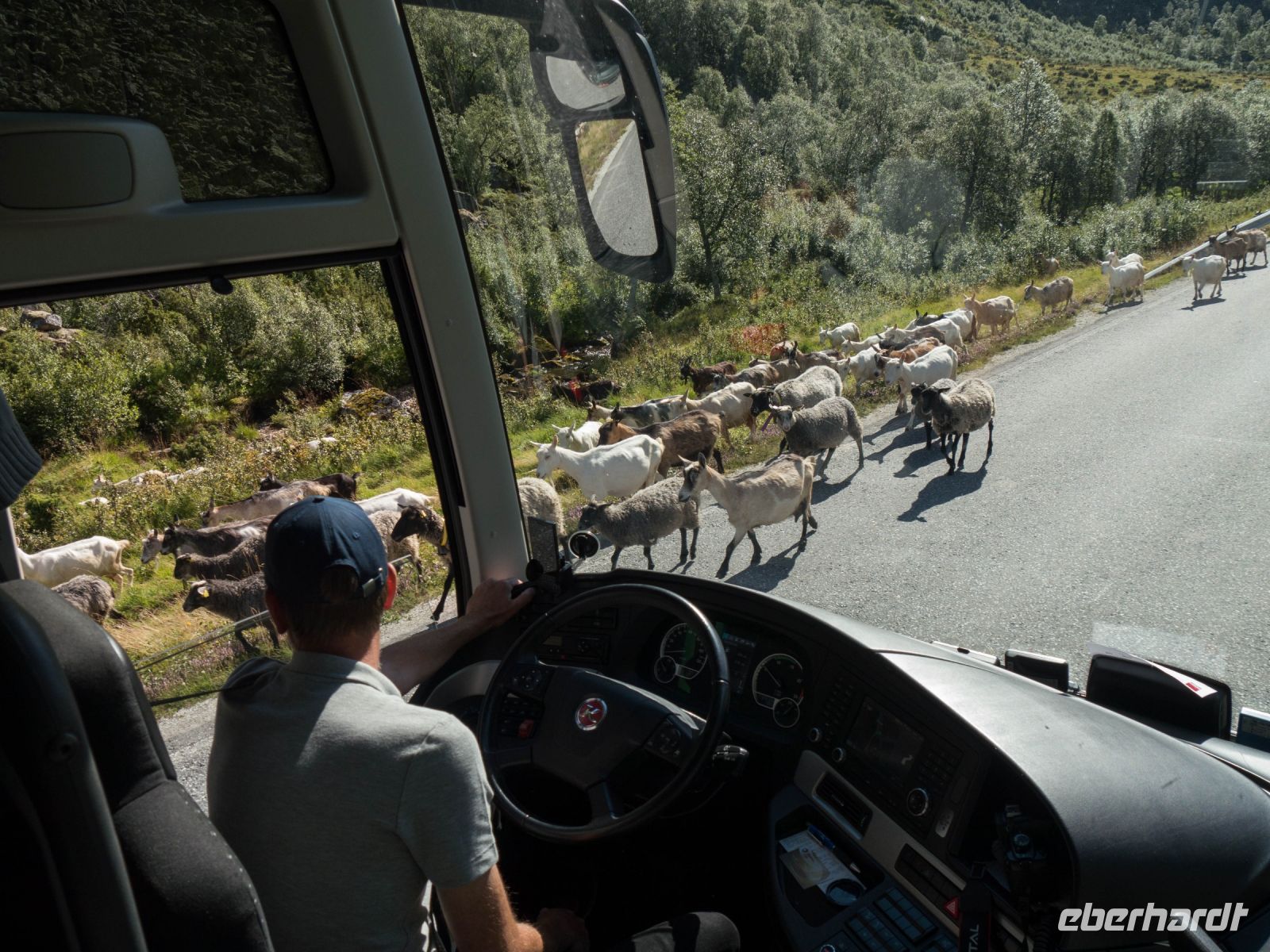 Nach einer ruhigen Überfahrt erreichen wir am Morgen bei schönstem Wetter den Oslofjord. An der engsten Stelle des Fjords passieren wir gegen 08.30 Uhr die Inseln Kaholmen mit der historischen Festungsanlage Oscarsborg. Bis wir pünktlich 10 Uhr in Oslo anlegen, genießen wir die Ausblicke auf die reich bewaldete Küste mit der lockeren Besiedlung. Auch das reichhaltige Frühstücksbuffet an Bord der Color Line bietet für jeden Geschmack das Richtige und so starten wir gestärkt in unseren ersten Norwegen-Tag. Bei der Einreise heißt es jedoch erst einmal: Geduld haben. Einige Reisegäste müssen sich dem obligatorischen Corona-Test unterziehen und das dauert… Mit etwas Verzögerung heißt es dann endlich „Willkommen in Norwegen!“. An der Festung Akershus treffen wir unsere örtliche Reiseleiterin Arlene, die uns per Bike durch die norwegische Hauptstadt führt. Erst einmal werden die Räder ausgeladen, verteilt, erklärt und eingestellt. Nach ein-zwei Proberunden ist man schnell mit der Technik vertraut und wir können los radeln. Die Stadt Oslo hat in den letzten Jahren viel getan, um die Innenstadt verkehrsberuhigt zu gestalten, d. h. für uns Radfahrer sehr gute Bedingungen, um die Sehenswürdigkeiten Oslos zu erkunden. Ein Wahrzeichen der Stadt ist die strahlend weiße Oper aus italienischem Carrara-Marmor (90%), die gestalterisch einem treibenden Eisberg nachempfunden wurde. Wir radeln weiter vorbei am Parlamentsgebäude und über die Karls Johans gate bis zum Königlichen Schloss. Den nächsten Halt legen wir im Vigelandpark ein, wo wir die Skulpurenvielfalt bestaunen. Leider bleibt zu wenig Zeit um uns allen über 200 Kunstwerken zuzuwenden, aber einen kleinen Eindruck vom Lebenswerk Gustav Vigelands bekommen wir doch. Auf dem Weg zu den Mathallen überrascht uns entgegen der Wettervorhersage schließlich ein Regenguss, so dass wir Oslo Adé sagen und uns bald darauf der herrlichen Landschaft von Valdres zuwenden. Mit dem Reisebus und unserem Eberhardt-Radanhänger im Schlepptau reisen wir weiter in Richtung Norden, vorbei am Tyrifjord und durch die Kleinstadt Fagarnes gelangen wir schließlich auf abgelegenen Pfaden zu unserer gemütlichen Unterkunft „Gomobu Fjellstue“ hoch oben auf dem Fjell. Neben der Ruhe der Natur genießen wir das typisch norwegische Ambiente und können vor der Haustür Blaubeeren naschen.