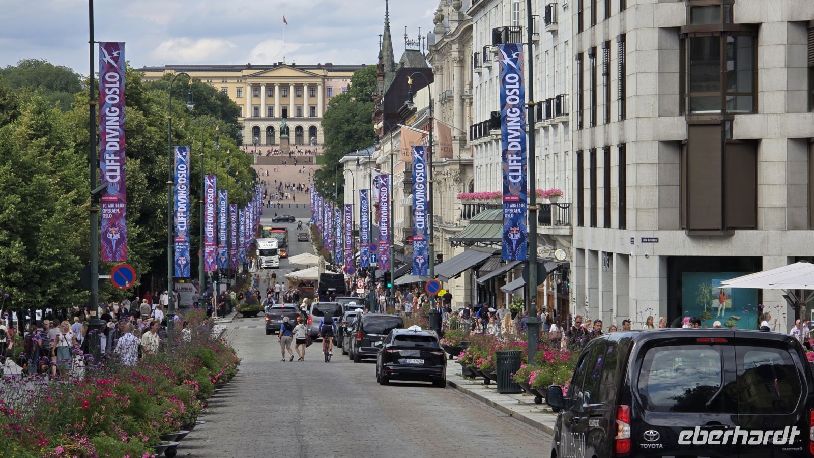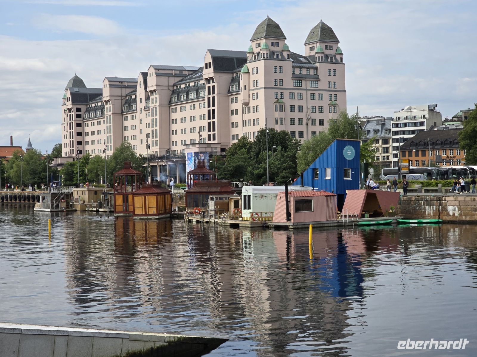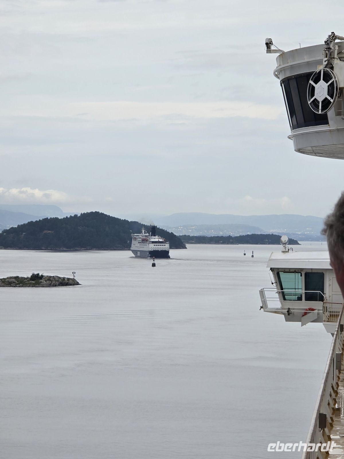 Nach dem Genuss des großen Frühstücksbuffets auf unserer Fähre begeben wir uns wieder aufs Sonnendeck um die spannende Einfahrt durch das Oslofjord zu genießen. Je näher wir ein Oslo heran fahren umso schmäler wird der Fjord. die kleinen Schäreninseln rücken immer näher an uns heran. Man kann sich gut vorstellen das man hier das Wochenende oder den Urlaub wunderschön verbringen kann, abgetrennt von schnellen Besuchen, nur über das Wasser erreichbar zu sein gibt sicher eine Tiefe innere Ruhe. Heute Morgen ist schon reger Schiffsverkehr im Oslofjord eine Fähre fährt uns voraus, eine andere hat schon abgelegt und verlässt das Fjord. Am Horizont über Oslo gelegen sehen wir die hohen Berge des Holmenkollen, ein schönes Naherholungsgebiet und Sportanlagen für Sommer und Winter.