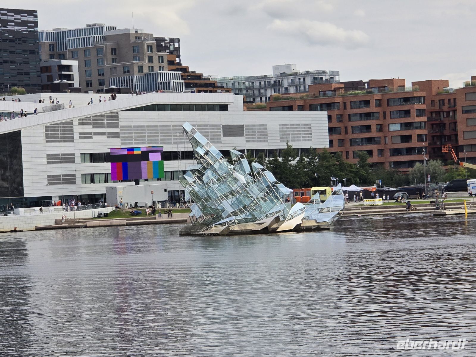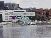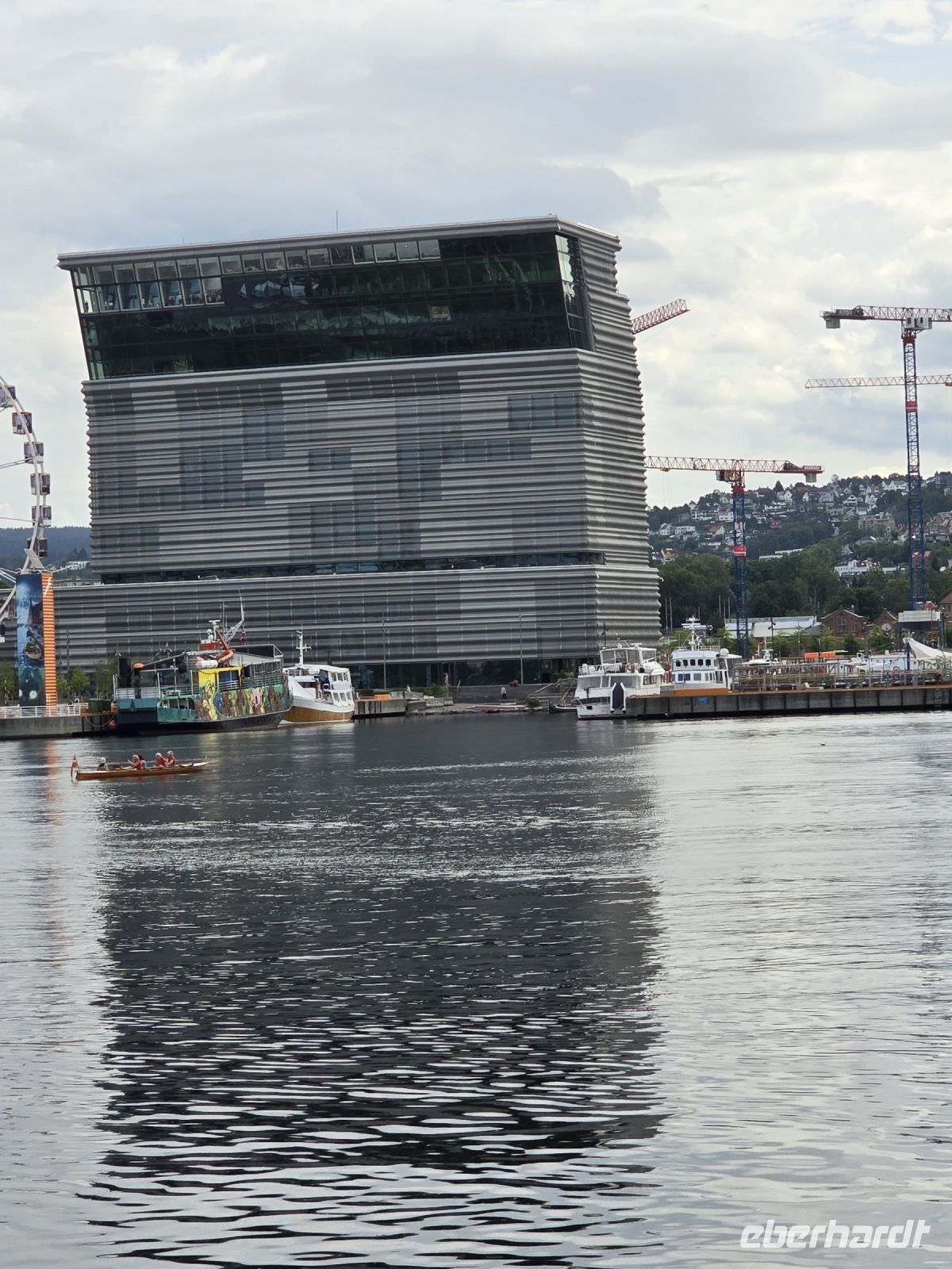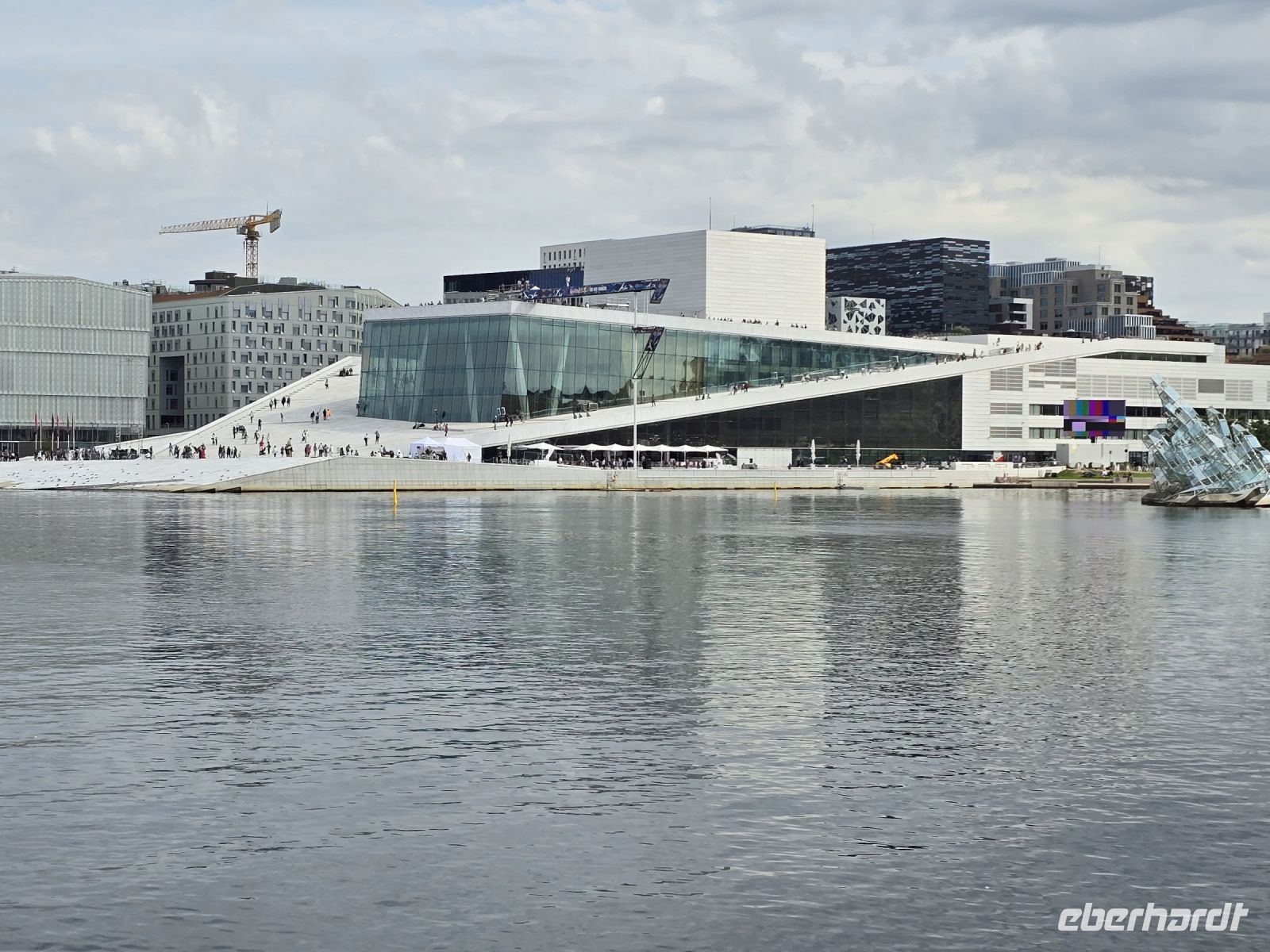 Unser erstes Ziel das wir mit den Fahrrädern ansteuerten war die neue Oper und die daneben liegende Bibliothek von Oslo. Der Bibliothek machten wir einen kurzen Besuch und schauten die schöne offene Architektur an. Der Ort ist weit mehr als nur eine Bücherkammer, hier gibt es Kaffeeecken, Arbeitstische mit schnellem Internetzugang Und ist ein Treffpunkt für kleine Gruppen die gemeinsam diskutieren. Daneben die Oper schauen wir nur von außen an gehen die schräg verlaufende Dachkonstruktion empor und tun genau das wofür der Architekt diese Konstruktion gewählt hat. Die Oper soll begreifbare und begehbar sein nicht etwas Abgehobenes für nur wenige der Bevölkerung. Darüber hinaus hat das Architekturbüro "Snøhetta" das Gebäude der Oper einem Eisberg nachempfunden. Auf dem Wasser vor der Oper ist eine Skulptur die ebenfalls durch eine Glas Metall-Konstruktion einen Eisberg darstellt.