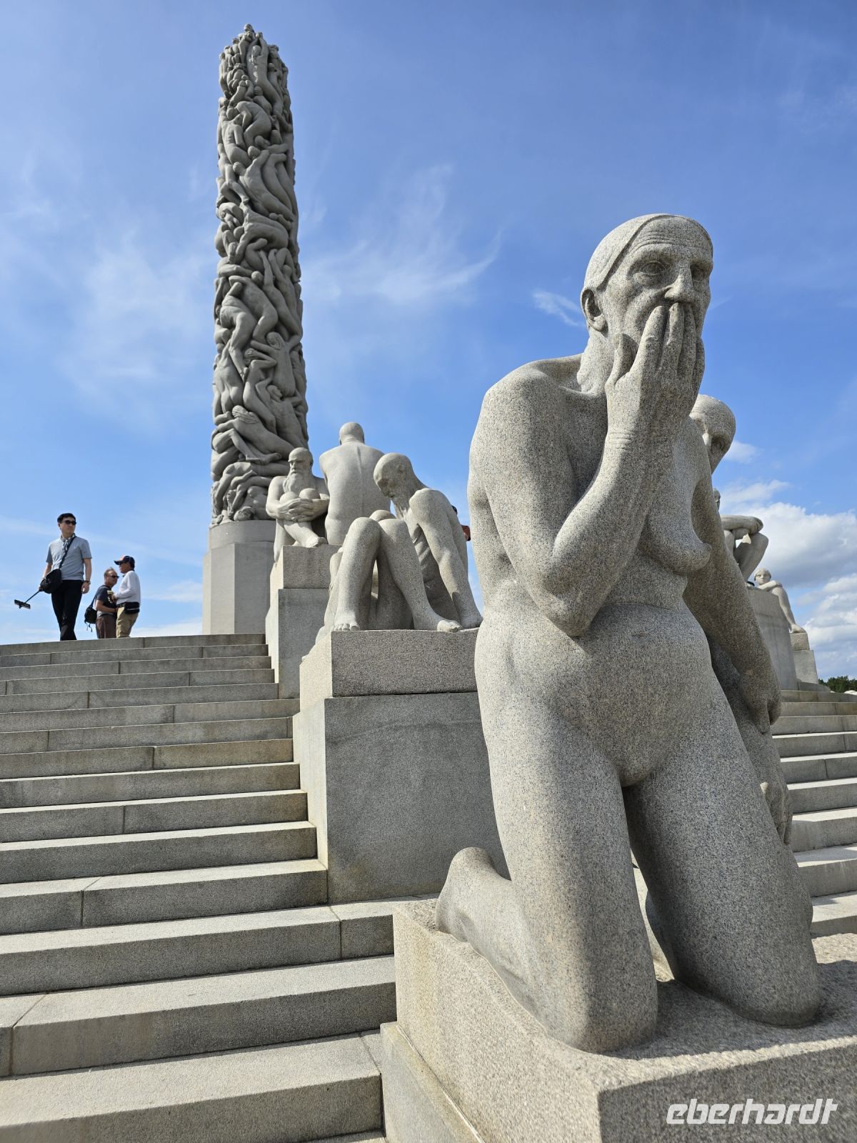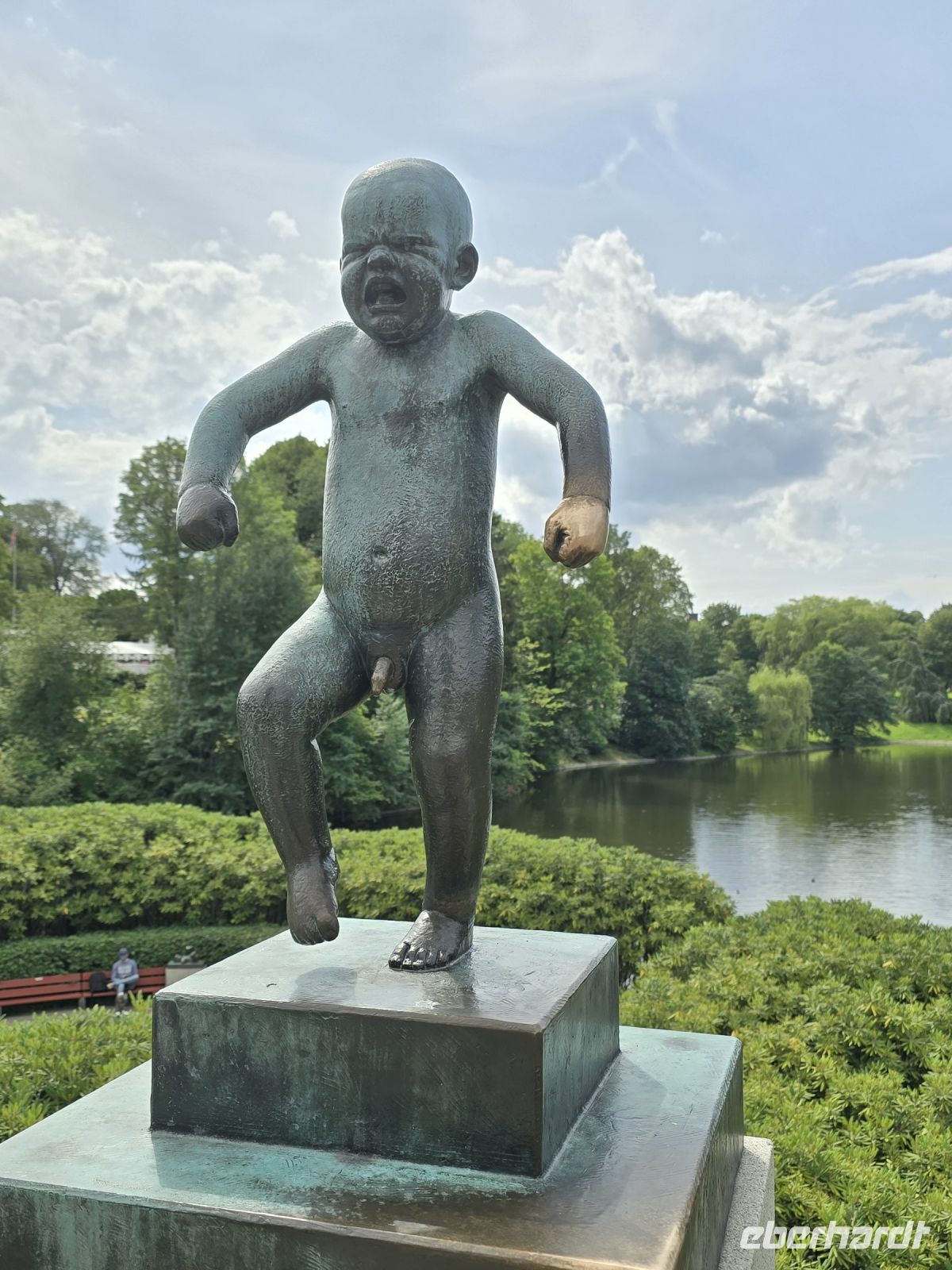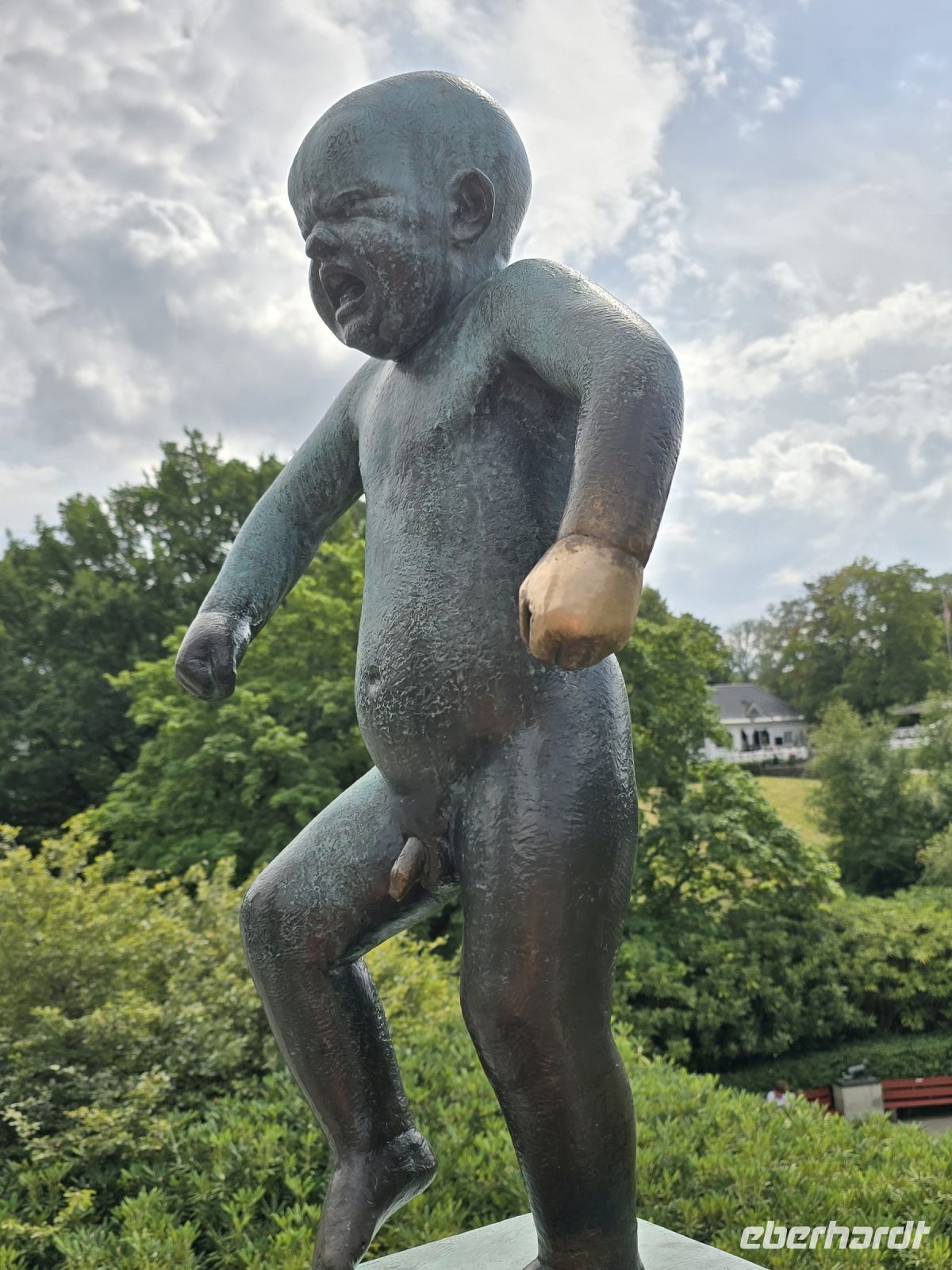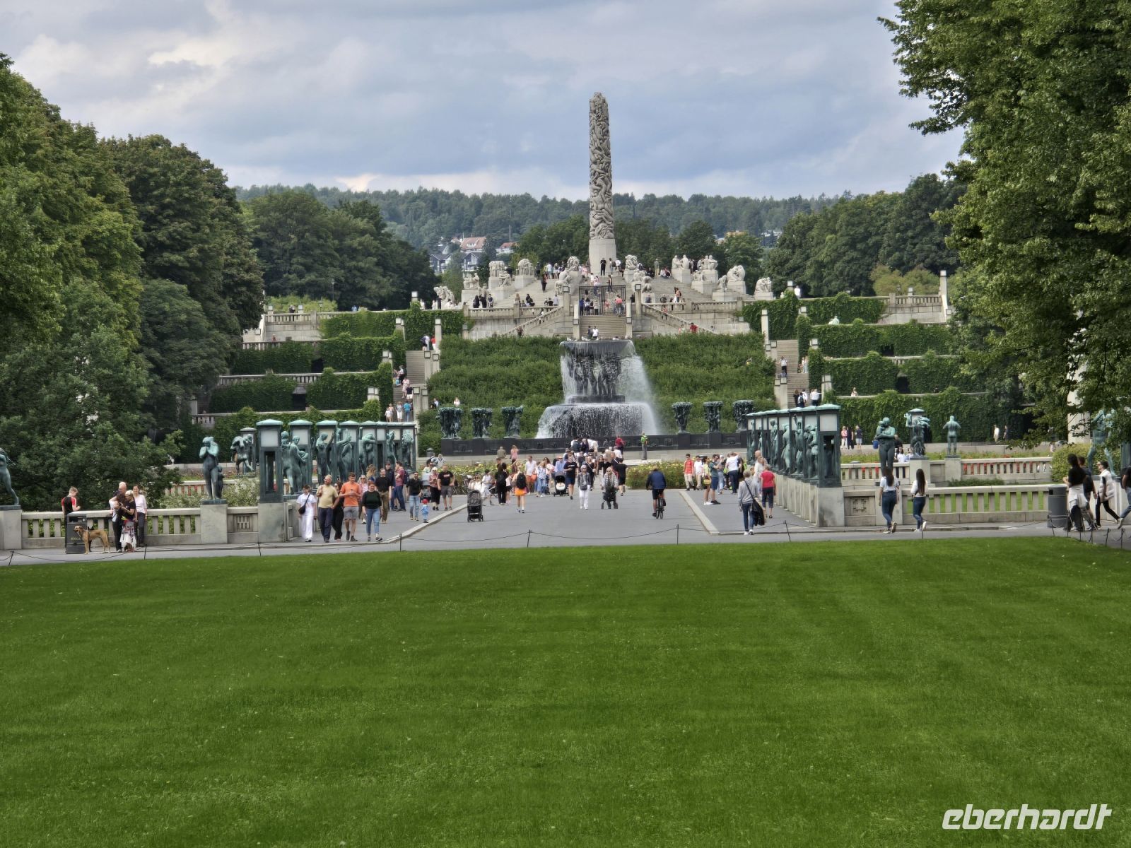 Über die Tollbogata gelangen wir auf die Promenaden Allee, die Karl Johans gate. Dieser Straße folgend kommen wir am Parlamentsgebäude vorbei, dann zum Grandhotel, hier präsentieren sich auf dem Balkon die Nobelpreisträger dem Publikum, wenig später ist rechts die juristische Fakultät der Universität Oslo und auf der linken Seite befindet sich das Nationaltheater. Wir queren nochmal eine Straße und befinden uns dann im Schlosspark den wir durchqueren und machen auf dem Schlossplatz direkt vor dem Königlichen Schloss einen Halt. Arlene erklärt uns das das Parlamentsgebäude und das königliche Schloss, wegen der nötigen Transparenz des Handelns, bewusst in unmittelbare Nähe zueinander gebaut wurden. Wir lassen das Schloss auf der linken Seite liegen und verlassen den Schlosspark auf der gegenüberliegenden Seite. Wir passieren einige schöne alten Villen, die jedoch weitgehend hinter Mauern Sichtschutz bekommen haben. Bald kommen wir zum Eingang des Vigeland Parks, wo Gustav Vigeland über 200 Skulpturen in diesem Park aufstellte. Das Motiv der Skulpturen ist der Lebenszyklus des Menschen. Von der Geburt bis zum Tode, die Freuden und das Leid des Lebens darstellend. Die Anlage hat Gustav Vigeland in fast zwanzigjähriger Arbeit geschaffen und schlussendlich vollendet wurde sie nach seinem Tod 1943. Wir schauen uns diese Skulpturen, wie zum Beispiel den kleinen Trotzkopf und weiter in der Mitte befindlich, der große Monolith, sehr ausführlich an. Mit ein bisschen Erklärung versteht man die Bedeutung der dargestellten Lebenszyklen sehr gut.