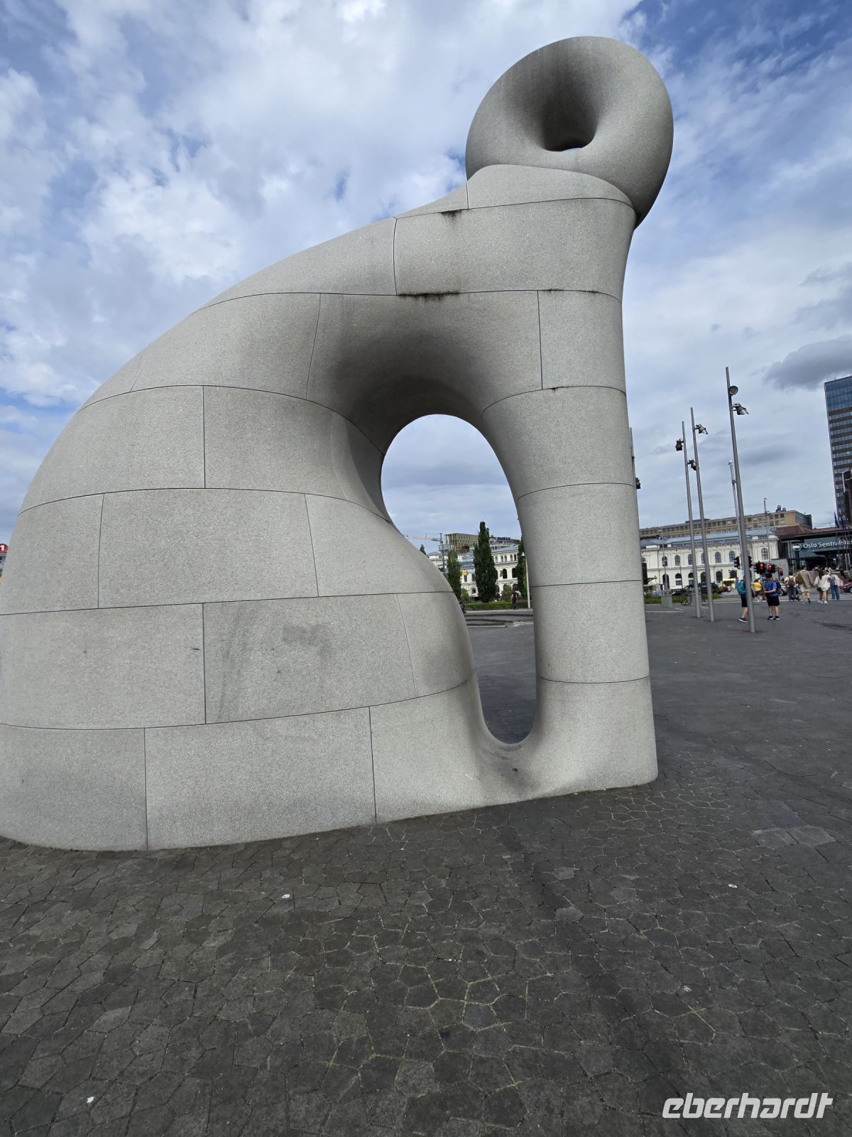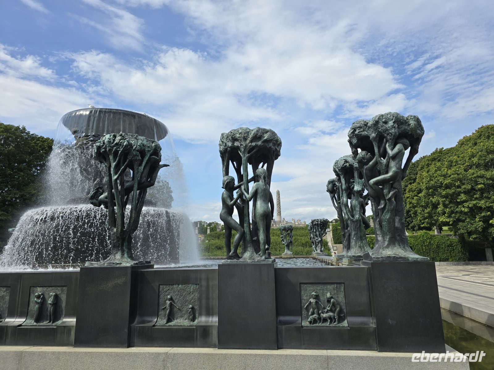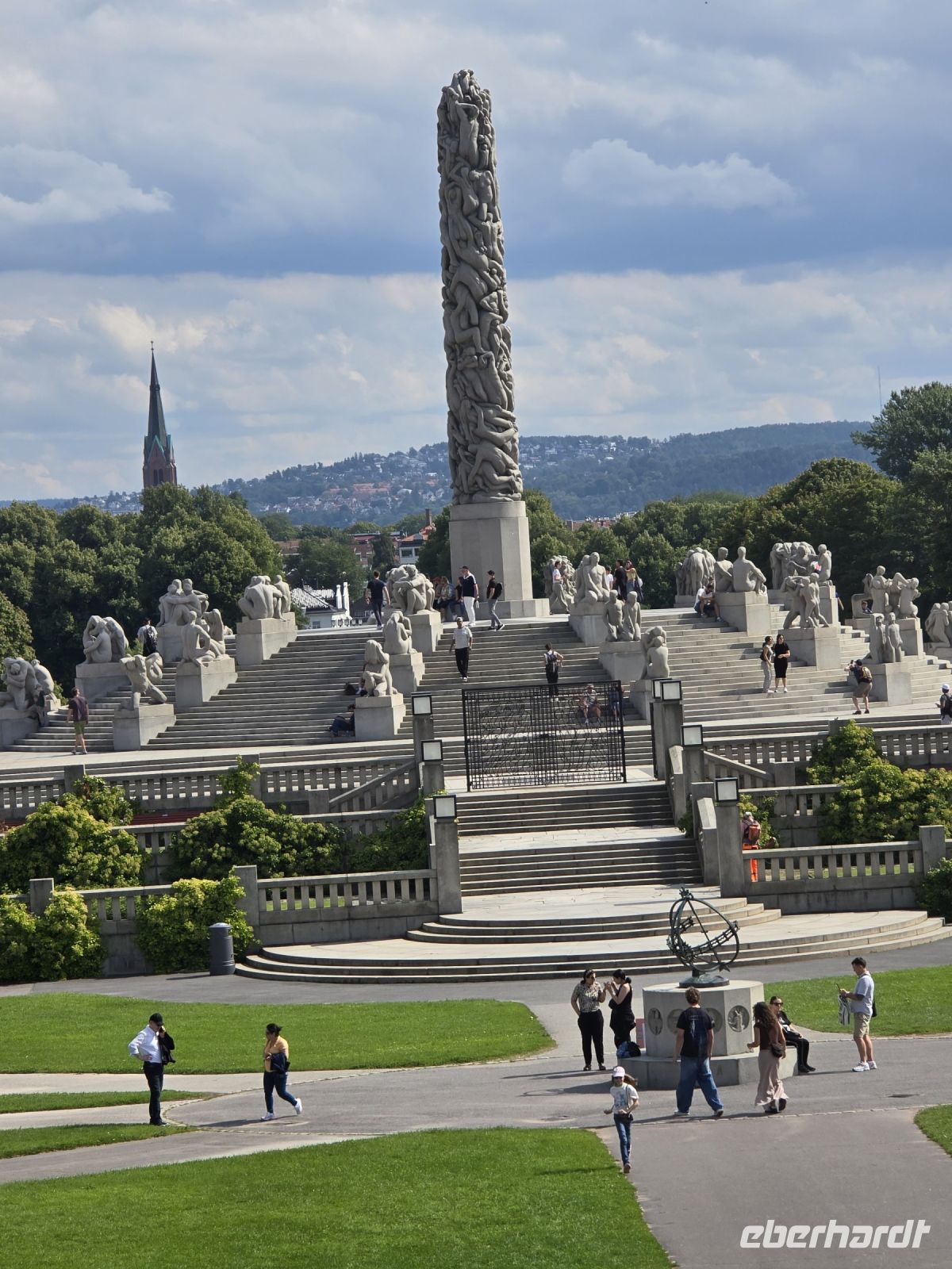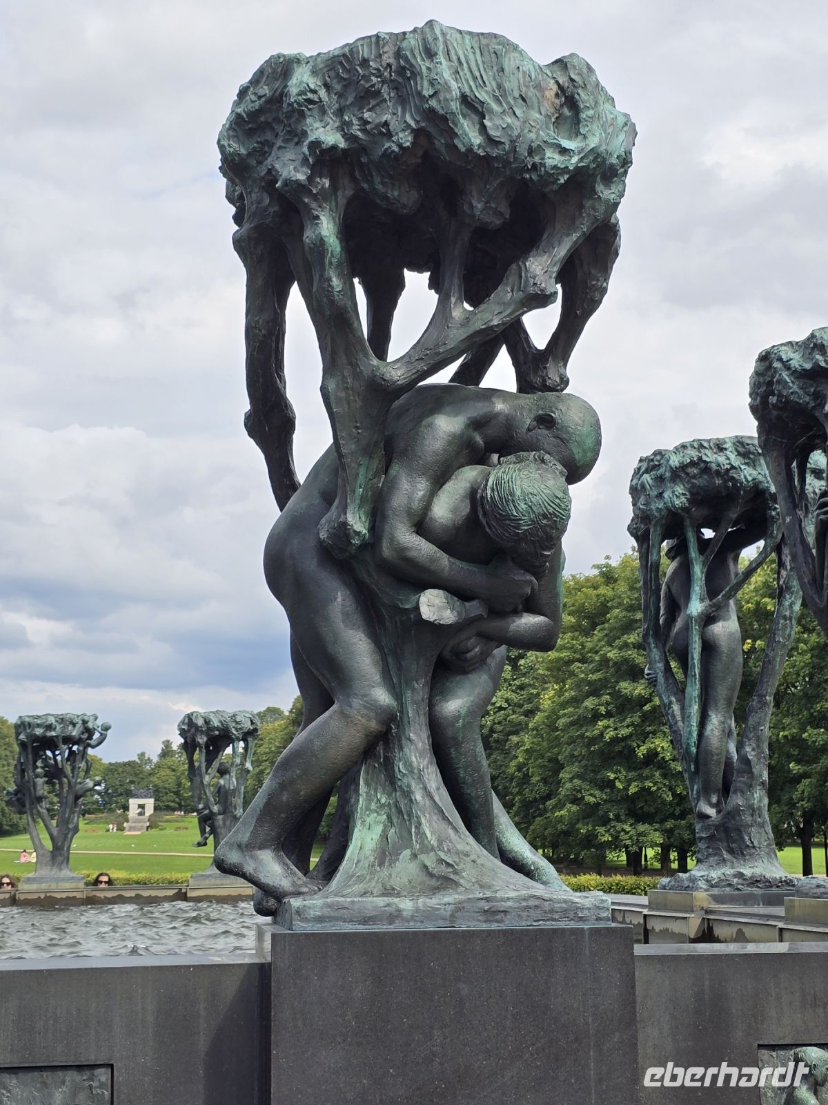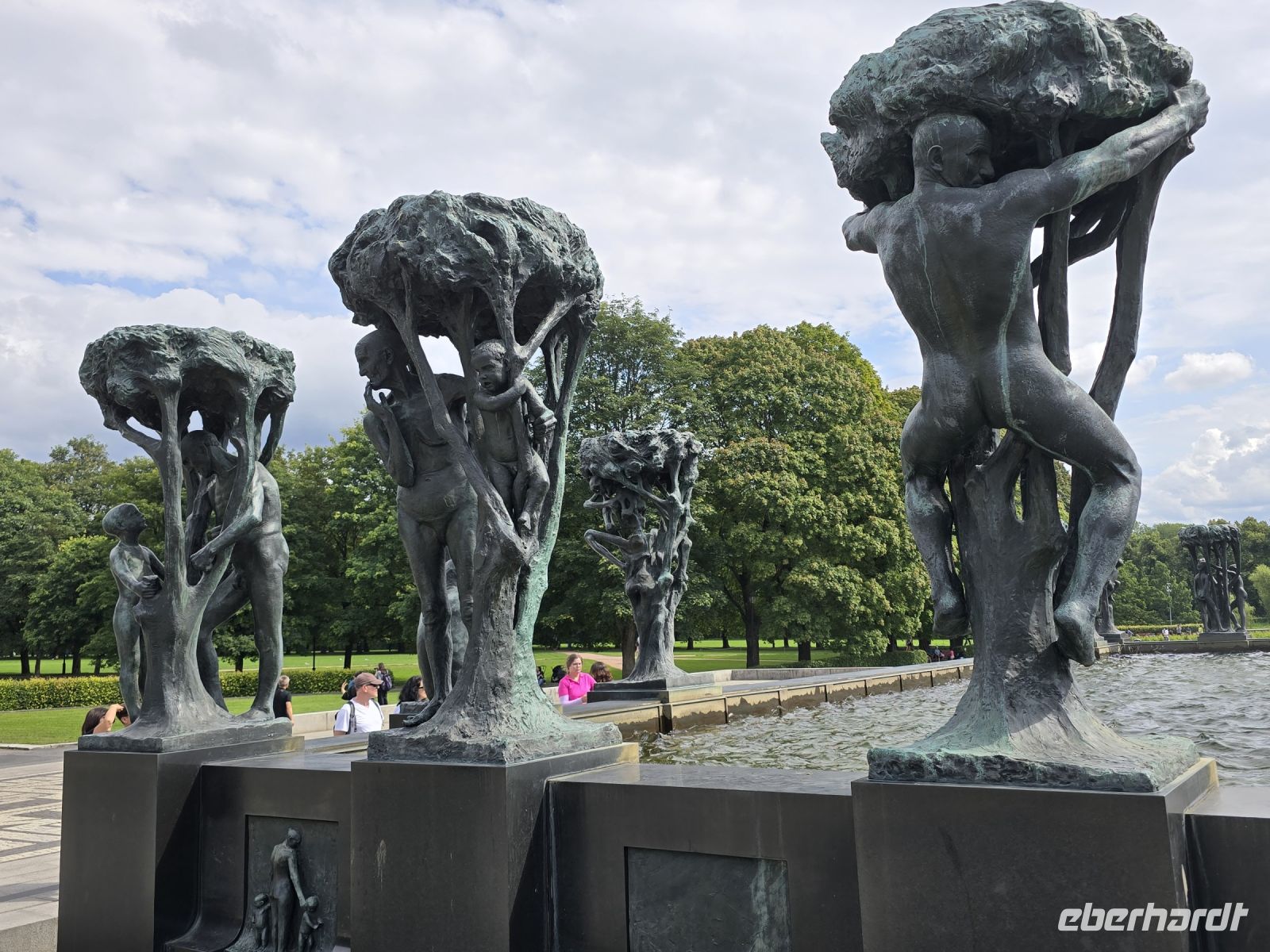 Über die Tollbogata gelangen wir auf die Promenaden Allee, die Karl Johans gate. Dieser Straße folgend kommen wir am Parlamentsgebäude vorbei, dann zum Grandhotel, hier präsentieren sich auf dem Balkon die Nobelpreisträger dem Publikum, wenig später ist rechts die juristische Fakultät der Universität Oslo und auf der linken Seite befindet sich das Nationaltheater. Wir queren nochmal eine Straße und befinden uns dann im Schlosspark den wir durchqueren und machen auf dem Schlossplatz direkt vor dem Königlichen Schloss einen Halt. Arlene erklärt uns das das Parlamentsgebäude und das königliche Schloss, wegen der nötigen Transparenz des Handelns, bewusst in unmittelbare Nähe zueinander gebaut wurden. Wir lassen das Schloss auf der linken Seite liegen und verlassen den Schlosspark auf der gegenüberliegenden Seite. Wir passieren einige schöne alten Villen, die jedoch weitgehend hinter Mauern Sichtschutz bekommen haben. Bald kommen wir zum Eingang des Vigeland Parks, wo Gustav Vigeland über 200 Skulpturen in diesem Park aufstellte. Das Motiv der Skulpturen ist der Lebenszyklus des Menschen. Von der Geburt bis zum Tode, die Freuden und das Leid des Lebens darstellend. Die Anlage hat Gustav Vigeland in fast zwanzigjähriger Arbeit geschaffen und schlussendlich vollendet wurde sie nach seinem Tod 1943. Wir schauen uns diese Skulpturen, wie zum Beispiel den kleinen Trotzkopf und weiter in der Mitte befindlich, der große Monolith, sehr ausführlich an. Mit ein bisschen Erklärung versteht man die Bedeutung der dargestellten Lebenszyklen sehr gut.