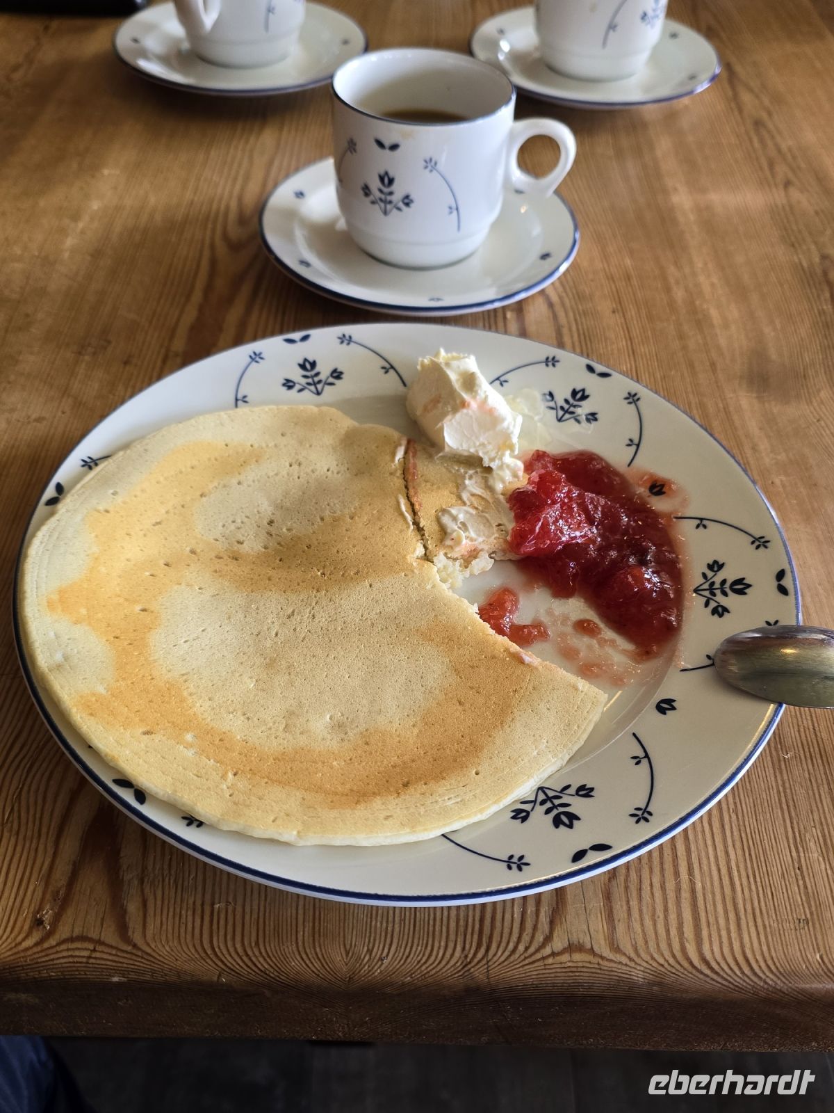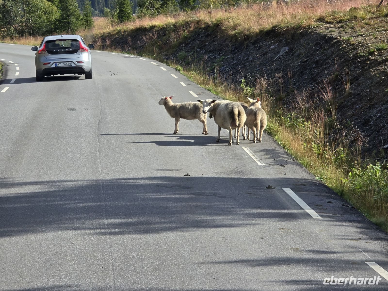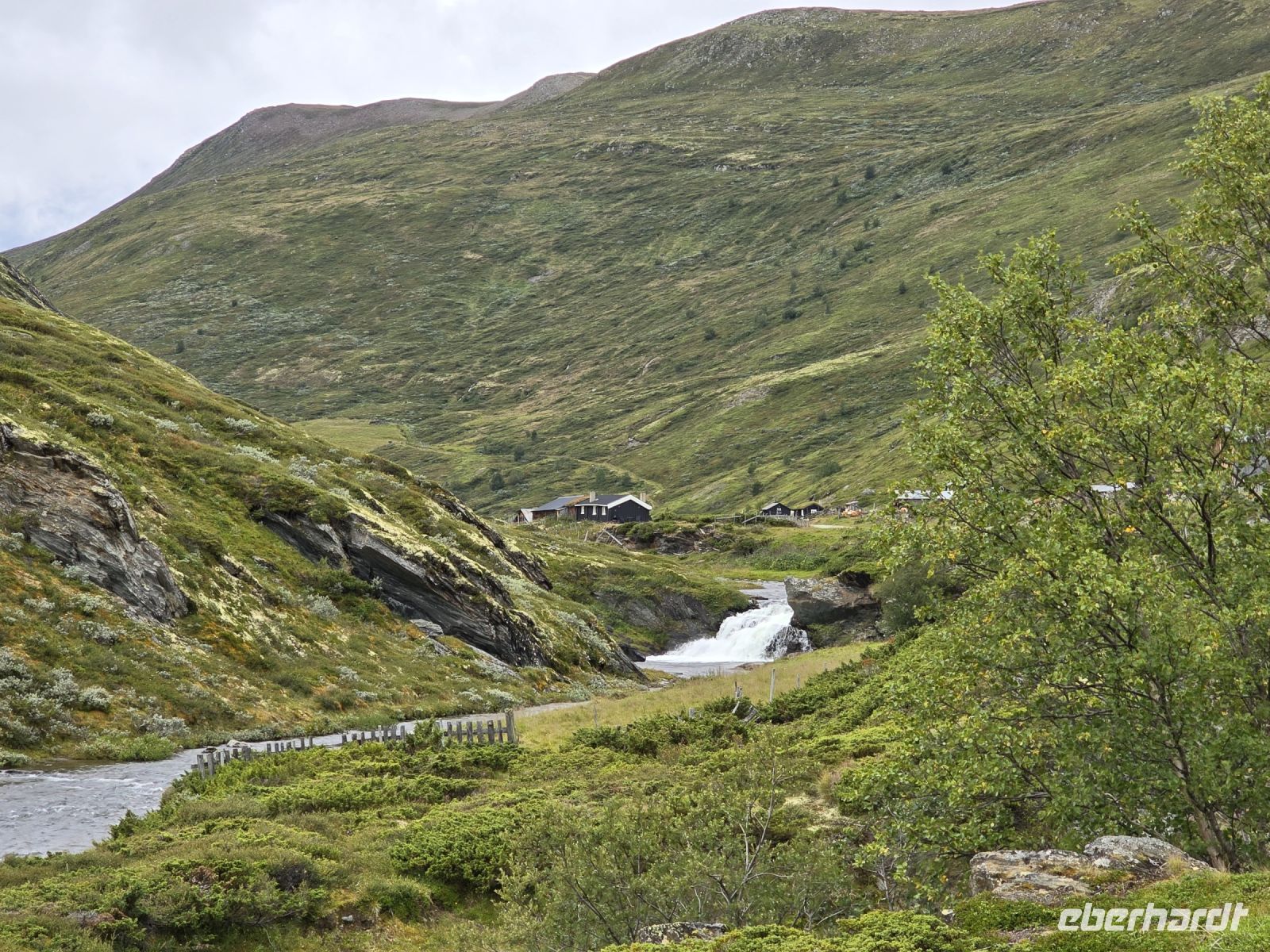 Nach einem kurzen Stück der Landstraße folgend, biegen wir rechts in die kleine Bergstraße ein. Schon nach wenigen 100 Metern müssen wir unbedingt einen Fotostopp machen zu schön ist der Blick in das weite Tal das vor uns liegt. Wir folgen dem Weg vorbei an den Almen mit Ihren alten Milchständern, direkt an der Straße gelegen damit die dort bereitgestellten Milchkannen sehr schnell eingesammelt werden können. Nach circa 20 Kilometern machen wir unsere Mittagsrast in der Haugesteter Berghütte und genießen zum Kaffee norwegische Waffeln mit Sauerrahm und Preiselbeeren.
