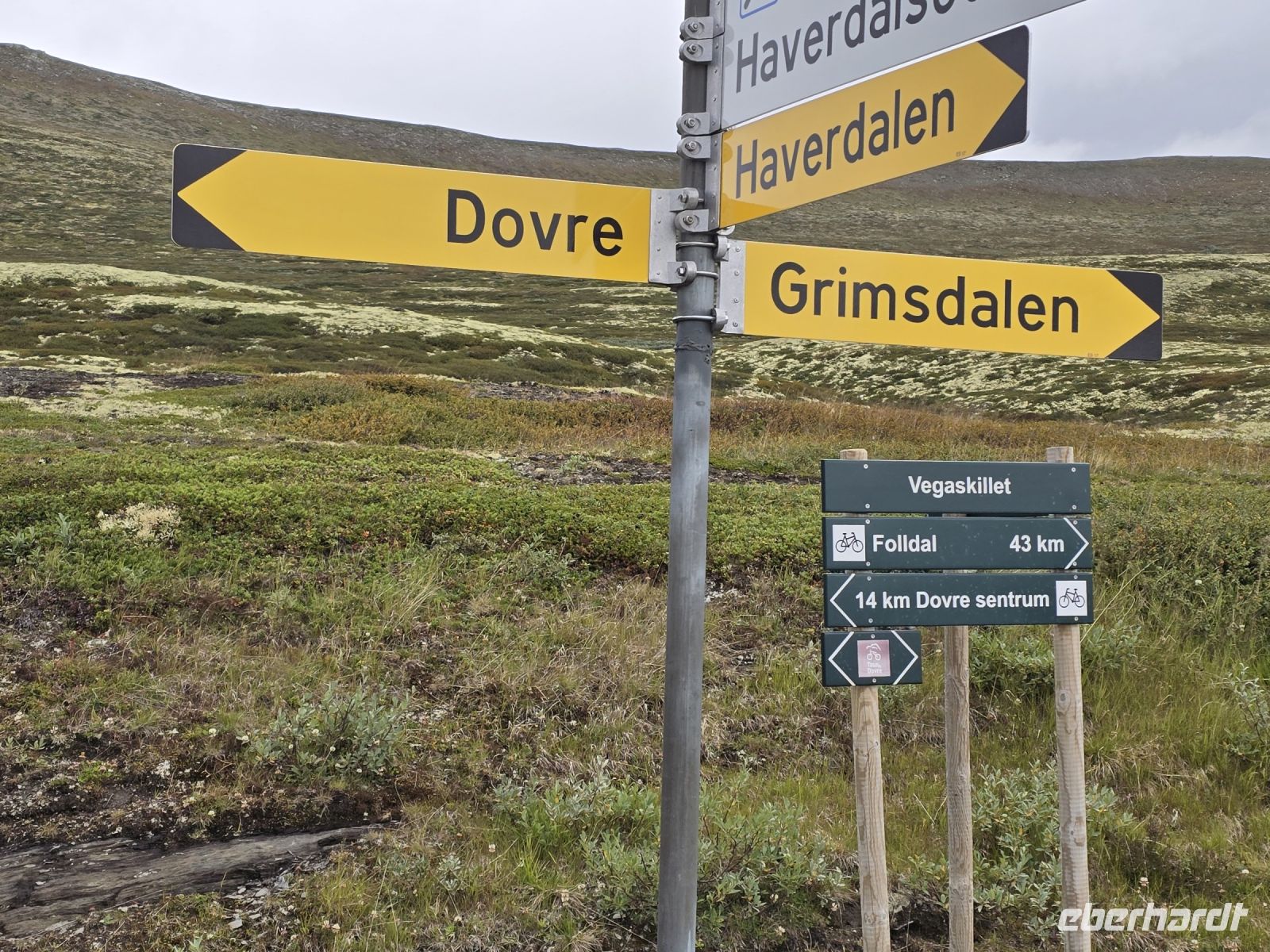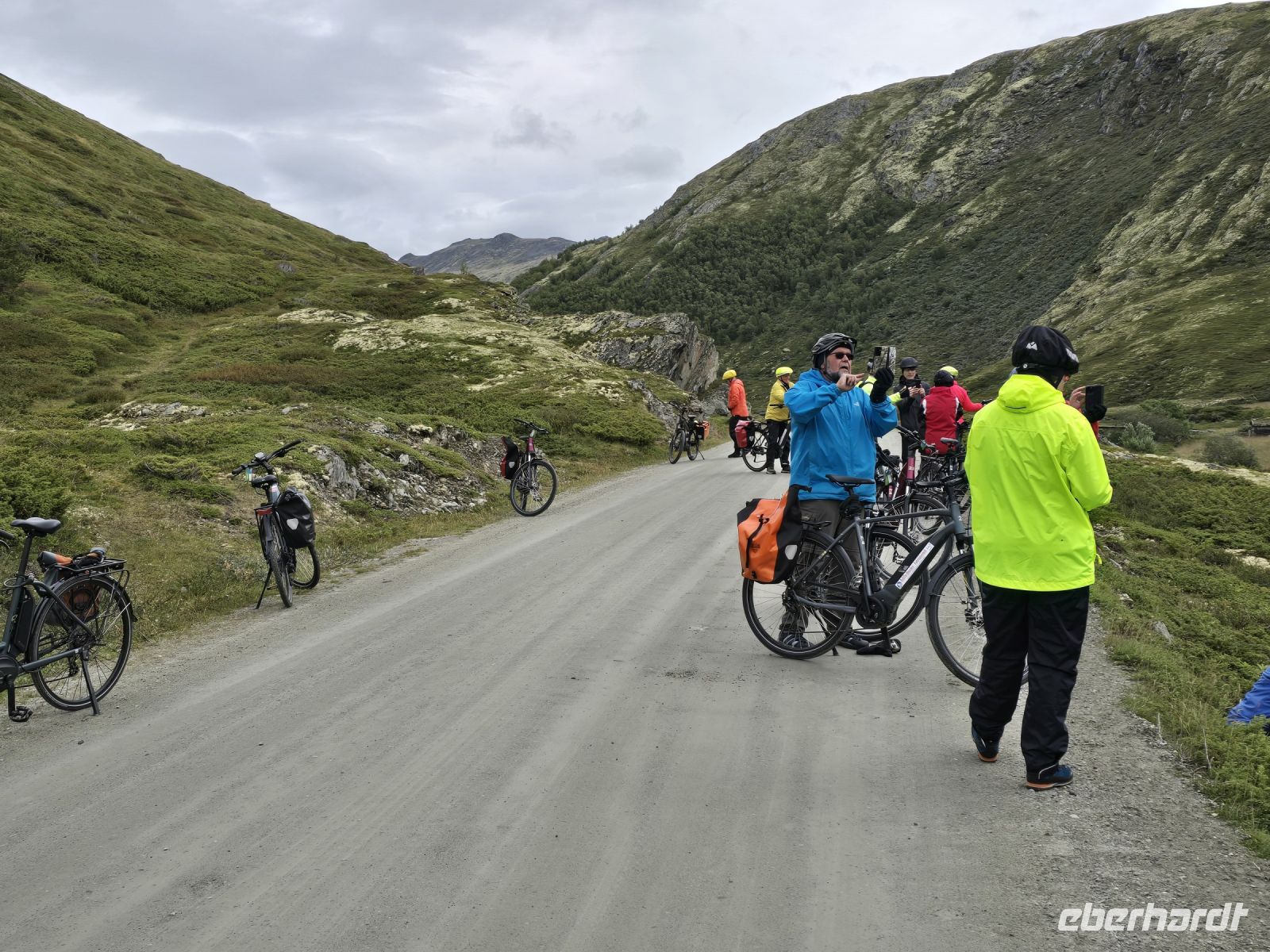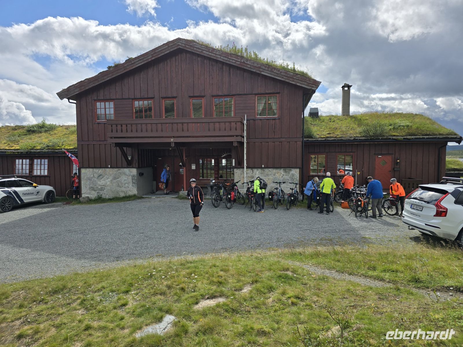 Nach einer starken Stunde machen wir uns wieder auf den Weg. Wir fahren hinab von der Hütte zu unserem Radweg ins Tal und dann gegen starken Wind, aber meist ohne Regen. Aber unsere Regenkleidung lassen wir trotzdem an, sie ist ein guter Schutz gegen den kalten Wind der sich sonst bis auf die Haut durch peitschen würde. Der Wind erfordert viel Kraft und wir nutzen unseren Elektroantrieb so gut es geht um gegen die Windböen anzukommen. Wir machen mehrmals kurze Stopps um wenigstens ein wenig die Landschaft genießen zu können aber meist geht es dann auch bald weiter die Strecke entlang dann einen langen Berg hinauf auf den höchsten Punkt der Tour, auf 1200 m. Wir haben bedenken das unsere Batterien der Fahrräder nicht ausreichen uns für die komplette Tour zu unterstützen, der Wind erfordert viel Kraft. Vom höchsten Punkt der Passhöhe geht es nun erst einmal 800 Höhenmeter nach unten es ist eine schöne Abfahrt trotz des Windes. Bei mehreren Stopps während der Abfahrt sammeln wir uns wieder genießen die Ausblicke in das Tal das vor uns liegt und kommen dann schon bald im Tal von Dovre an. Hier müssen wir noch einige Kilometer im Tal entlang fahren um an unserem vereinbarten Treffpunkt auf den Bus zu treffen. Wir haben schon im Voraus eine Wurstmahlzeit bestellt die Alex schon für alle warm gemacht hat und dabei können wir uns im Bus aufwärmen und stärken und das eine oder andere Bierchen dazu trinken.
