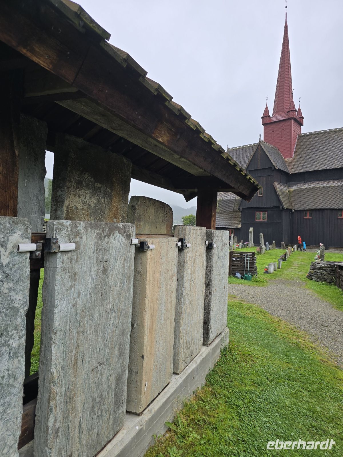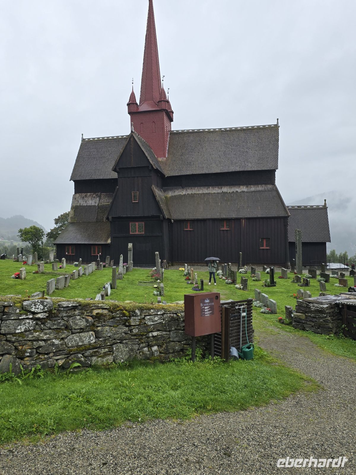 Abgestimmt zu den Fahrzeiten der Fähre Hella Fahren wir am Nachmittag weiter über den Sognefjord und machen unseren nächsten Stopp bei der Stabkirche Hopperstad. Diese Kirche ist weniger geschmückt als die Stabkirche von Ringebu, macht fast einen authentischeren Eindruck. Tiefschwarz mit Pech geschützt steht die Kirche mit gekröpften, verzierten Giebelspitzen dominant in dem saftig grünen Tal.
