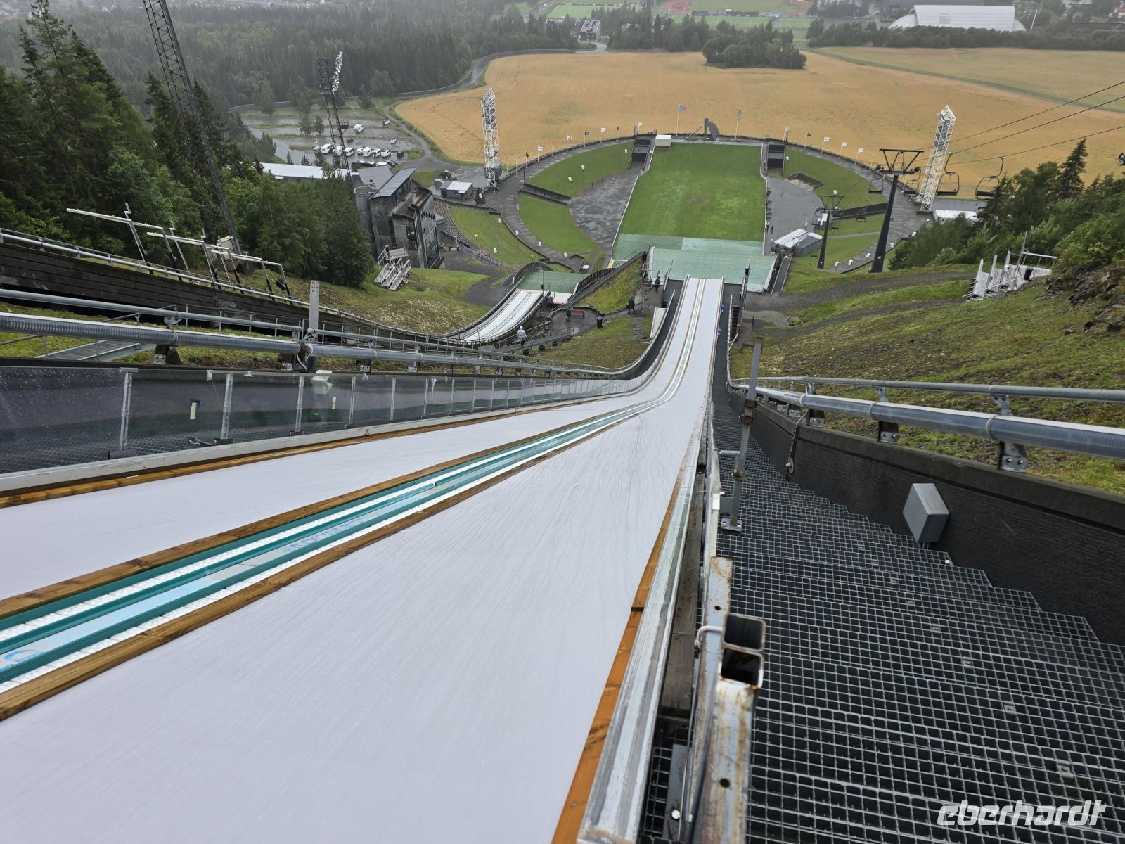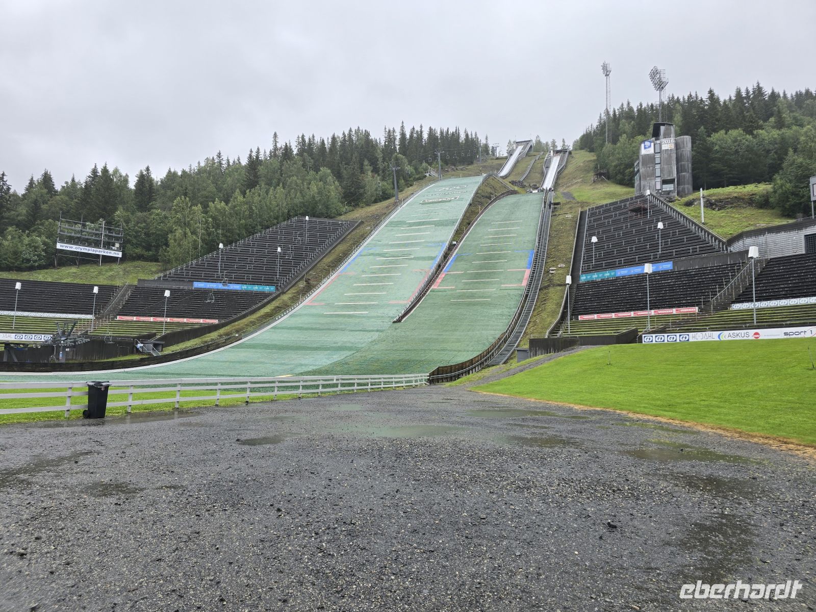 Am Ende der Besichtigung zurück im Bus, müssen wir feststellen, dass sich die Wettervorhersage sich leider zu 100% erfüllt. Wir haben starken Regen und keine Aussicht, dass der Regen an diesem Tag nachlässt. Wir beschließen, dass wir unsere Fahrradtour durch den Dovre Nationalpark ausfallen lassen und stattdessen nach Lillehammer gehen und dort die Sprungschanzen besuchen und uns mit den Olympischen Spielen von 1994 beschäftigen.