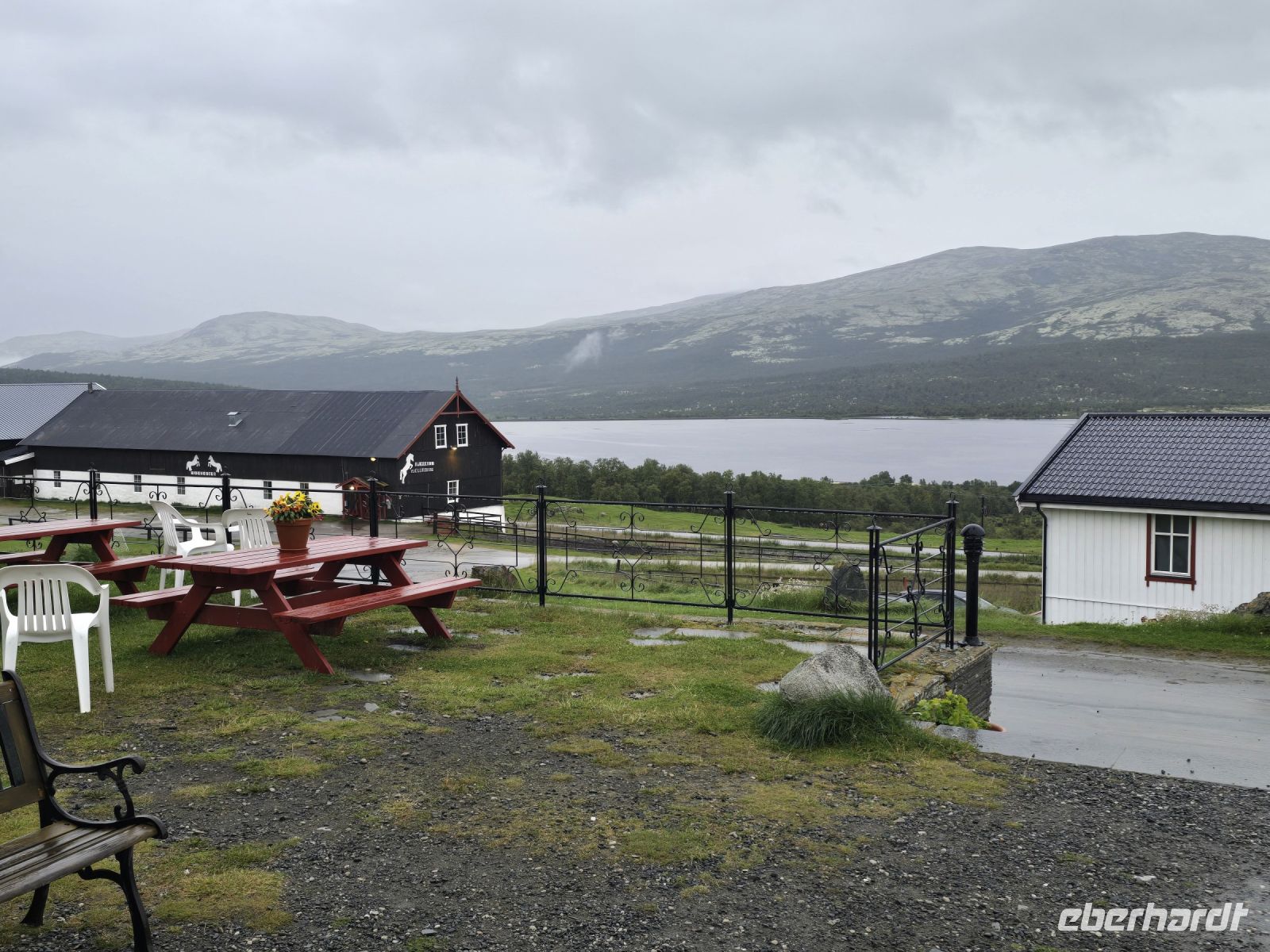 Nach zirka einer Stunde Fahrt schließt sich der Himmel mit Wolken, der Wind nimmt zu und erneut sehen wir Regen auf uns zukommen. Erst hoffen wir noch, dass wir mit wenig Regen schnell auf eine Schutzhütte, die Grimsdal Hütte gelangen können, aber der Regen nimmt schnell zu und der Wind entwickelt sich zu heftigem Gegenwind, so dass wir doch unsere Regenkleidung noch vorher anziehen. Dann schließlich kommen wir an der Hütte an und nehmen Unterschlupf in der gemütlichen Gaststube. Bei Kaffee Tee und Süßem warten wir den schlimmsten Regen ab.