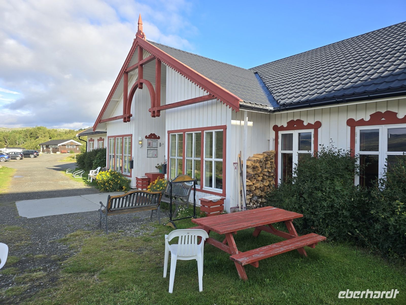 Wir folgen der Landstraße die uns durch die Täler führt bis schließlich zum Gudbrandsdal, dem wir auch noch einige Zeit folgen, ehe wir uns rechts das Tal, über Serpentinen, bis in das Kvitfjell hoch arbeiten. Das Kvitfjell Hotel liegt auf ca. 1000 Metern und bietet uns einen schönen Blick hinunter in das Gudbrandsdal. Die Unterkünfte liegen in einzelnen Chalets unterhalb des Haupthauses mit wunderschönen Panoramafenstern und Blick in das Tal hinab. Der Zugang zu den Chalets erfolgt über Holztreppen und bei den Gästen die ganz unten ihre Quartier hatten, gaben wir gegenseitig Unterstützung beim Gepäcktransport. Das Abendessen hatten wir gemeinsam im Haupthaus genauso wie das Frühstück am nächsten Morgen. Die Temperaturen waren leider in diesem Jahr hier oben unter 10 Grad, was uns veranlasste, meist in den Häusern zu bleiben und von hier aus die Ausblicke zu genießen.