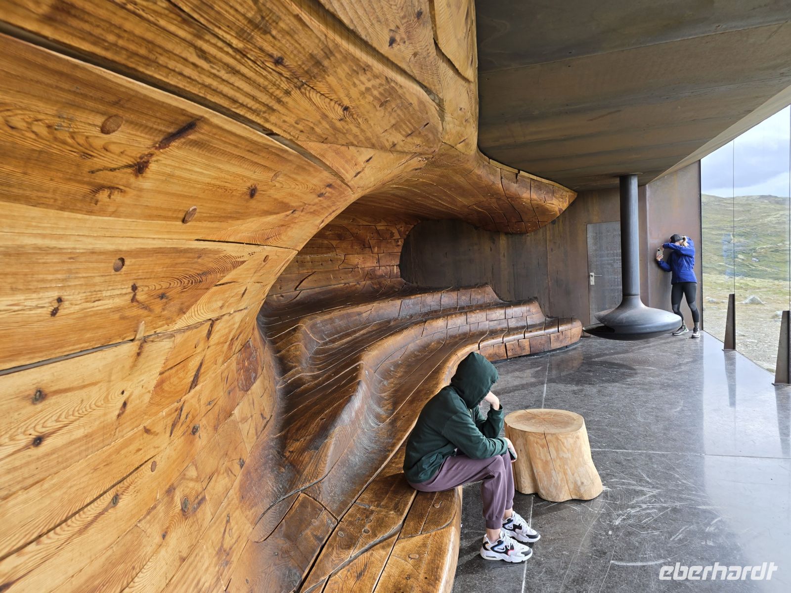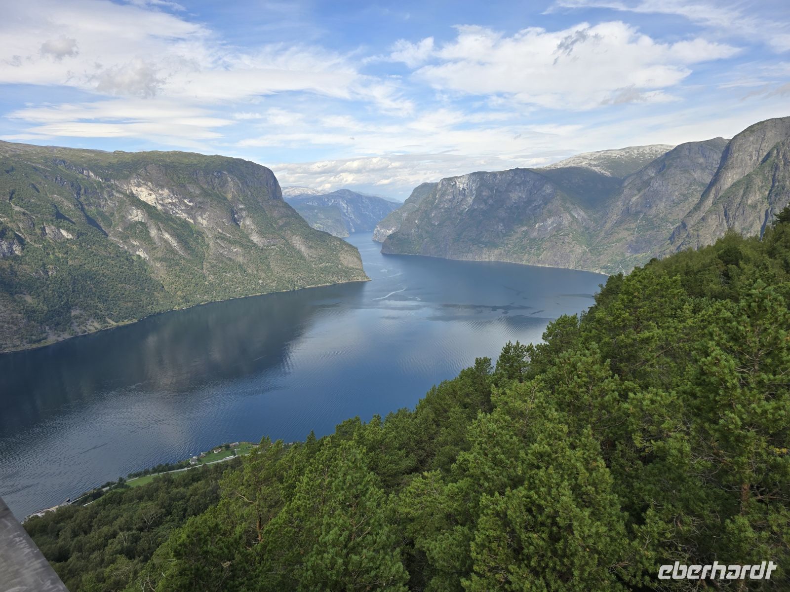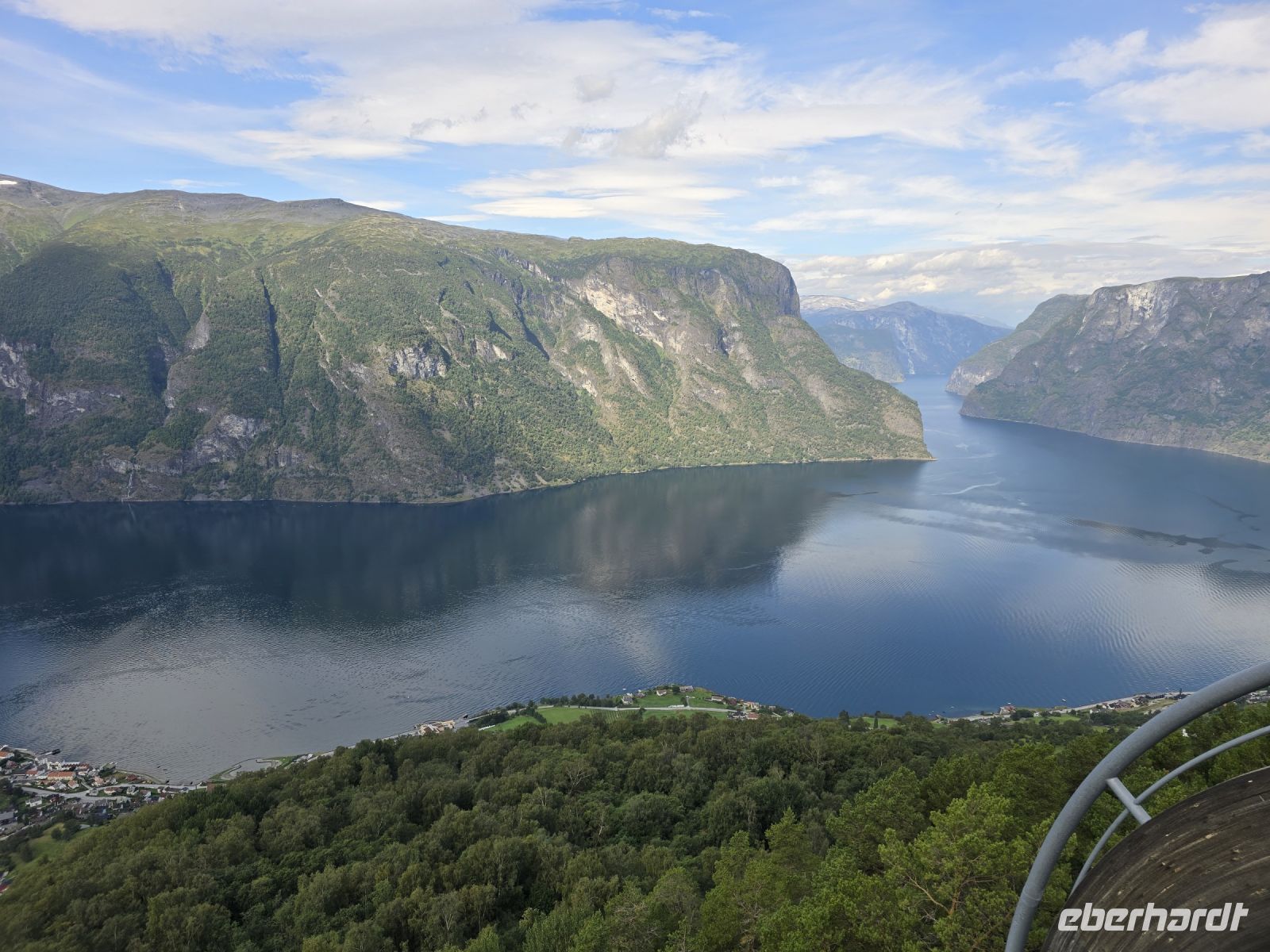 Angekommen in Flam, dem Dreh und Angelpunkt für Tourismusaktivitäten am Sognefjord, machen wir eine kurze Pause bevor wir uns mit einem Shuttlebus hoch zum Aussichtspunkt am Stegastein begeben. Hoch über dem Fjord wurde hier ein heraus kragender Holzsteeg eingebracht der mit einer Glaswand abgeschlossen ist, von wo aus man atemberaubende Blicke in die Tiefe und beidseitig in den Fjord hat. Es ist der ideale Punkt für Fotos und Selfies und genau das müssen wir hier machen.