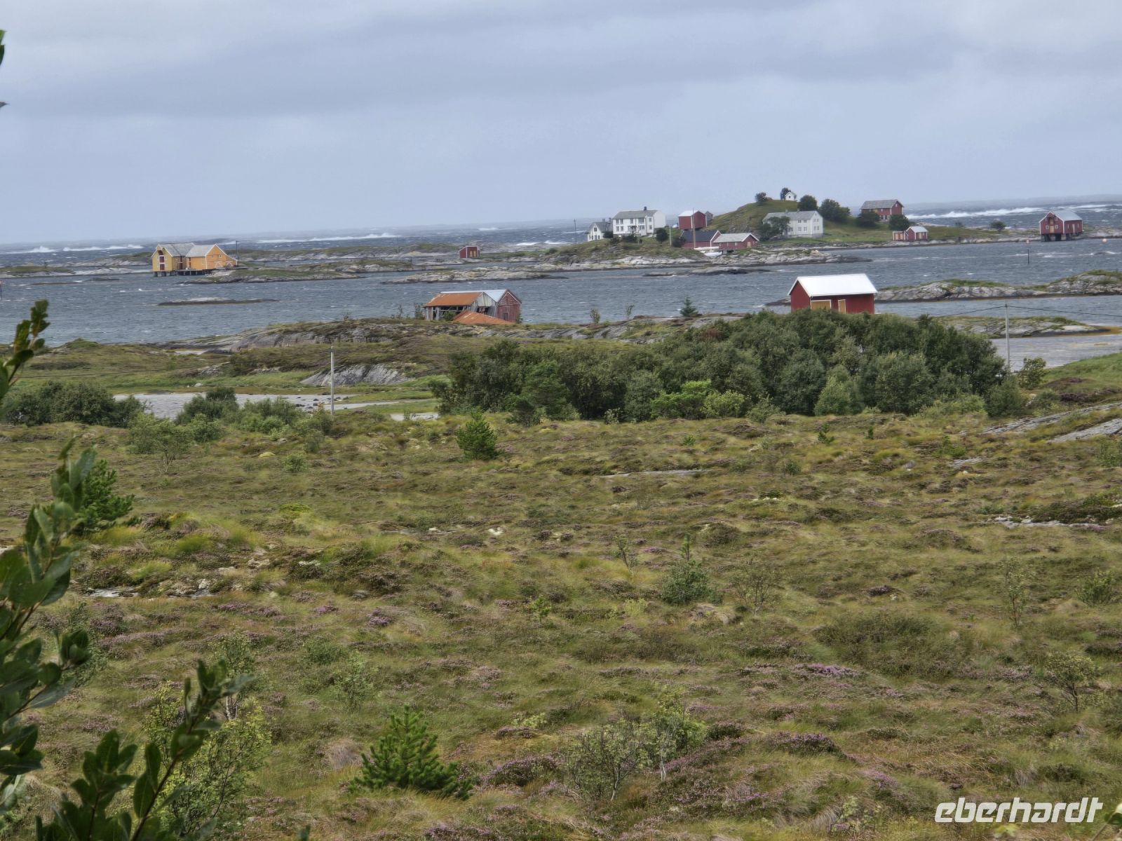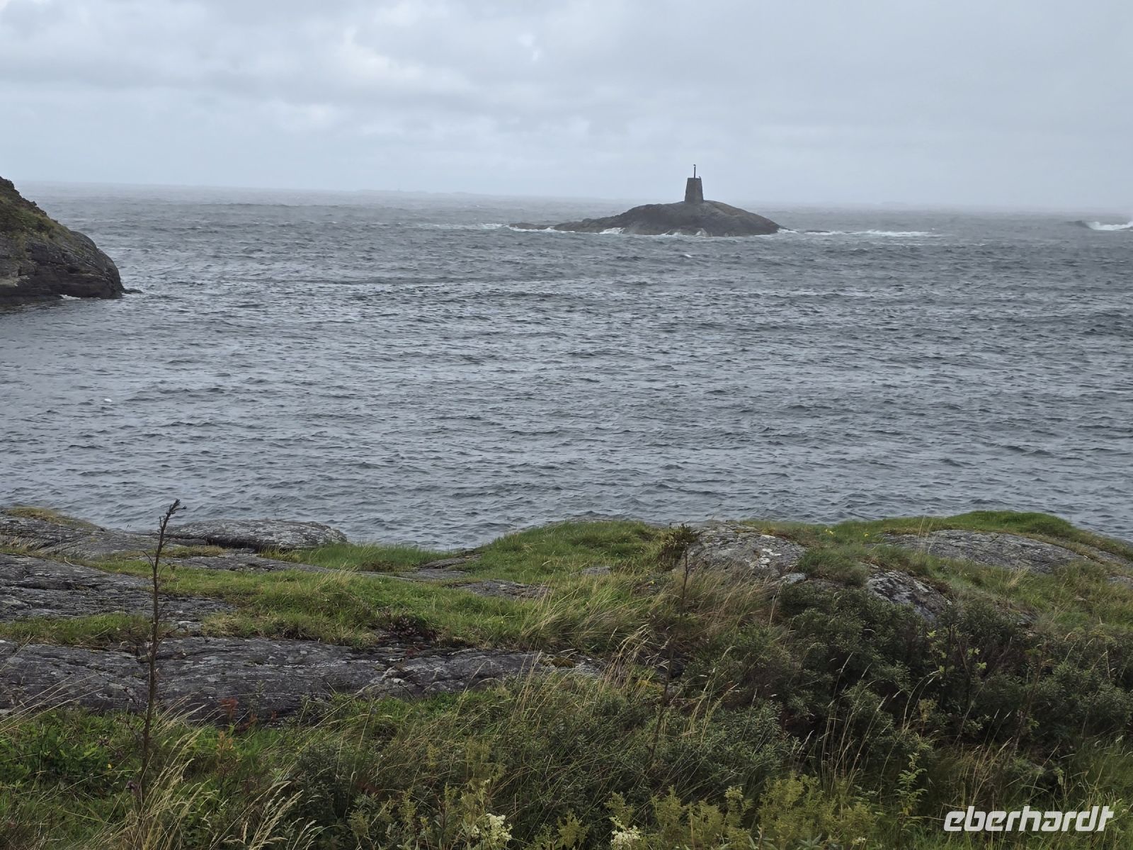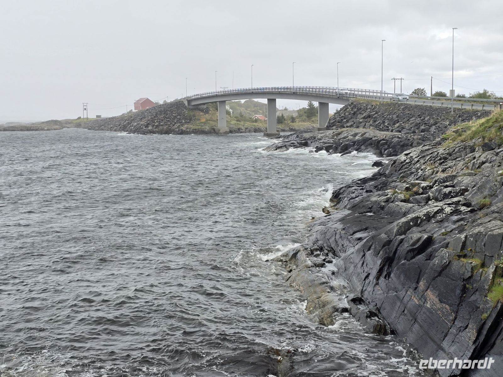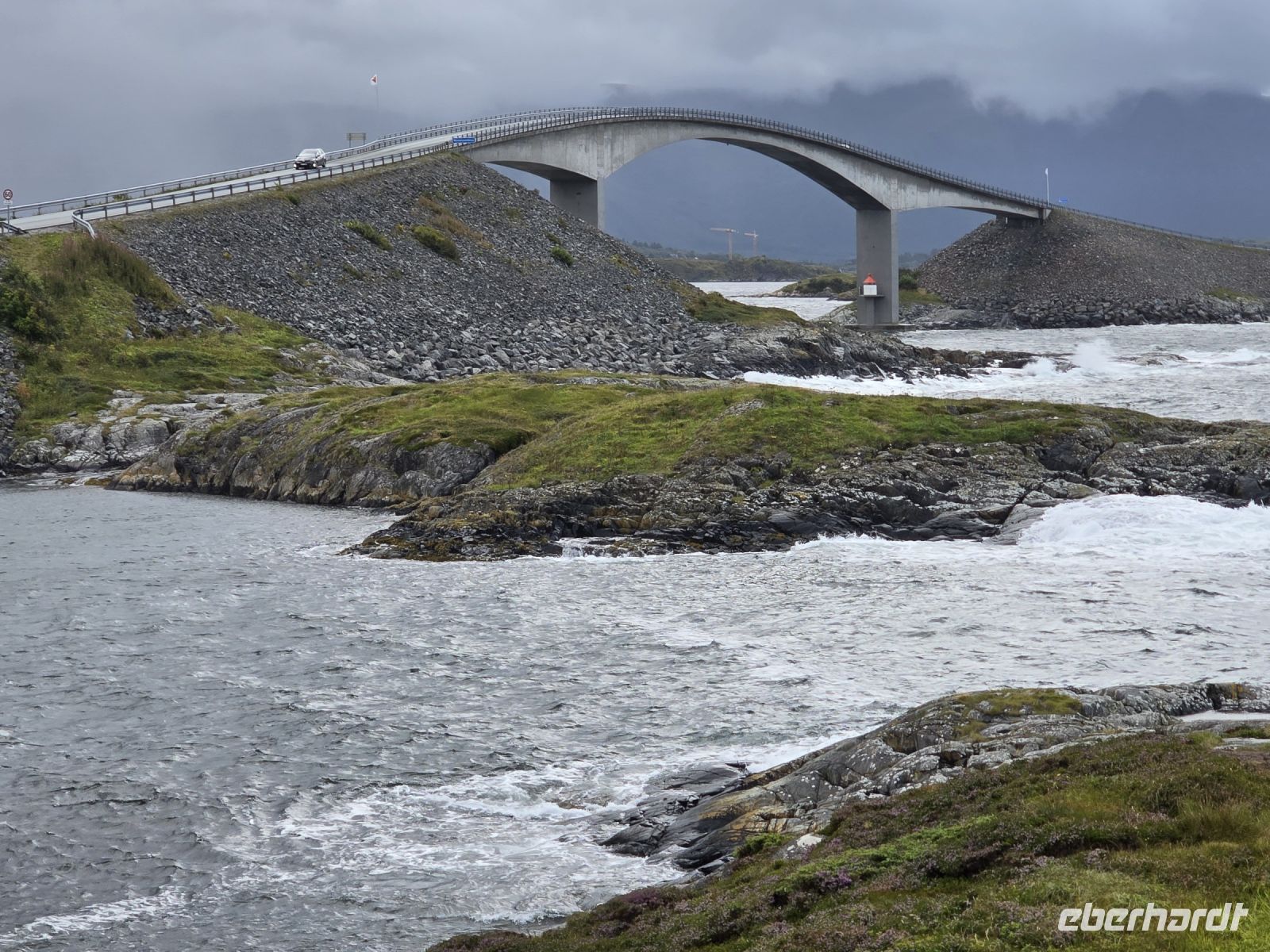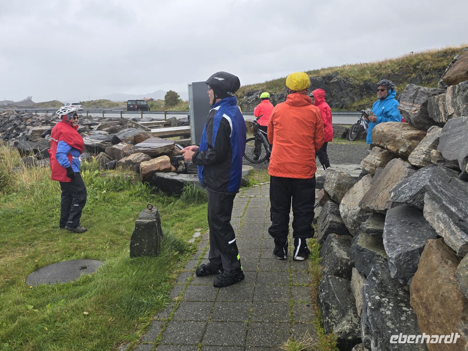 Hier soll unsere Radtour parallel zum Atlantik über die Atlantikstraße beginnen. Neben der Dorfkirche finden wir einen Parkplatz um unsere Räder abzuladen, und als ob der Wettertoll uns beobachten würde just in diesem Moment beginnt es wieder zu regnen. Generell hat jeder Teilnehmer die Wahl diese schöne Strecke auch mit dem Bus zu fahren aber kein einziger kneift, alle fahren die Tour mit dem Fahrrad mit. Gut geschützt mit Regenkleidung geht es los erst über flaches Land durch kleine Dörfchen immer nahe an der Küste in östliche Richtung. Aufgrund der Gegenwind Erfahrung des letzten Tages haben wir die Radtour heute so gewählt dass wir Rückenwind haben. Und das erweist sich als sehr hilfreich. Der Wind heute ist wieder sehr stark, aber diesmal schiebt er uns über Von hinten über die Wege und Straßen hinweg es ist wie Fliegen, wir müssen kaum treten. Auch der Regen ist angenehmer wenn er von hinten kommt als wenn er uns von vorne in das Gesicht peitscht. So sind wir gut gelaunt unterwegs, an den Regen schon etwas gewöhnt, schauen wir uns die kleinen Dörfchen an durch die wir radeln, teileweise geschmückt mit dekorierten Maskottchen als Radfahrer am Wegesrand, das ist wohl eine beliebte Radfahrerstrecke. Von der kleinen Stadt Vavang aus erspähen wir die ersten Atlantikbrücken und machen sofort einen Fotostopp. Es geht weiter auf der immer schmäler werdenden Landzunge zur ersten Brücke die zur nächsten Insel Strømholm führt. Nun sind wir mitten auf dem Atlantik, auf beiden Seiten mächtig viel Meer neben uns, unterwegs auf den schmalen Brücken die uns von Inseln zu Insel hüpfen lassen. Die größte und höchste Brücke ist die Storseisundbrua, die wir aber erst nach einem Besichtigungstopp befahren werden.