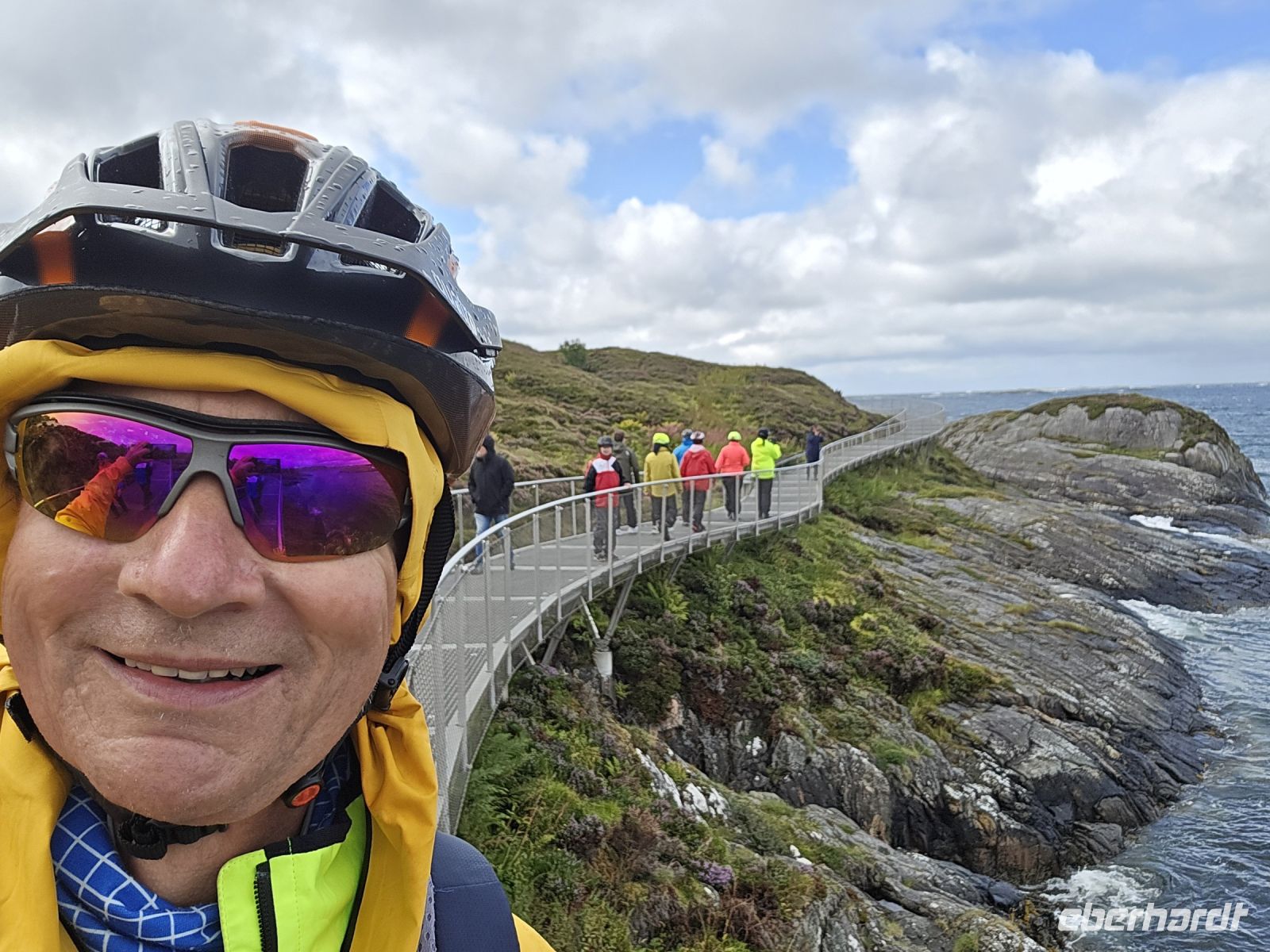 An dem Ausichtspunkt Eldhusøya, von wo aus die große Brücke sehr gut betrachtet werden kann, ist ein Rundweg eingerichtet den wir genüsslich ablaufen und viele Selfies und Fotos mit der Brücke machen können. Andere Passanten die auch diesen Rundweg laufen, können kaum glauben dass wir mit den Fahrrädern bei diesem Wetter und Wind unterwegs sind. Aber wir lassen uns weiterhin unseren Spaß nicht verderben, fahren wieder los die große Brücke hinauf, diesmal benötigen wir doch etwas Motokraft um den Aufstieg zu bewältigen, von oben eine herrliche Weitsicht über das Meer und über die Inseln und dann hinunter zum Ende unseres schönen Atlantikradeweges nach Kårvåg, dort wo schon Alex den Bus offenhält und wir mal wieder uns in den trockenen Bus flüchten können. Das war eine schöne Tour trotz Wind und Regen aber diese Blicke nimmt uns keiner mehr. Jetzt brauchen wir eine Stärkung mit Würstchen, Suppen und ein Bierchen was auch immer der Bus für uns bereitstellt.