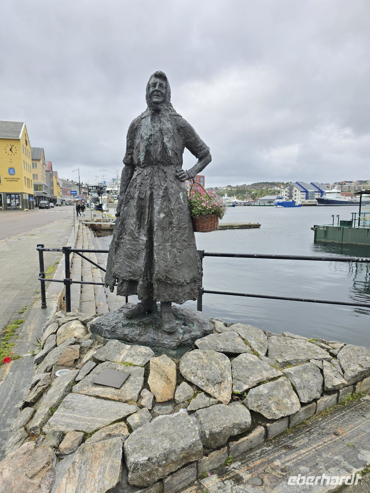 Nun setzen wir die Fahrt mit dem Bus fort, in nordwestliche Richtung fahren wir bei Øksenvågen durch den 2 km langen Atlantiktunnel unterhalb der Meeresoberfläche bis nach Kristiansund. Die traditionsreiche Fischerstadt ist bekannt durch den Fang von Kabeljau und die Verarbeitung derselben zum Klippfisch. Der ausgenommene Fisch wird direkt nach Rückkehr der Fischer auf die weißen Felsen gelegt, wo er gesalzen, in der trockenen, kalten Meeresluft sehr schnell trocknet und konserviert. Der Fisch ist danach hart wie Holz und kann jahrelang aufbewahrt werden. Mit dieser Nahrung war es möglich, früher diese großen Entdeckungsfahrten in neue Welten zu unternehmen. Der Kabeljau hat seine feste Wanderroute, die ihn jedes Jahr erneut in großen Schwärmen in Reichweite der Fischerflotten an der Stadt vorbeiziehen lies. Der Klippfisch wurde in der damaligen Zeit das wichtigste Exportgut Norwegens. Über die Stadt Bergen wurde der Fisch in die ganze Welt exportiert. Die Klippfischfrau und der Klippfischjunge, 2 Denkmäler im Hafen von Krtistiansund, verkörpern diese überquellende Fischfangzeit die bis Ende des 19.Jahrhundert anhielt.