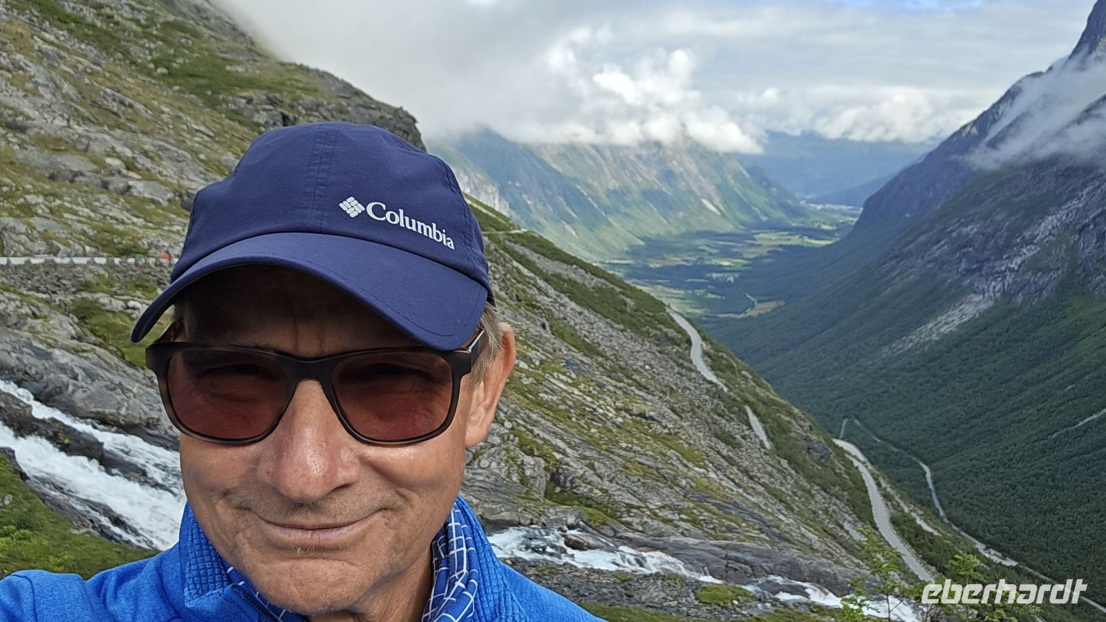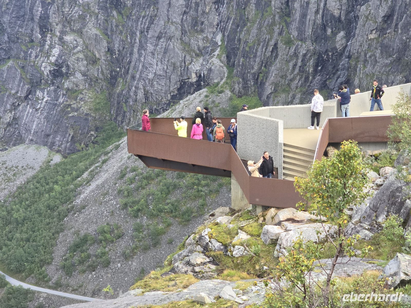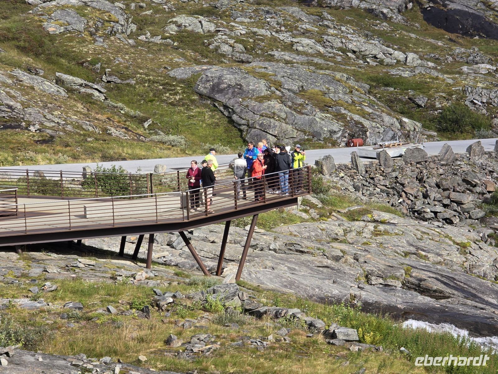 Heute haben wir einen langen Tag vor uns mit vielen Highlights Norwegens. Wir setzten schon um 07:50 Uhr mit der Autofähre von Molde nach Vestnes über, um dann entlang des Storfjord in einem großen Bogen die Trollstigen von der Südseite anzufahren. Wegen Erosion und Steinschlag der sich Anfang dieses Jahres ereignet hat, sind die Trollstigen, die Sepentienstraße von Norden herkommend, gesperrt. Wir fahren die Aussichtsplattform von Süden an um den Blick auf die Serpentinenstraße, die eigentlichen Trollstigen, genießen zu können. Entgegen unseren Erwartungen war der Verkehr sehr entspannt, wegen der Sperrung wird der Trollstigen vermutlich von vielen Touristen nicht mehr besucht. Die Trollstigen aus dieser Perspektive betrachtet ist nach wie vor ein einmaliges Erlebnis, der die lange Anfahrt rechtfertigt. Die auskragenden Aussichtsplateaus geben spannende Einblicke in die Felswand an der sich die Serpentinen empor schlingen. Mit 11 Kehren überwindet die Straße eine Höhendifferenz von 700 Metern. Als die Straße 1936 nach achtjähriger Bauzeit eröffnet wurde konnten erstmals die Ortschaft Geiranger über den Landweg erreicht werden, zumindest für 4 Monate im Jahr, denn im Winter ist die Strecke nicht befahrbar. Der Wasserfall Stigfossen, mit einer Höhe von 320 Metern, begleitet die Straße über viele Kilometer.