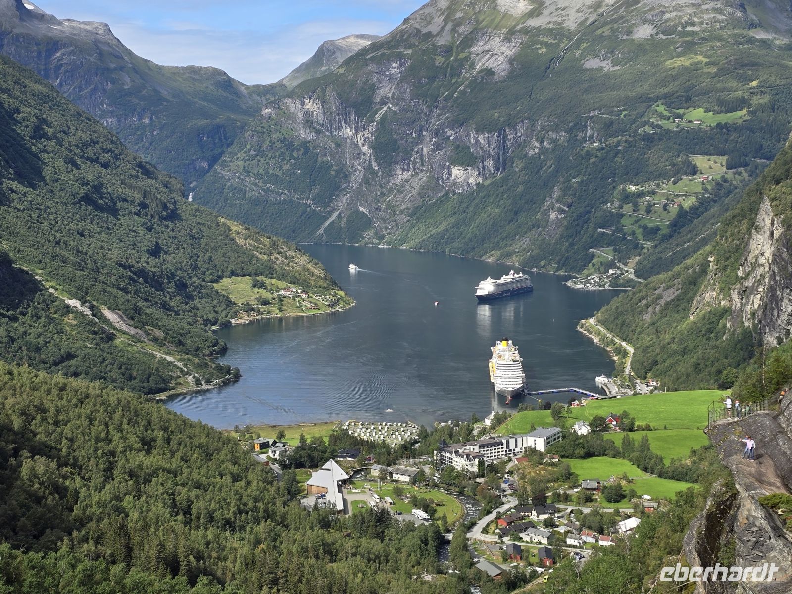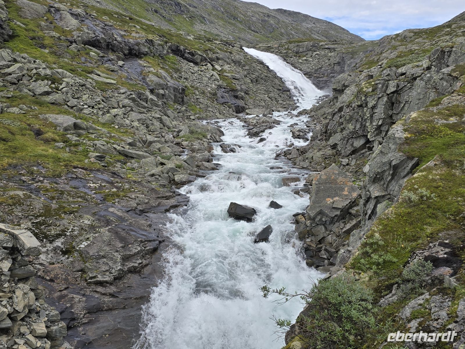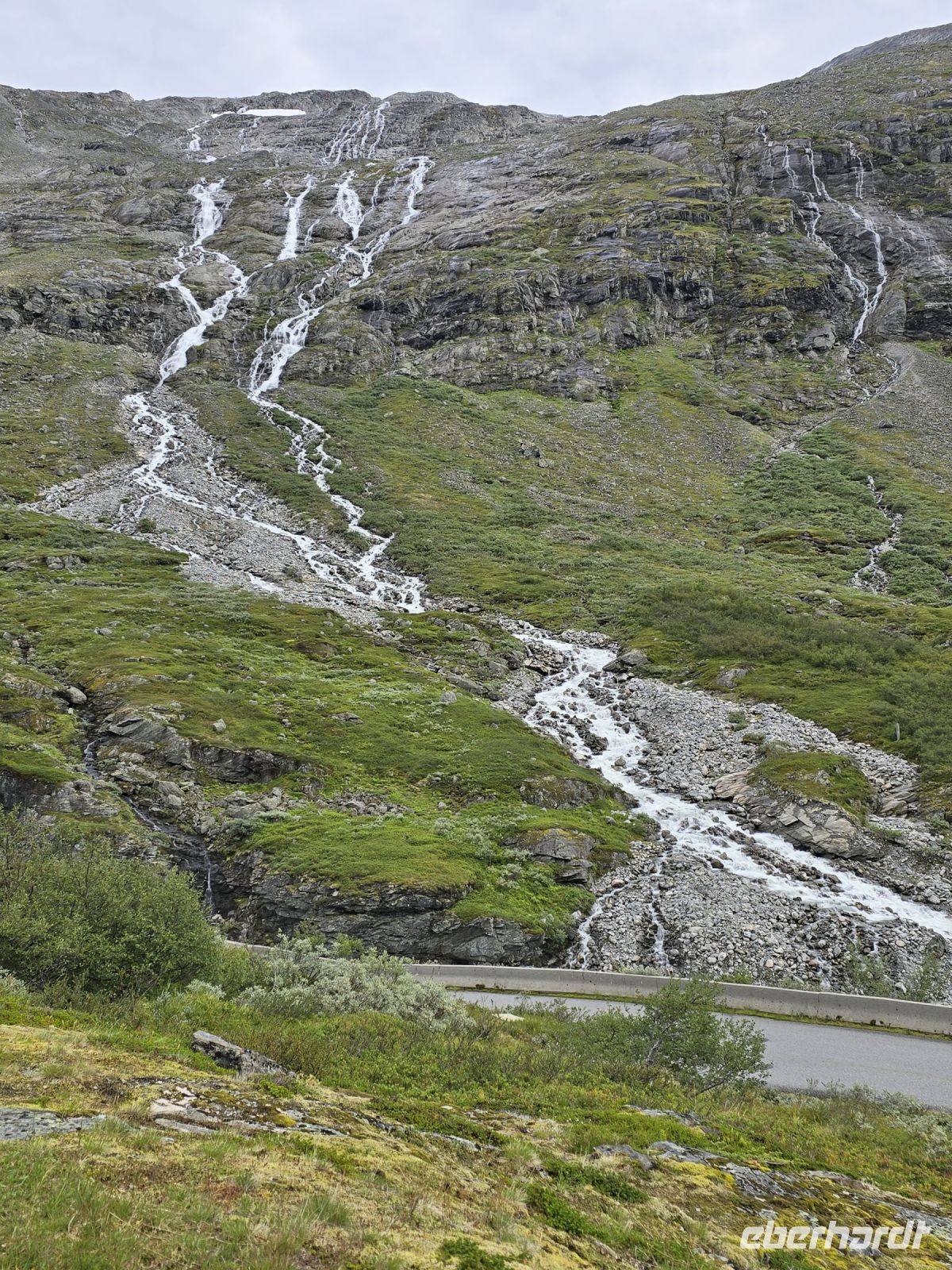 Wir müssen wieder mit der Fähre über den Fjord, von Linge nach Eidsdal setzen wir über. Um die nächste Fähre zu erreichen muss Alex seinen, sonst sehr schonenden Fahrstil ändern, damit wir keine Zeit verliehren. Unser nächstes Ziel ist der Geiranger Fjord, den wir das erste Mal von der Adlerkurve aus betrachten können. Wir sehen das im Fjord 2 große Kreuzfahrtschiffe vor Anker liegen, das ist auch der Grund weshalb die Aussichtsplattformen alle hoffnungslos überfüllt sind. Die Passagiere werden von den Schiffen mit Bussen hoch zu den Aussichtspunkten gefahren und blockieren dabei die Straßen. Der Geiranger Fjord und die Trollstigen zählen zu den bekanntesten Sehenswürdigkeiten Norwegens. Wer aber glaubt nach Besichtigung diese Orte die schönsten Dinge Norwegens gesehen zu haben der irrt gewaltig. Wir freuen uns schon auf die nächste Radtour durch einsame Fjells die wir für diesen Nachmittag schon geplant haben. Am die Dalsnibba Viewpoint gelingt es uns dann doch einen Stopp einzulegen, und in aller Ruhe den weitläufigen Fjord in der Tiefe betrachten zu können. Die Fotos von hier oben, bei dieser herrlichen Sicht, sind schon was Besonderes, das müssen wir zugestehen. Aber dann geht es weiter zu unserem Ausgangspunkt Grotli für unsere heutige Radtour. Auf dem alten Strynefjellsvegen durchqueren wir die Hochebene, nachdem wir uns erst einige Hundert Höhenmeter nach oben radeln mussten. Beidseitig aufsteigende Berge begleiten uns, Wasserfälle die mehrspurig die Felswände herunterschießen, mächtige Gebirgsbäche mit unglaublich viel Wasser und einer enormen Energie bekleiden unsere Tour. Wir genießen diese Radtour außerordentlich, denn endlich einmal ohne Regen und mit freiem Blick, ohne tiefhängende Wolken haben wir die komplette Schönheit des Fjells vor Augen. Am Ende der Tour haben wir noch eine rasante Abfahrt in das Tal vor uns, auf steiler Straße mit vielen Kehren schrauben wir uns nach unten, um an der Landstraße wieder Alex und den Bus zu treffen.
