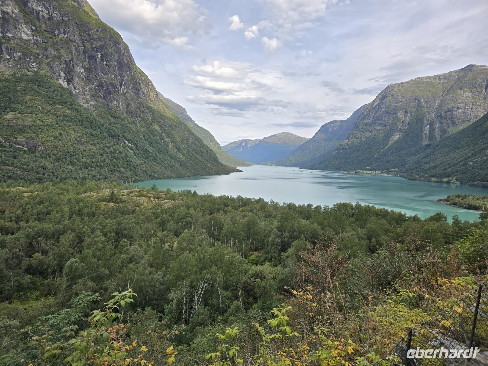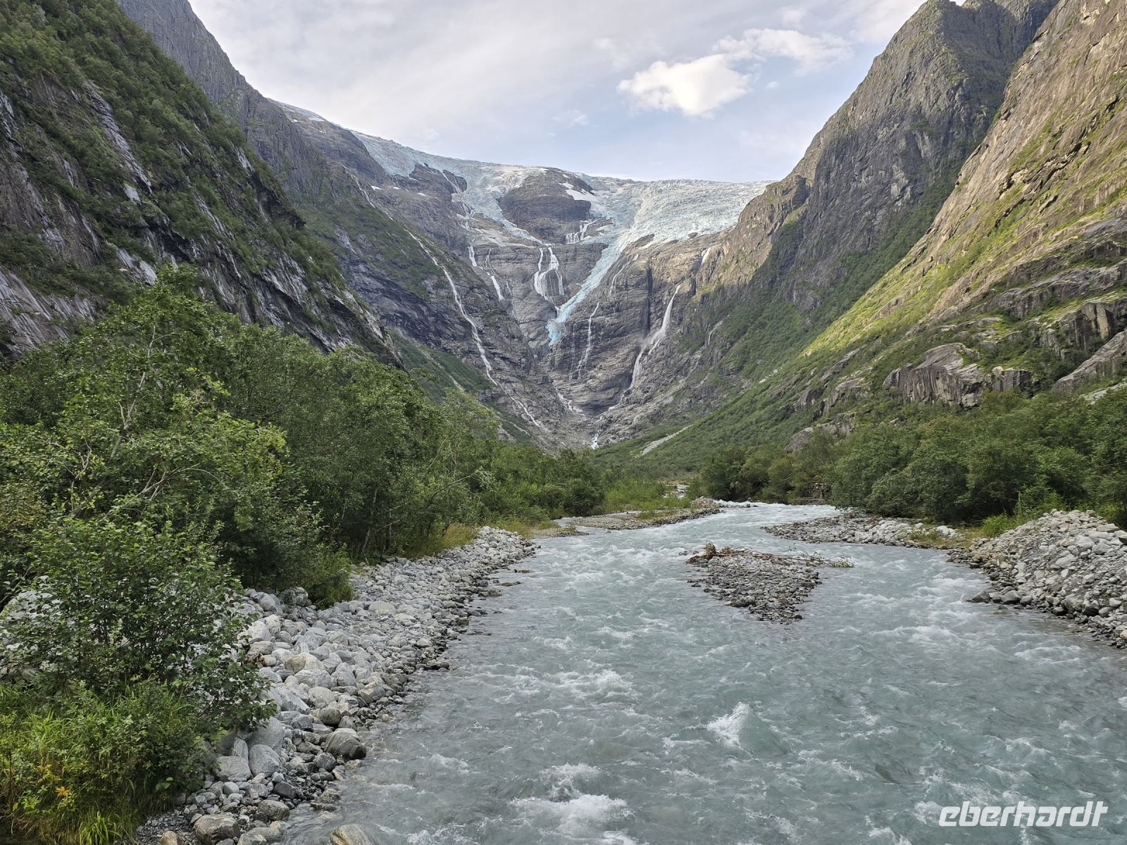 Schon um 08:00 Uhr sitzen wir auf den Rädern und fahren direkt vom Hotel auf Nebenstraßen durch den Ort Loen. Bald erreichen wir den See Lovatnet, der beidseitig mit hohen Bergen eingerahmt ist. Wir können auf einem schmalen Fahrweg den See begleiten, mit ständigem auf und ab direkt der Topologie des Berges folgend. Es ist schön hier am frühen Morgen unterwegs zu sein, wenn andere Ausflügler noch beim Frühstück sitzen. Wir fahren im Schatten des Gebirges und die Sonne strahlt die gegenüberliegenden Berge intensiv an, es sind die Momente wo man denkt mal wieder alles richtig gemacht zu haben. Auf dem schmalen Weg müssen wir vorsichtig einige Kühe umfahren die sich noch schläfrig an dem warmen Asphalt wärmen. Am Ende des Sees kommen wir an dem Ausflugslokal Kjenndalstova vorbei, dass aber zu dieser Tageszeit noch geschlossen hat. Noch einmal kräftig den Berg hoch und wir kommen in das spitz zulaufende Tal und können am nah liegenden Ende den Ausläufer des Gletschers Kjenndalbreen sehen. Die zusammenhängende Gletschermasse erstreckt sich über eine Länge von 70 Kilometern über die links und rechts von uns liegenden Berge hinweg. Wir sehen die Gletscherzunge die sich aus der Gletschermasse nach unten bewegt und das Wasser für den Lovatnet kontinuierlich speist. Wir haben an diesem Punkt den idealen Fotostopp, freie Sicht auf die Eisflächen und links und rechts symmetrisch die Berge aufsteigend. Aber während wir noch die Landschaft begeistert fotografieren spüren wir das plötzlich die Luft unangenehm warm wird, ein heißer Föhn bläst uns entgegen. Ganz entgegen unseren Erwartungen mit Blick auf das Eis ist dieser Temperaturumschwung beängstigend. Ich schaue nochmal auf die Wetter Apps und erkenne, dass sich für 11:00 Uhr Regen ankündigt der wohl mit dem Wetterwechsel zusammenhängt. Nun der Tag hat noch viel zu bieten und vielleicht schaffen wir es ja noch vor dem Regen zurück am Hotel und an unserem Bus zu sein. Wir machen uns also auf den Rückweg. Noch 2..3 Fotostopps um die Wasserfälle festzuhalten, die links von uns die Berg herunter rauschen und das Gletscherwasser ins Tal bringen. Jetzt kommen uns auch die ersten Ausflügler entgegen und wir sind froh, dass wir dieses Tal am frühen Morgen alleine für uns besuchen konnten. Wir schaffen es tatsächlich bis 11:00 Uhr am Hotel zurück zu sein und auch pünktlich wie vorhergesagt fallen die ersten Regentropfen. Schnell die Räder wegpacken, nochmal das Hotel nützen und dann setzen wir unsere Reise schon fort.