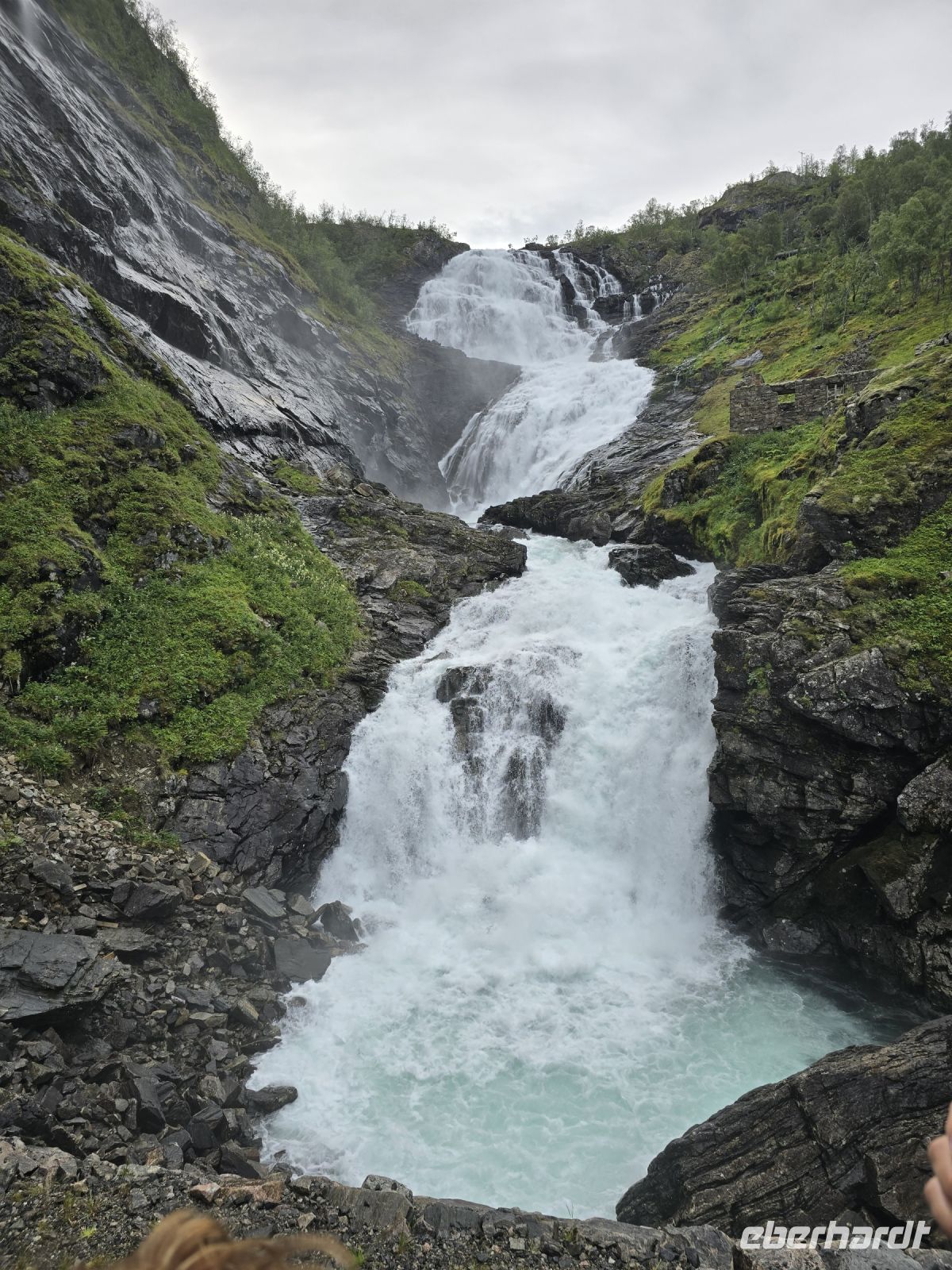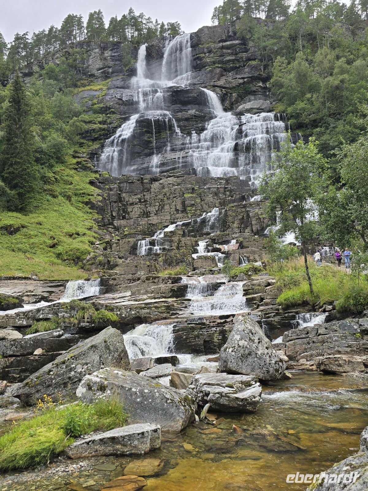 Übernachten wollen wir an diesen Tag im Scandi Hotel in Voss. Einen kurzen Stopp machen wir noch bei dem imposanten Wasserfall Tvindefossen, der sehr einladend am Straßenrand tosend mit breitem Wasserlauf die Felsen umspült.