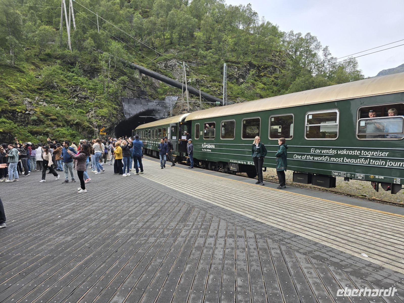 Das Skandic Hotel befindet sich in unmittelbarer Nähe des Bahnhofs. Und von dort brechen wir zu unseren unterschiedlichen Aktivitäten auf. Eine kleinere Gruppe, begleitet von Dieter, fährt mit dem Zug hoch in das Bergdorf Finse, auf circa 1200 Höhenmeter, und mietet sich dort Mountain Bikes für eine Abfahrt über den Rallervegen. Der Rallervegen ist ursprünglich ein Baustellen Zufahrtsweg der während der Bauphase der Flambahn eingerichtet wurde. Die Tour geht über fast 60 Kilometer durch die Berge, immer wieder parallel zum Verlauf der Flambahn, bis dann über viele Serpentinen man hinunterfährt zum Sognefjord zum Ende der Tour in die Ortschaft Flam.